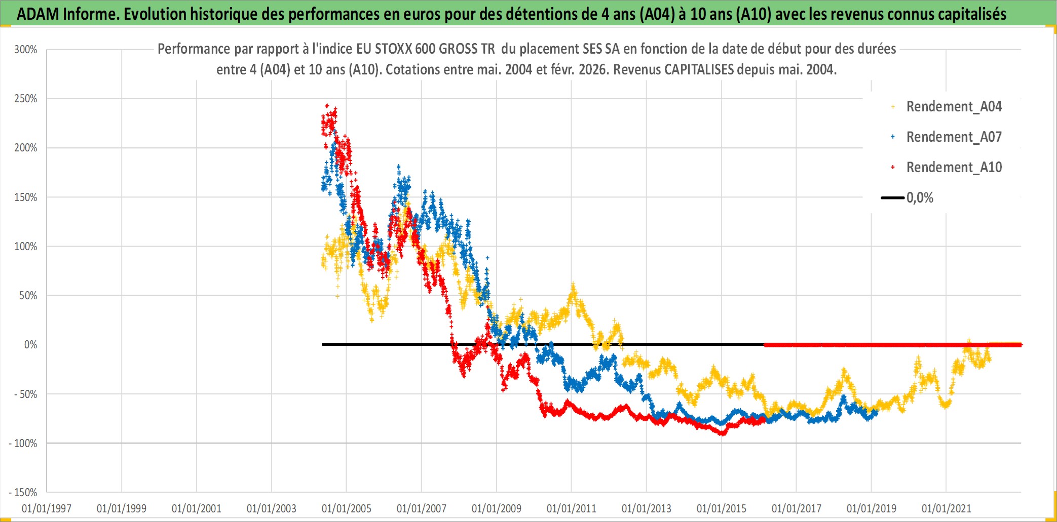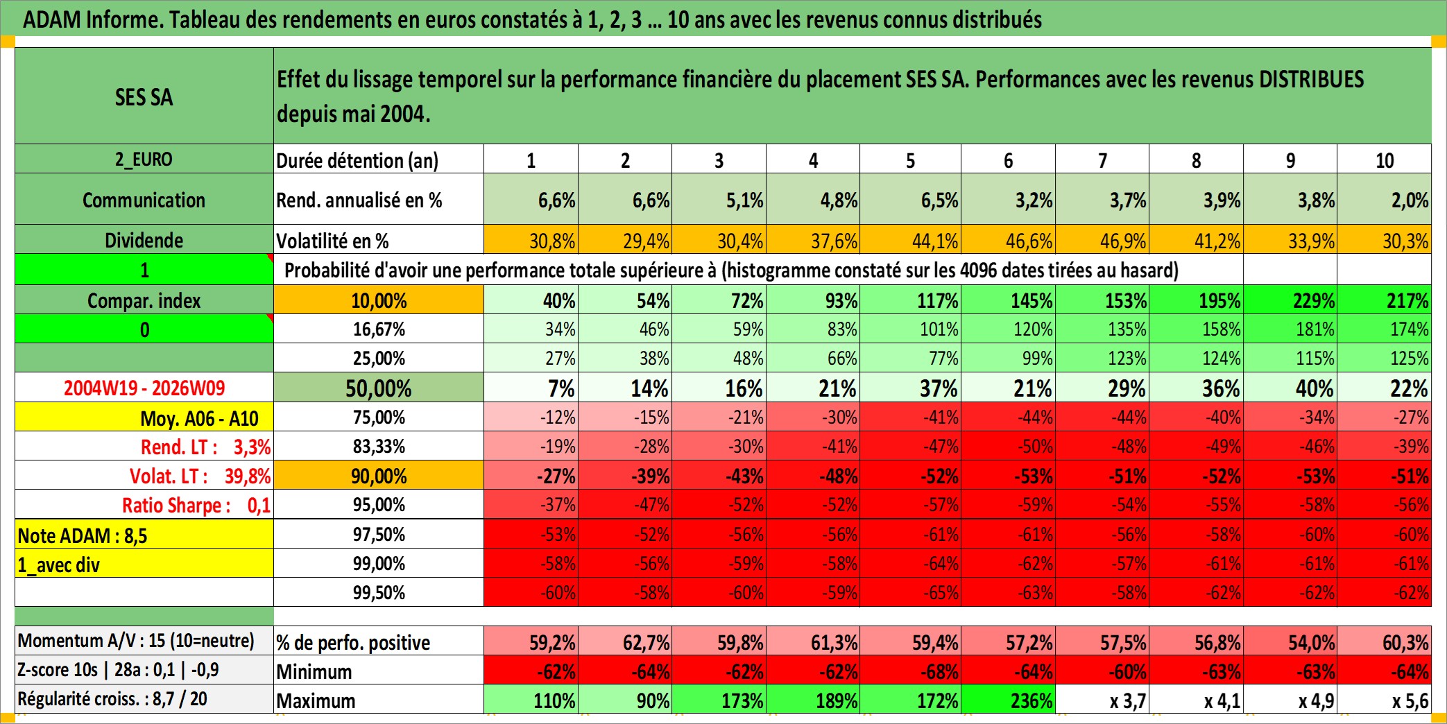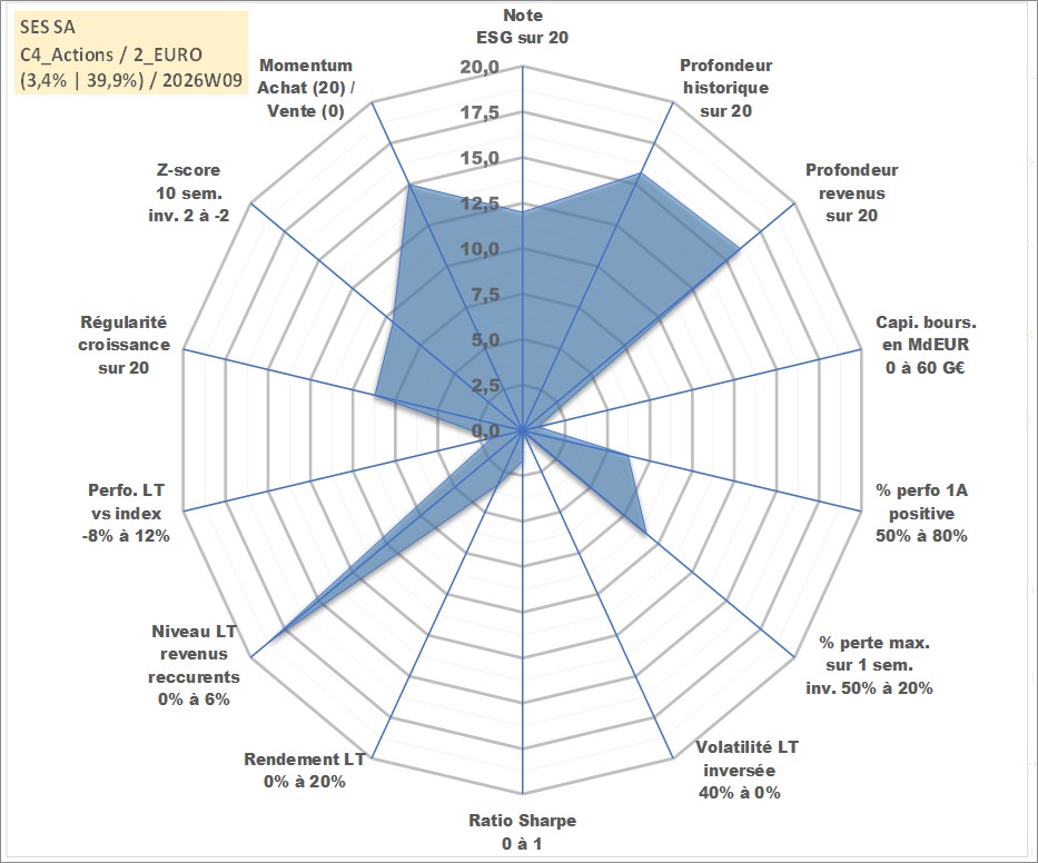 Site dédié aux investisseursPage dédiée sur site financeAnalyse des valorisations hebdomadaires de l'action SES SA. Cet actif est cote en EUR. Les valorisations couvrent les semaines 2004W19 a 2026W09. Les revenus de cet actif financier sont pris en compte depuis la semaine 2004W21. La note globale ESG de cet actif est estimee a 12.0 (apres rebasage entre 0 et 20).