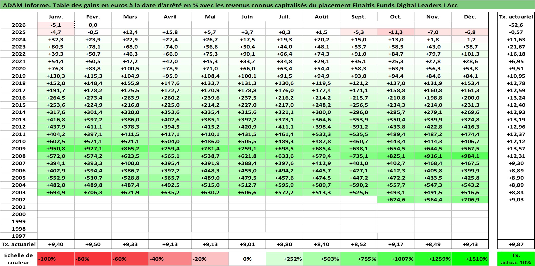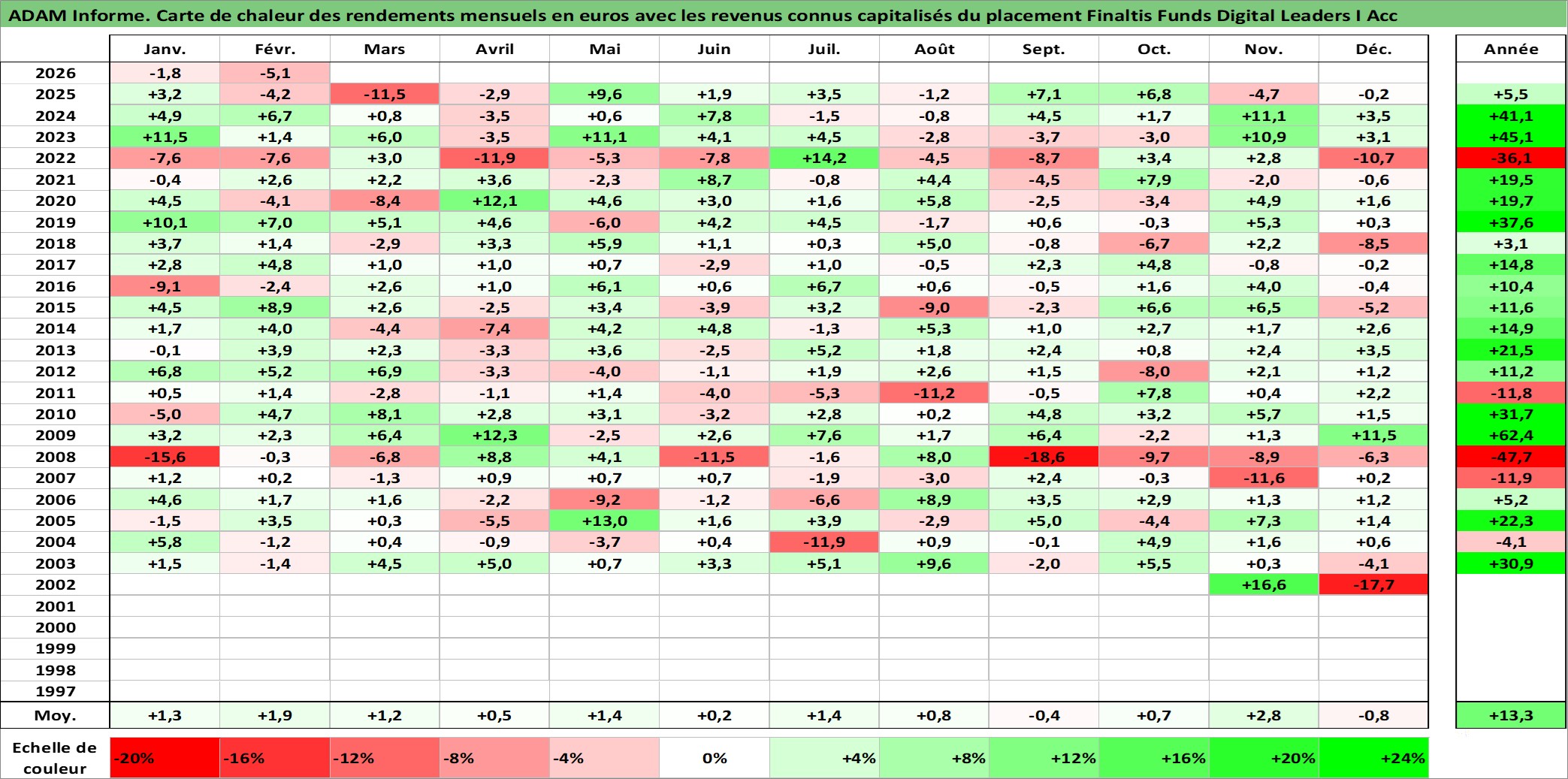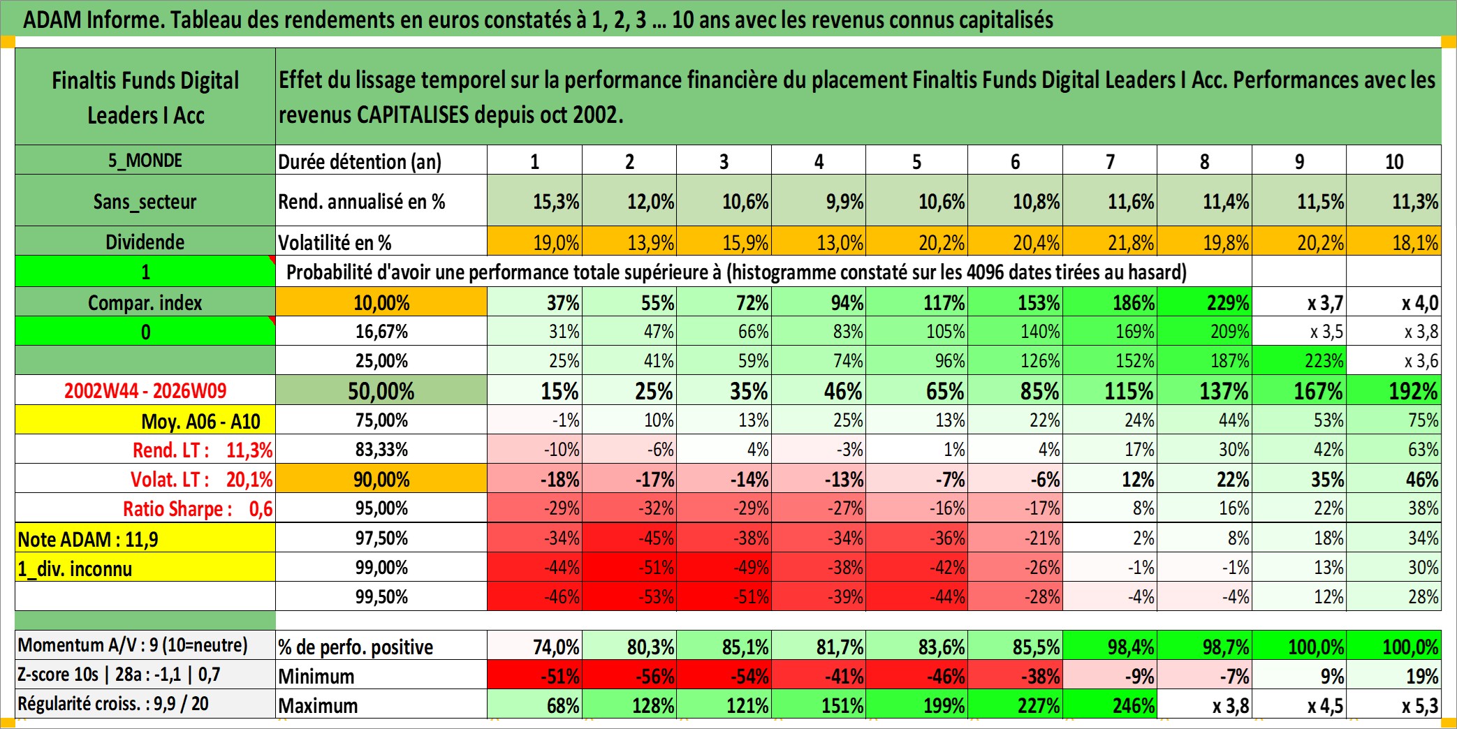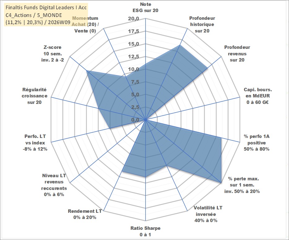 Site dédié aux investisseursPage dédiée sur site financeAnalyse des valorisations hebdomadaires du fonds Finaltis Funds Digital Leaders I Acc. Cet actif est cote en EUR. Les valorisations couvrent les semaines 2002W44 a 2026W09. Les revenus de cet actif financier sont pris en compte depuis la semaine 2002W44. La note globale ESG de cet actif est estimee a 11.0 (apres rebasage entre 0 et 20).