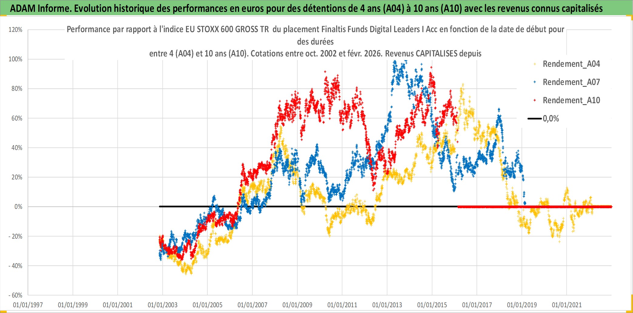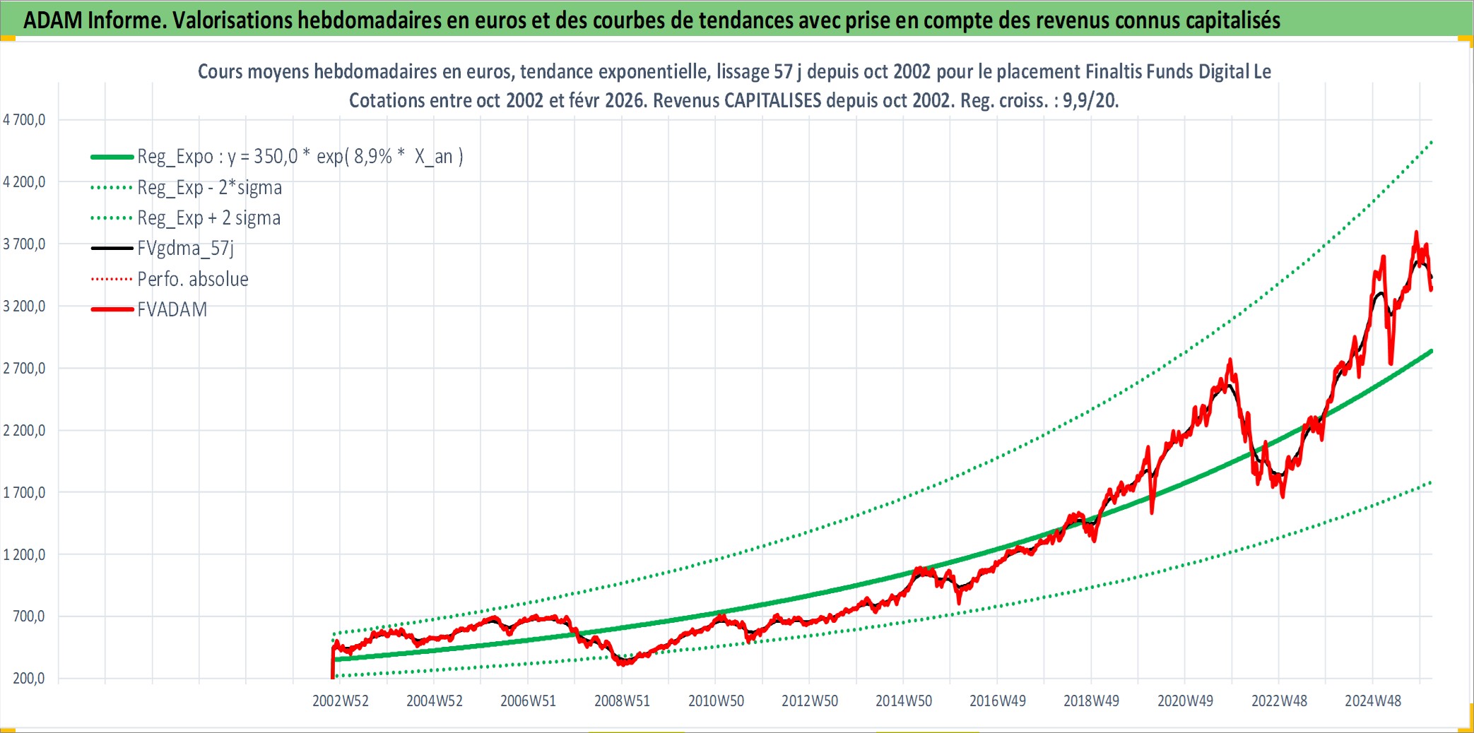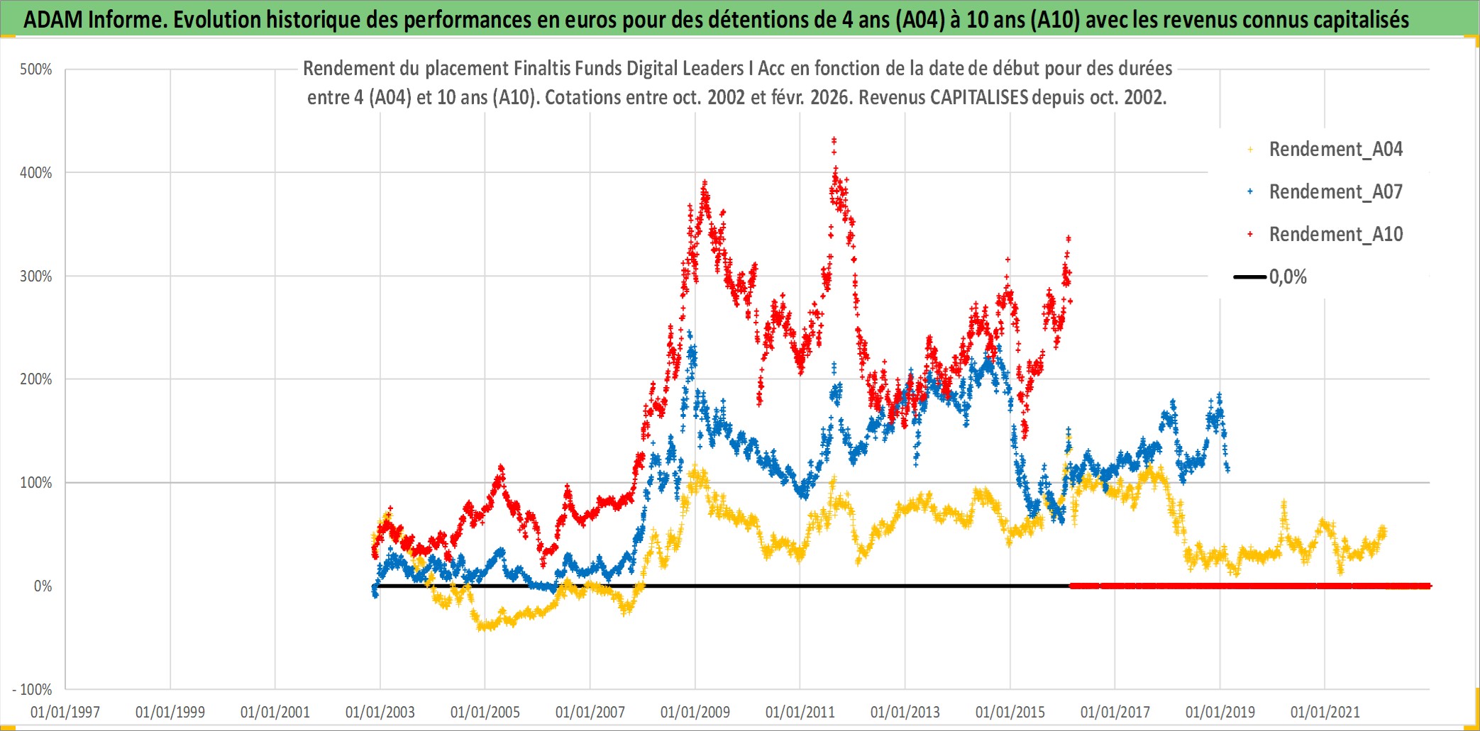 Site dédié aux investisseursPage dédiée sur site financeAnalyse des valorisations hebdomadaires du fonds Finaltis Funds Digital Leaders I Acc. Cet actif est cote en EUR. Les valorisations couvrent les semaines 2002W44 a 2026W09. Les revenus de cet actif financier sont pris en compte depuis la semaine 2002W44. La note globale ESG de cet actif est estimee a 11.0 (apres rebasage entre 0 et 20).