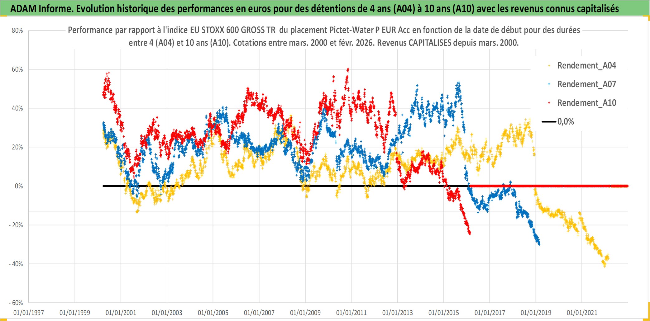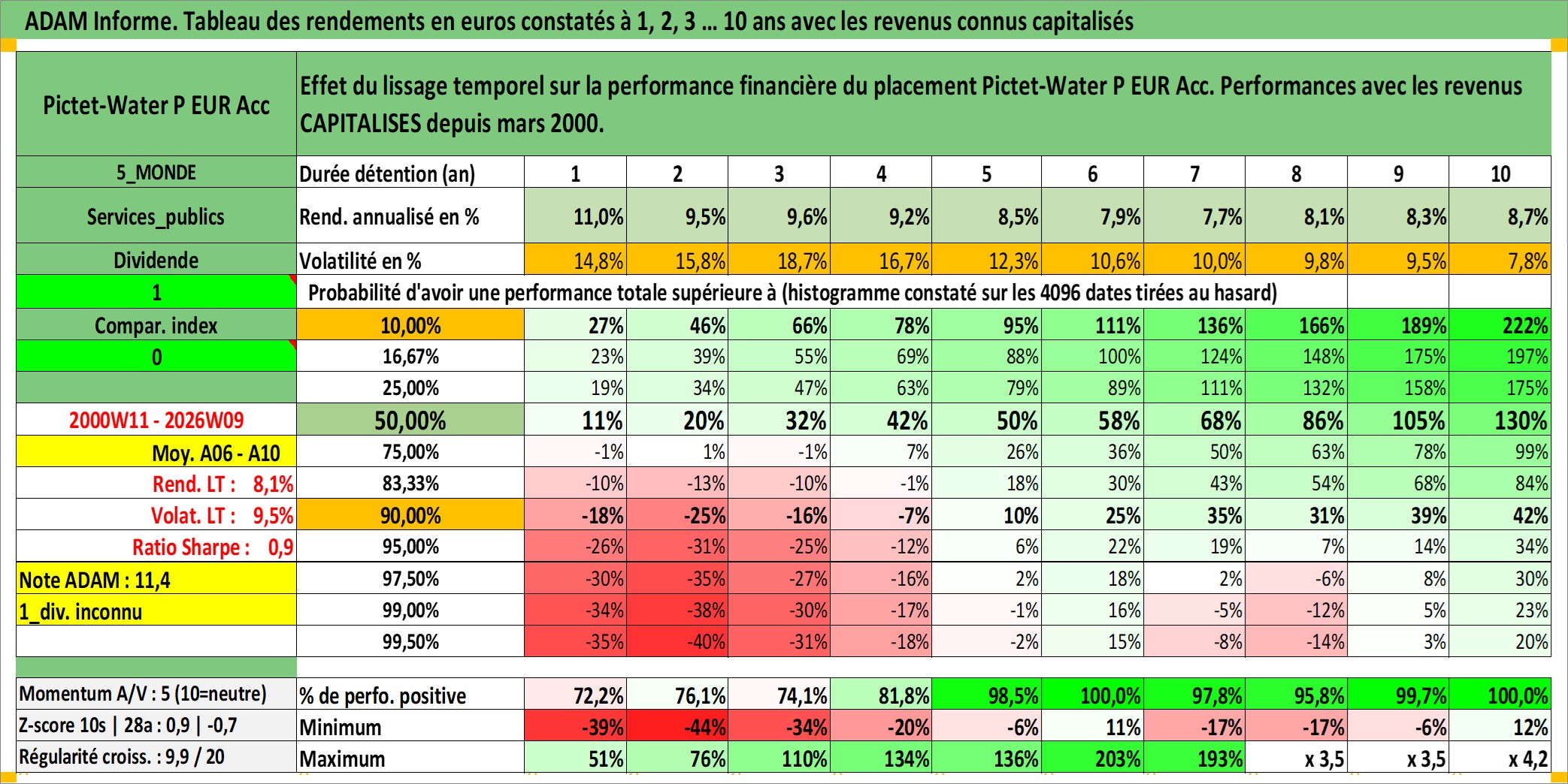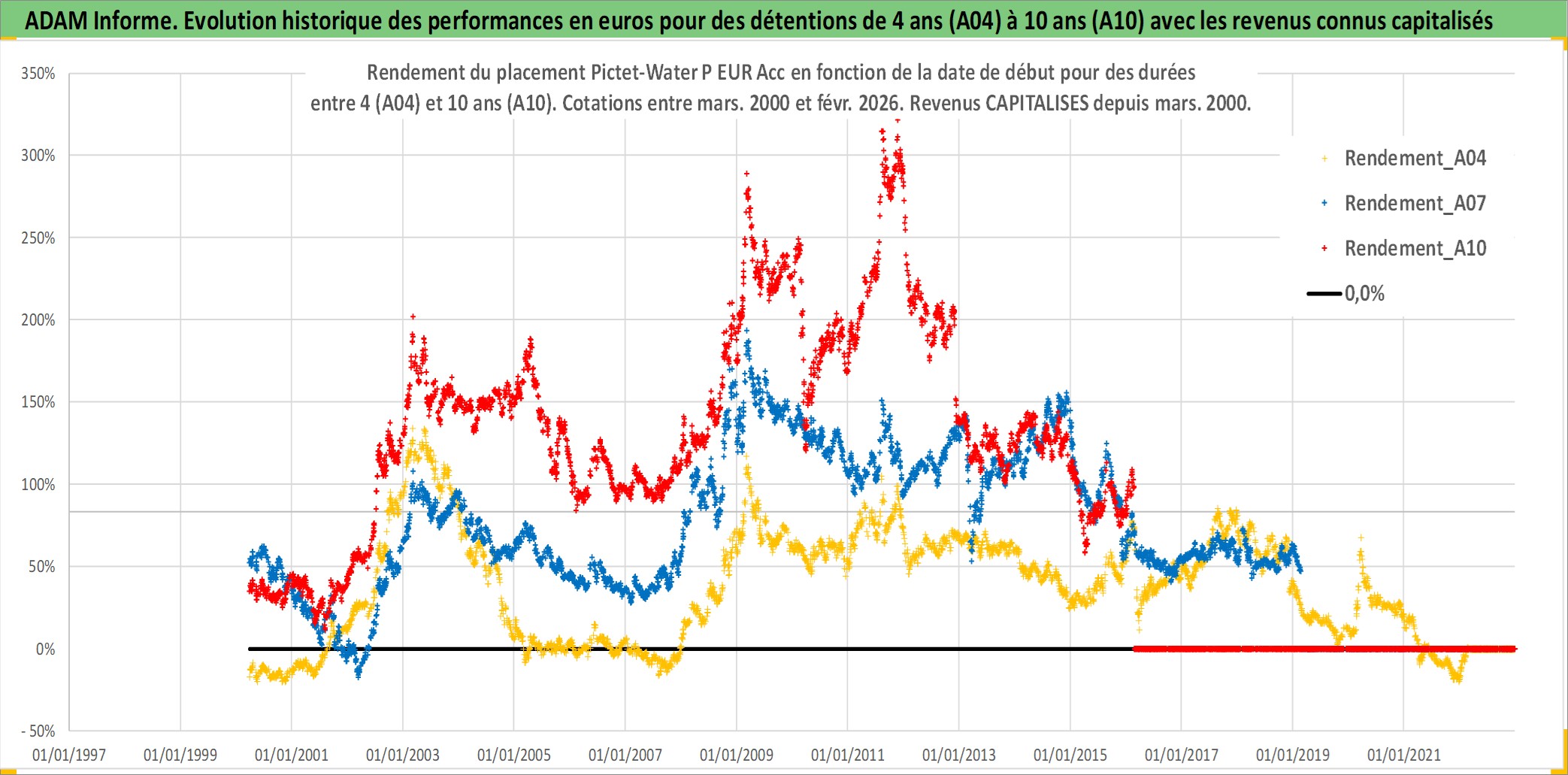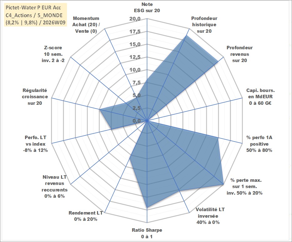 Site dédié aux investisseursPage dédiée sur site financeAnalyse des valorisations hebdomadaires du fonds Pictet-Water P EUR Acc. Cet actif est cote en EUR. Les valorisations couvrent les semaines 2000W11 a 2026W09. Les revenus de cet actif financier sont pris en compte depuis la semaine 2000W11. La note globale ESG de cet actif est estimee a 8.0 (apres rebasage entre 0 et 20).