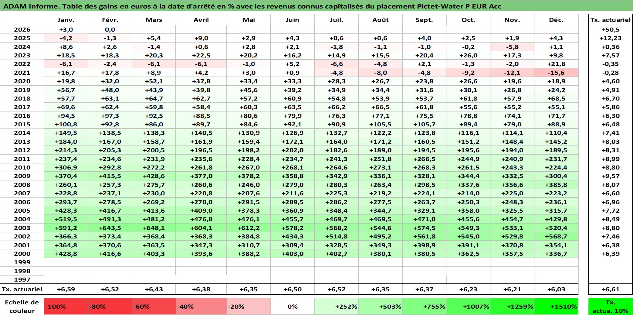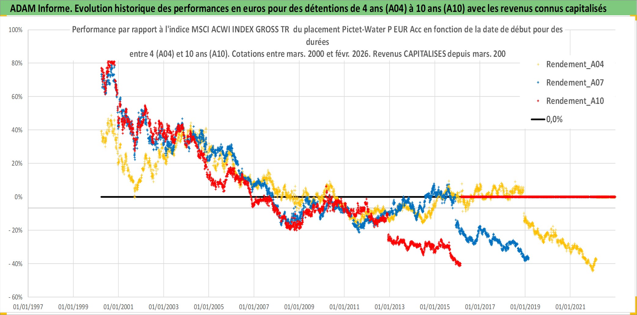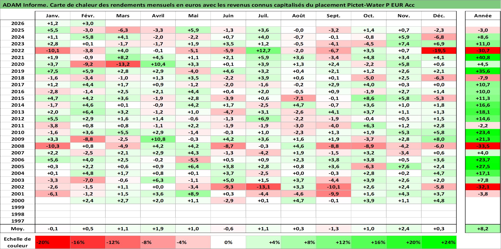 Site dédié aux investisseursPage dédiée sur site financeAnalyse des valorisations hebdomadaires du fonds Pictet-Water P EUR Acc. Cet actif est cote en EUR. Les valorisations couvrent les semaines 2000W11 a 2026W09. Les revenus de cet actif financier sont pris en compte depuis la semaine 2000W11. La note globale ESG de cet actif est estimee a 8.0 (apres rebasage entre 0 et 20).
