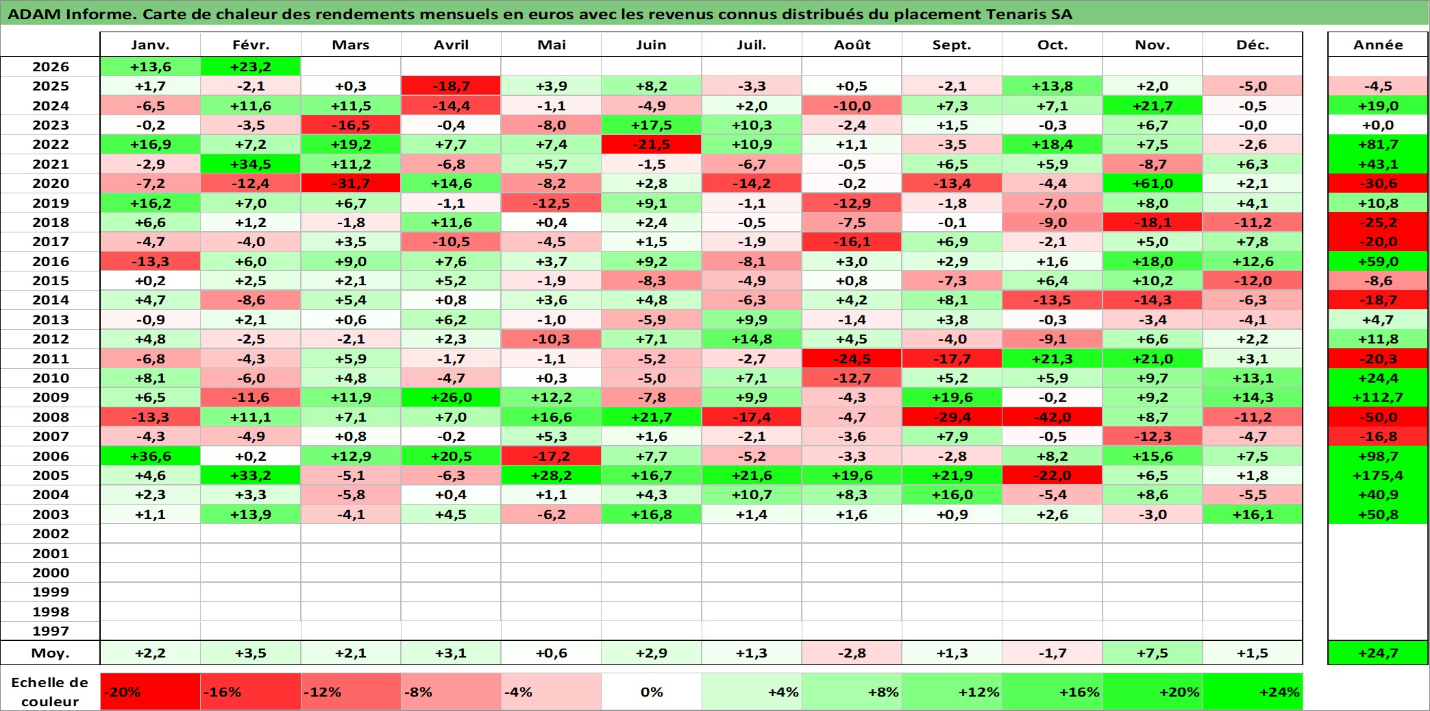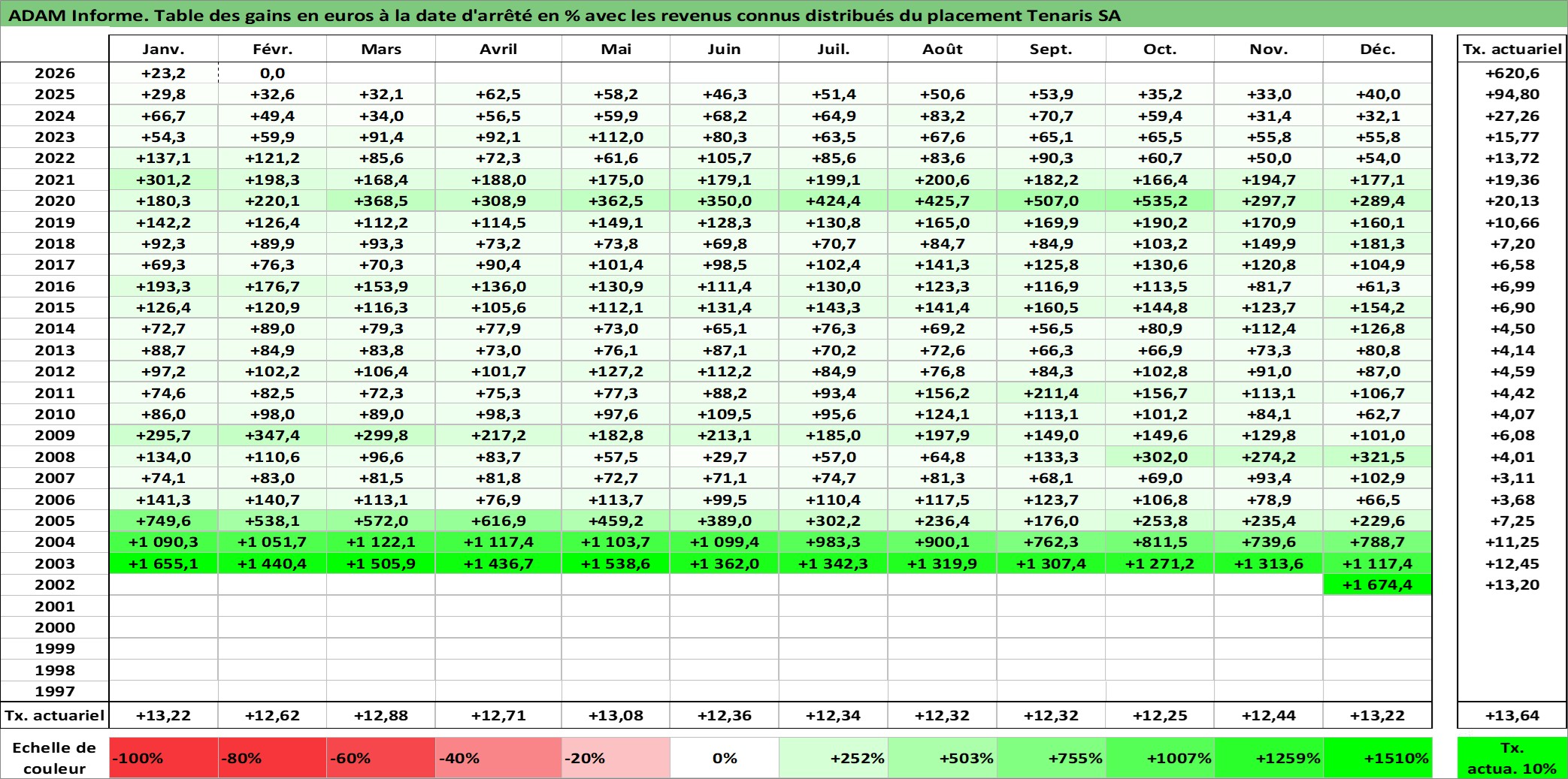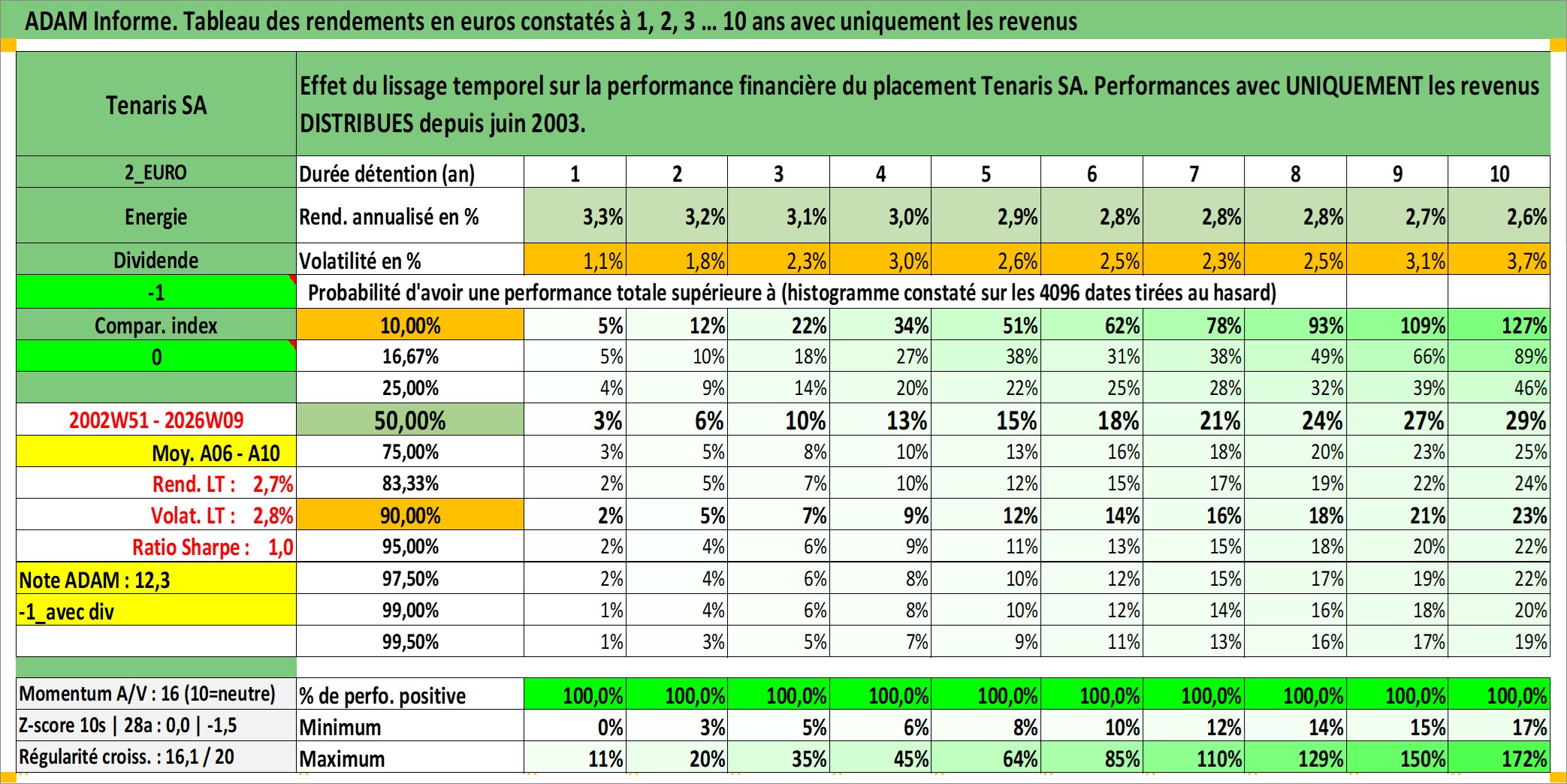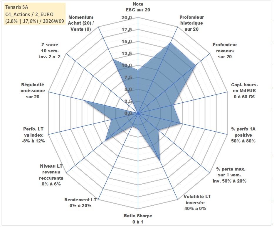 Site dédié aux investisseursPage dédiée sur site financeAnalyse des valorisations hebdomadaires de l'action Tenaris SA. Cet actif est cote en EUR. Les valorisations couvrent les semaines 2002W51 a 2026W09. Les revenus de cet actif financier sont pris en compte depuis la semaine 2003W25. La note globale ESG de cet actif est estimee a 9.0 (apres rebasage entre 0 et 20).