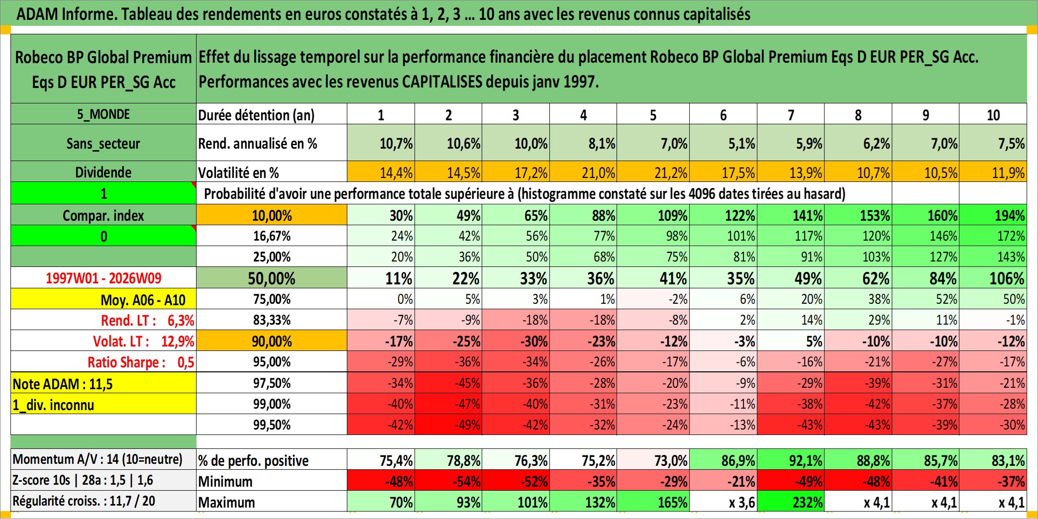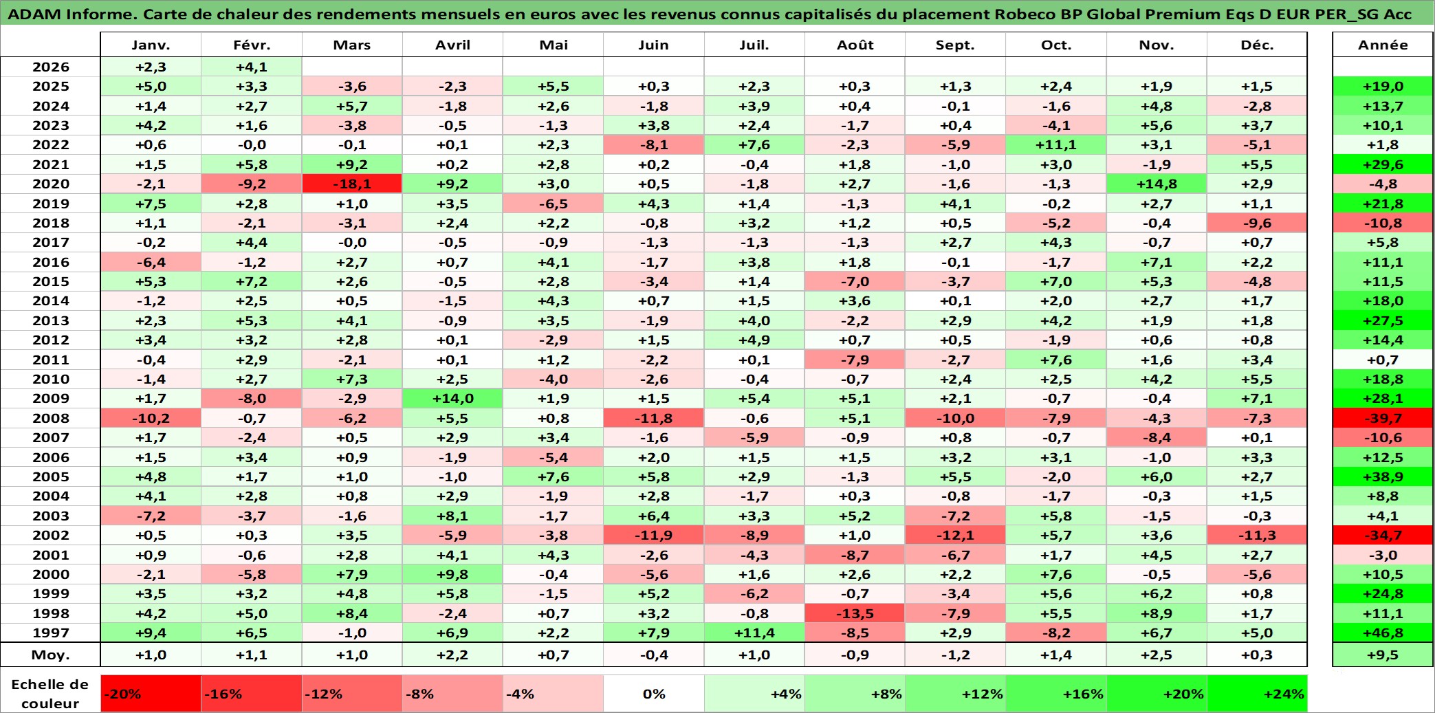 Site dédié aux investisseursPage dédiée sur site financeAnalyse des valorisations hebdomadaires du fonds Robeco BP Global Premium Eqs D EUR PER_SG Acc. Cet actif est cote en EUR. Les valorisations couvrent les semaines 1997W01 a 2026W09. Les revenus de cet actif financier sont pris en compte depuis la semaine 1997W01. La note globale ESG de cet actif est estimee a 8.0 (apres rebasage entre 0 et 20).
