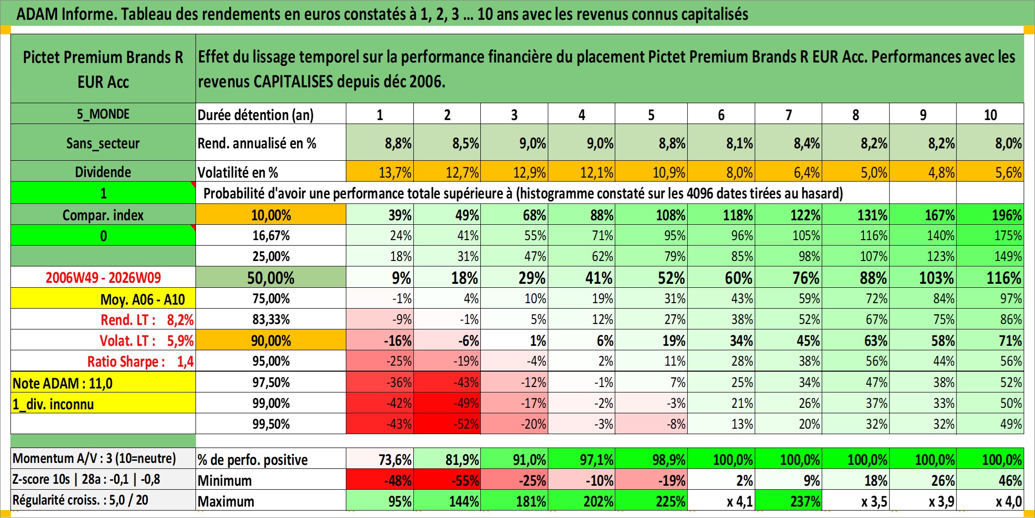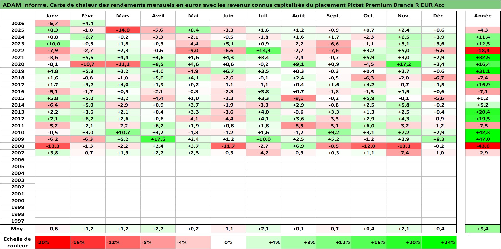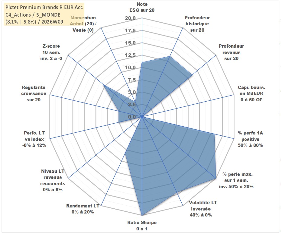 Site dédié aux investisseursPage dédiée sur site financeAnalyse des valorisations hebdomadaires du fonds Pictet Premium Brands R EUR Acc. Cet actif est cote en EUR. Les valorisations couvrent les semaines 2006W49 a 2026W09. Les revenus de cet actif financier sont pris en compte depuis la semaine 2006W49. La note globale ESG de cet actif est estimee a 11.0 (apres rebasage entre 0 et 20).