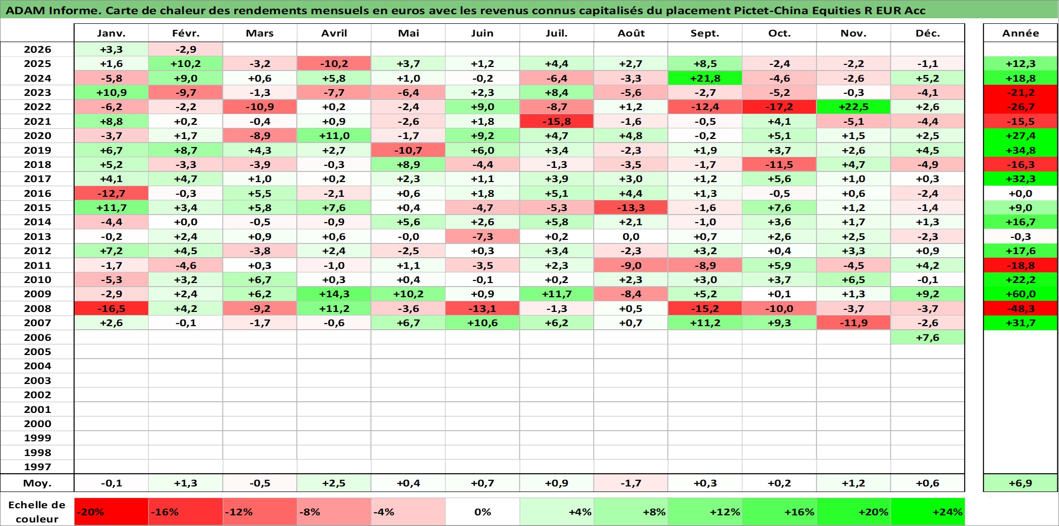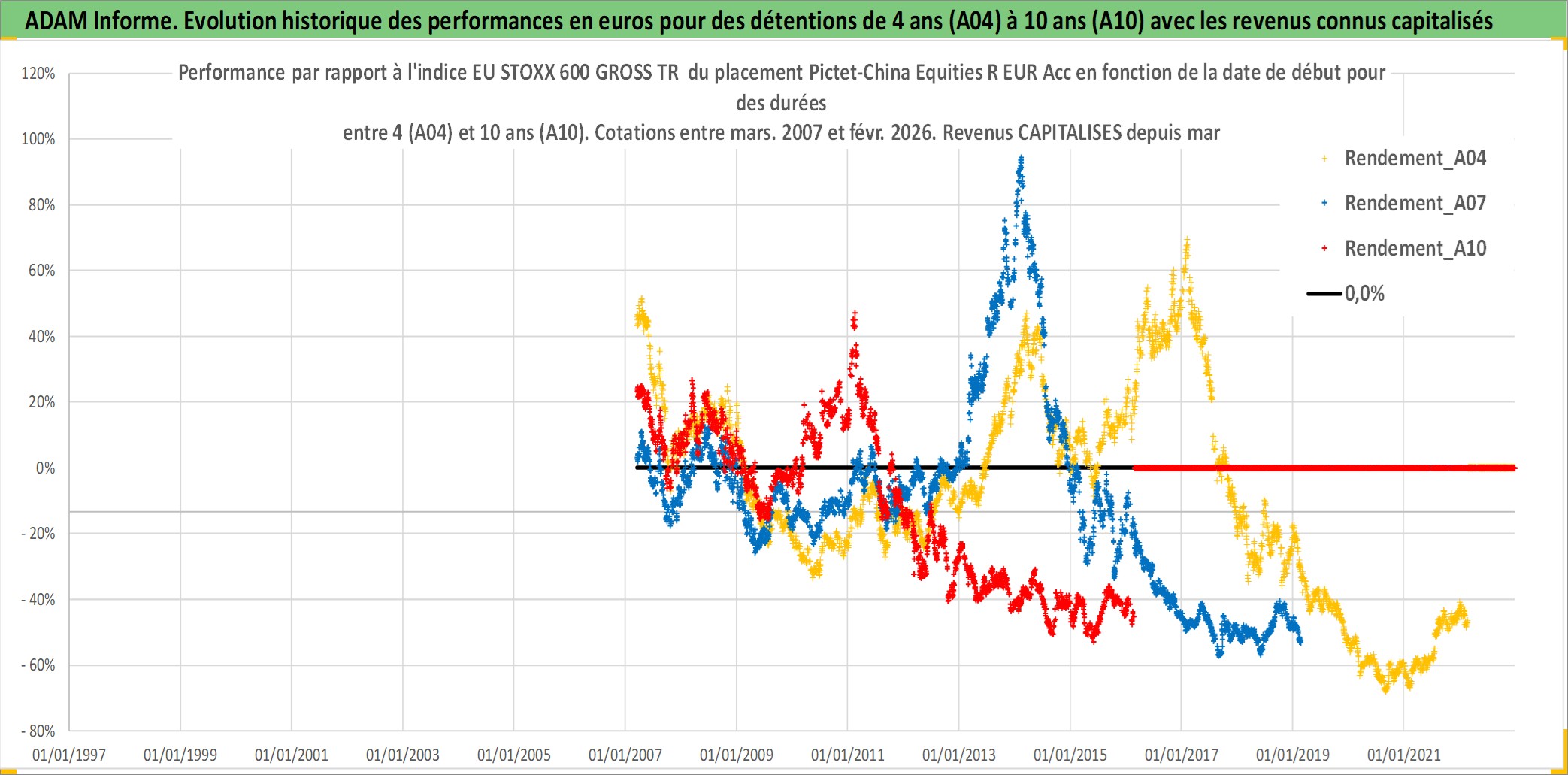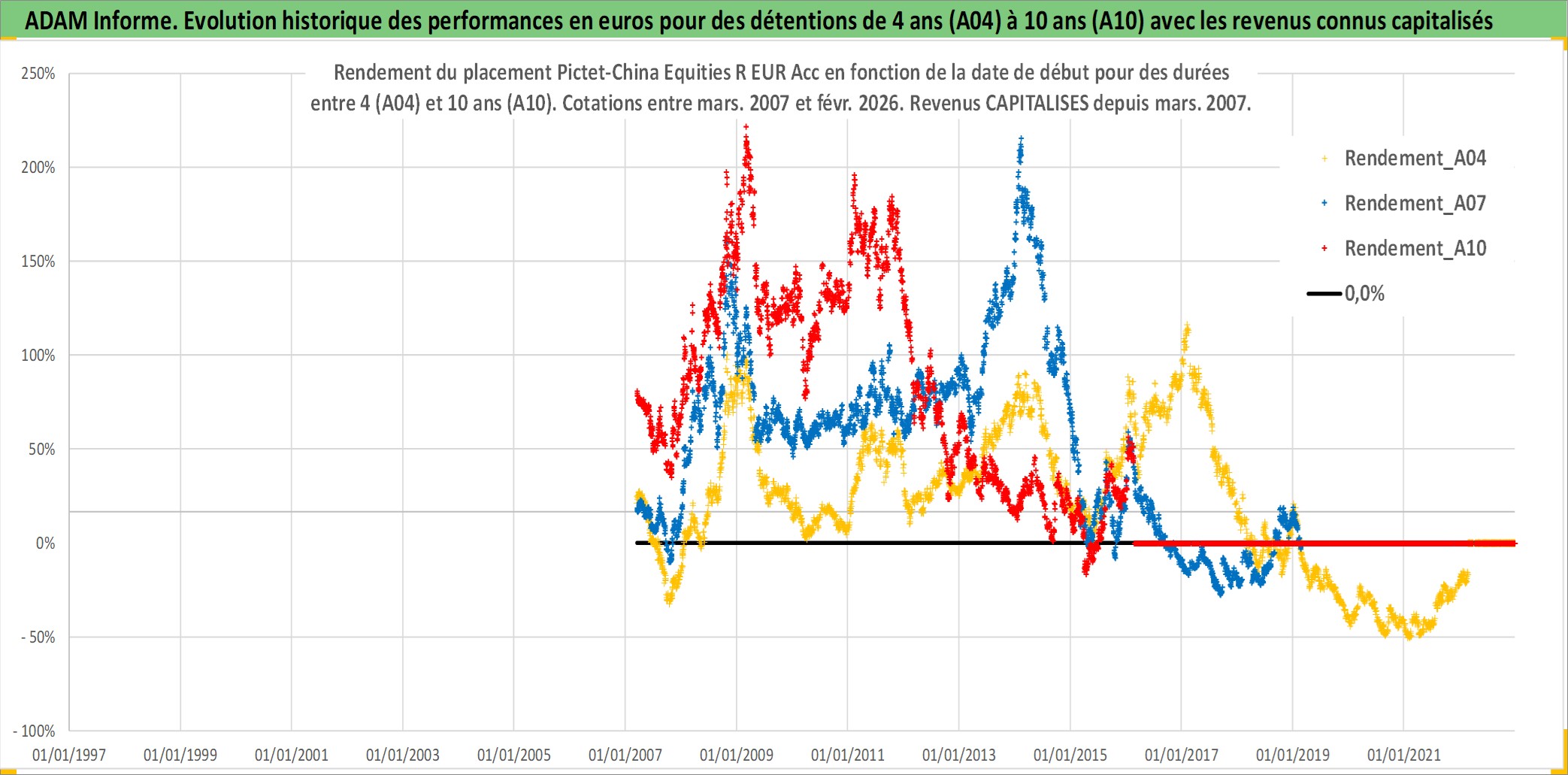 Site dédié aux investisseursPage dédiée sur site financeAnalyse des valorisations hebdomadaires du fonds Pictet-China Equities R EUR Acc. Cet actif est cote en EUR. Les valorisations couvrent les semaines 2007W10 a 2026W09. Les revenus de cet actif financier sont pris en compte depuis la semaine 2007W10. La note globale ESG de cet actif est estimee a 8.0 (apres rebasage entre 0 et 20).