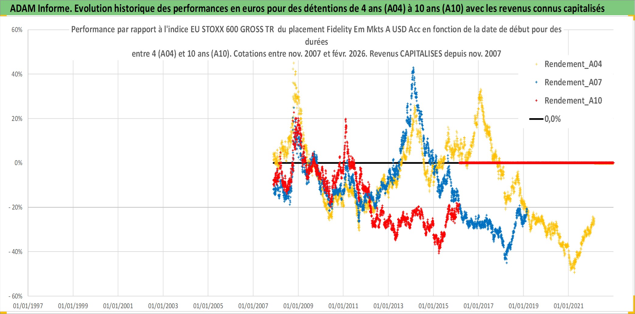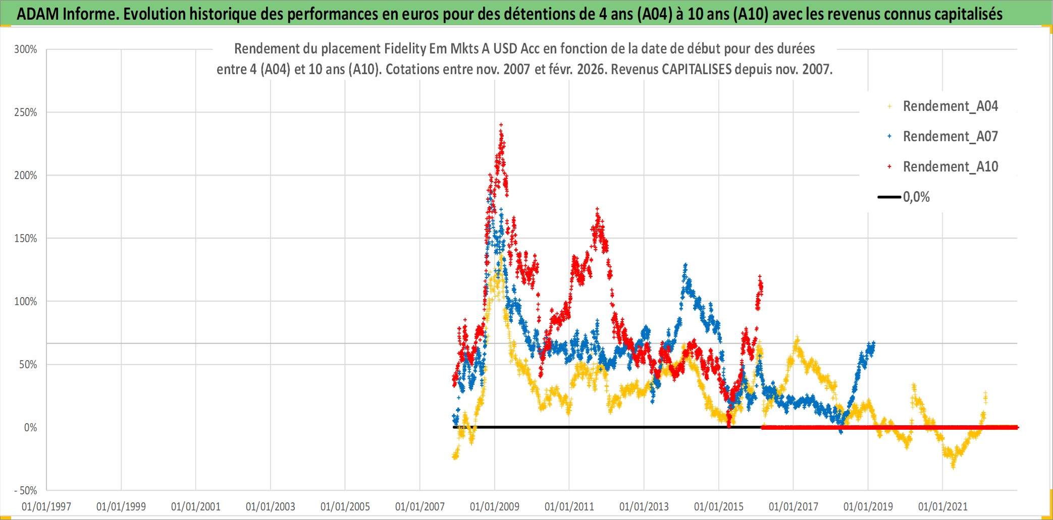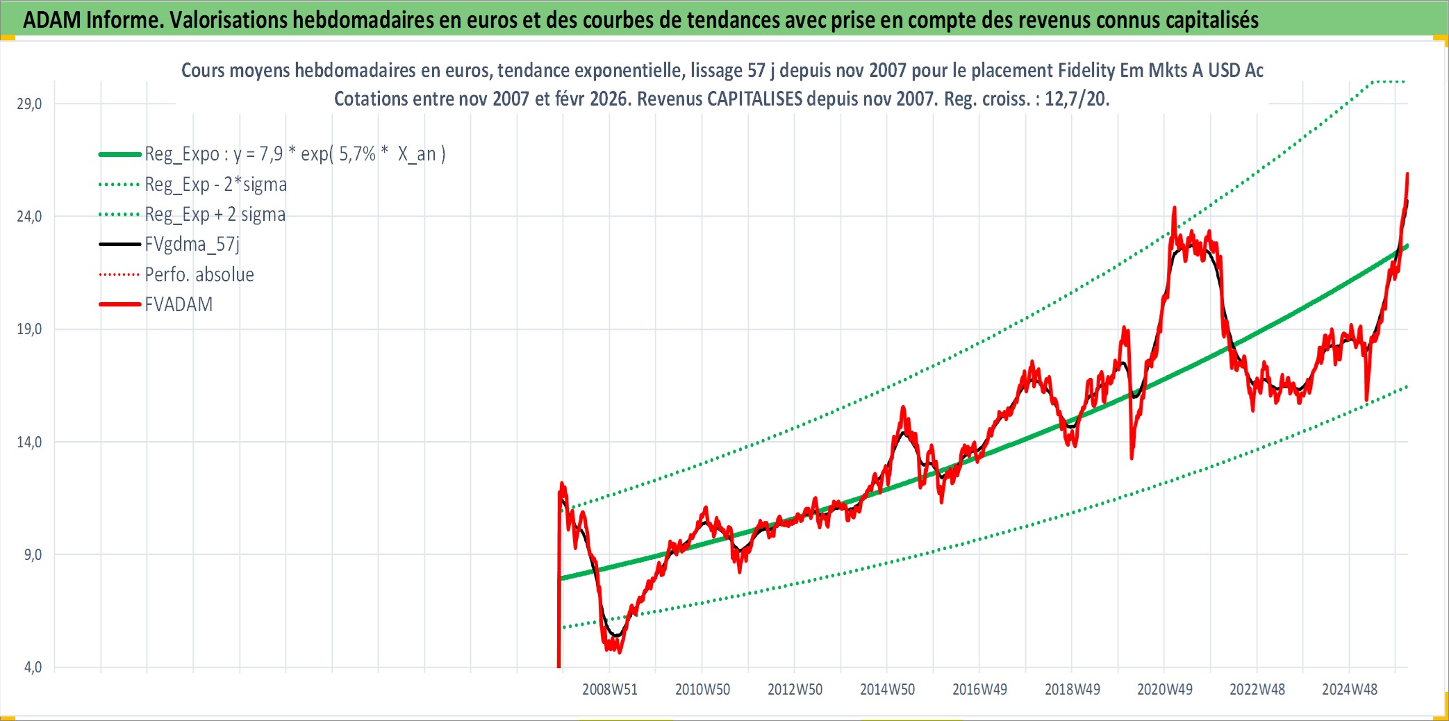 Site dédié aux investisseursPage dédiée sur site financeAnalyse des valorisations hebdomadaires du fonds Fidelity Em Mkts A USD Acc. Cet actif est cote en USD. Les valorisations sont en contrevaleur EURO et couvrent les semaines 2007W46 a 2026W09. Les revenus de cet actif financier sont pris en compte depuis la semaine 2007W46. La note globale ESG de cet actif est estimee a 8.0 (apres rebasage entre 0 et 20).