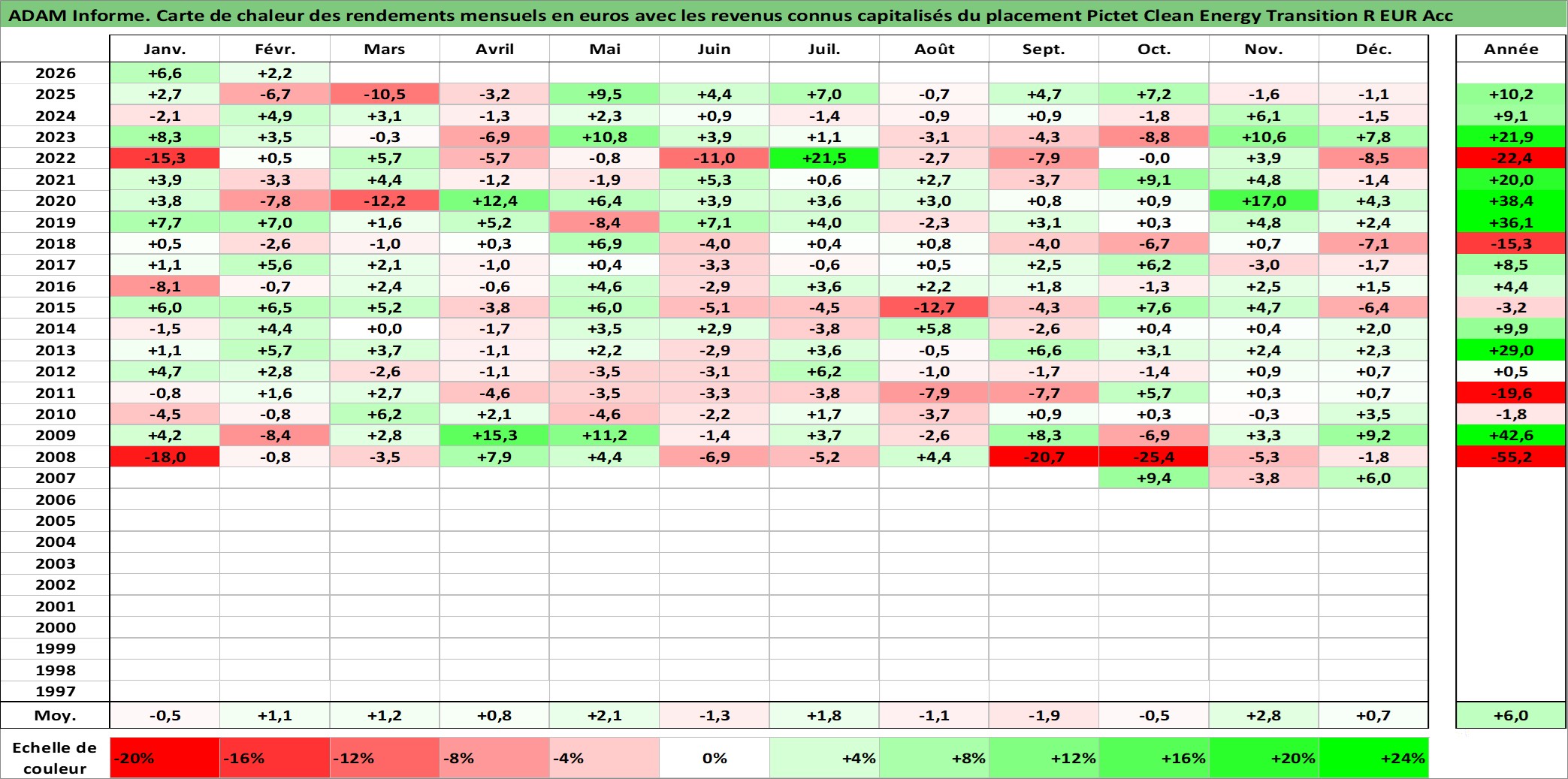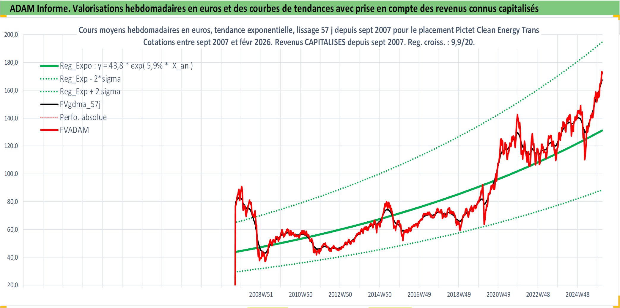 Site dédié aux investisseursPage dédiée sur site financeAnalyse des valorisations hebdomadaires du fonds Pictet Clean Energy Transition R EUR Acc. Cet actif est cote en EUR. Les valorisations couvrent les semaines 2007W36 a 2026W09. Les revenus de cet actif financier sont pris en compte depuis la semaine 2007W36. La note globale ESG de cet actif est estimee a 8.0 (apres rebasage entre 0 et 20).