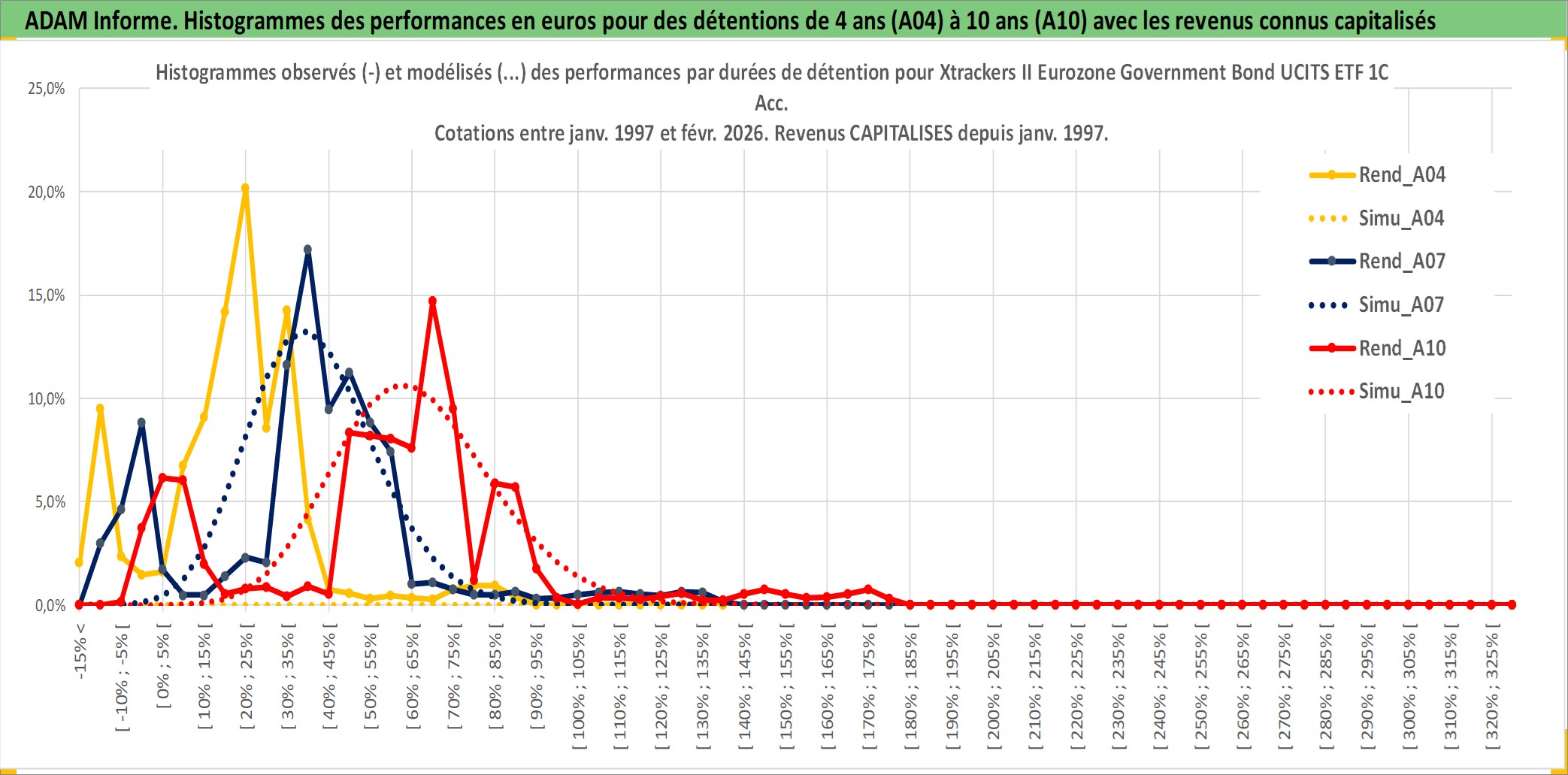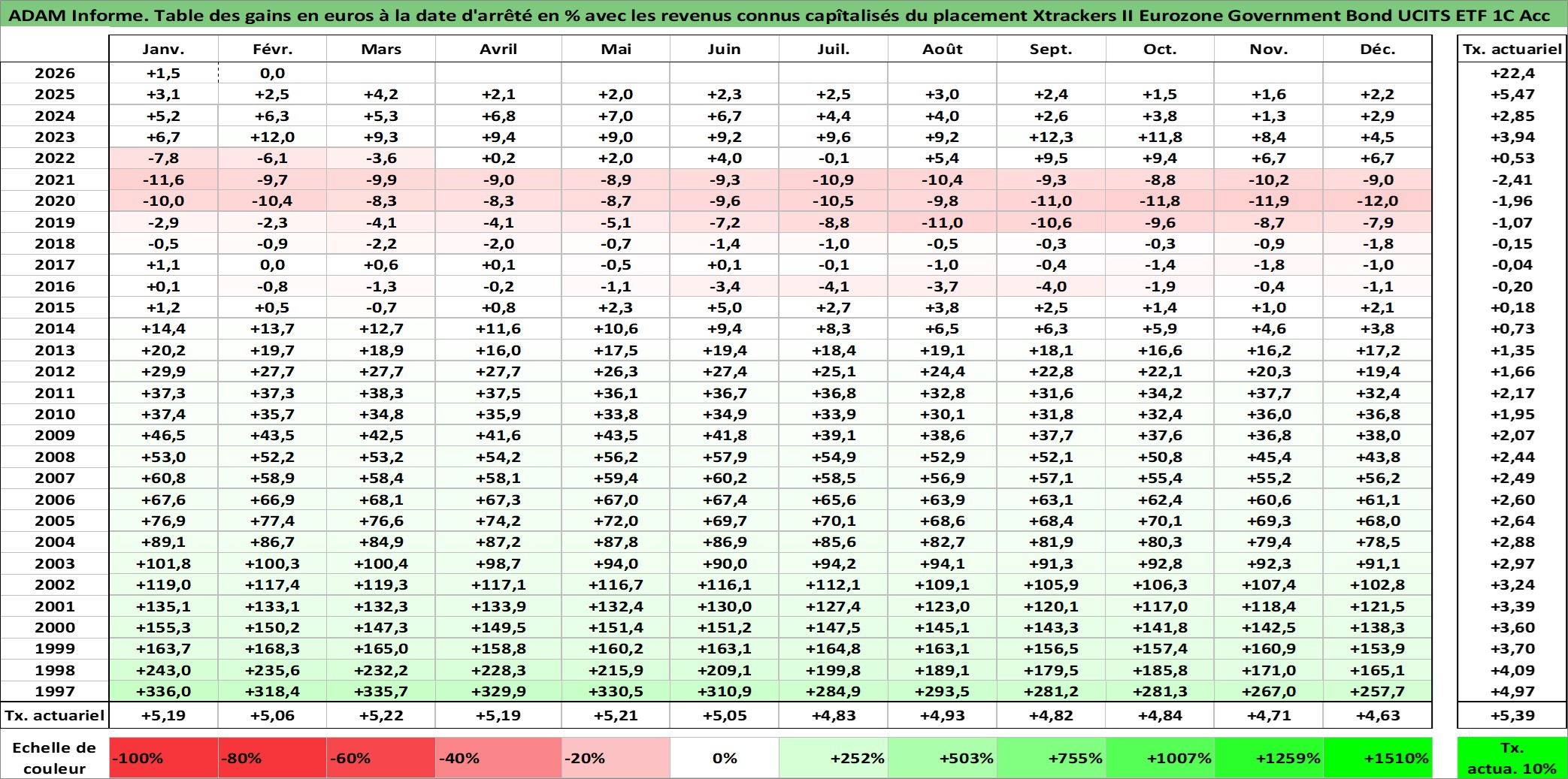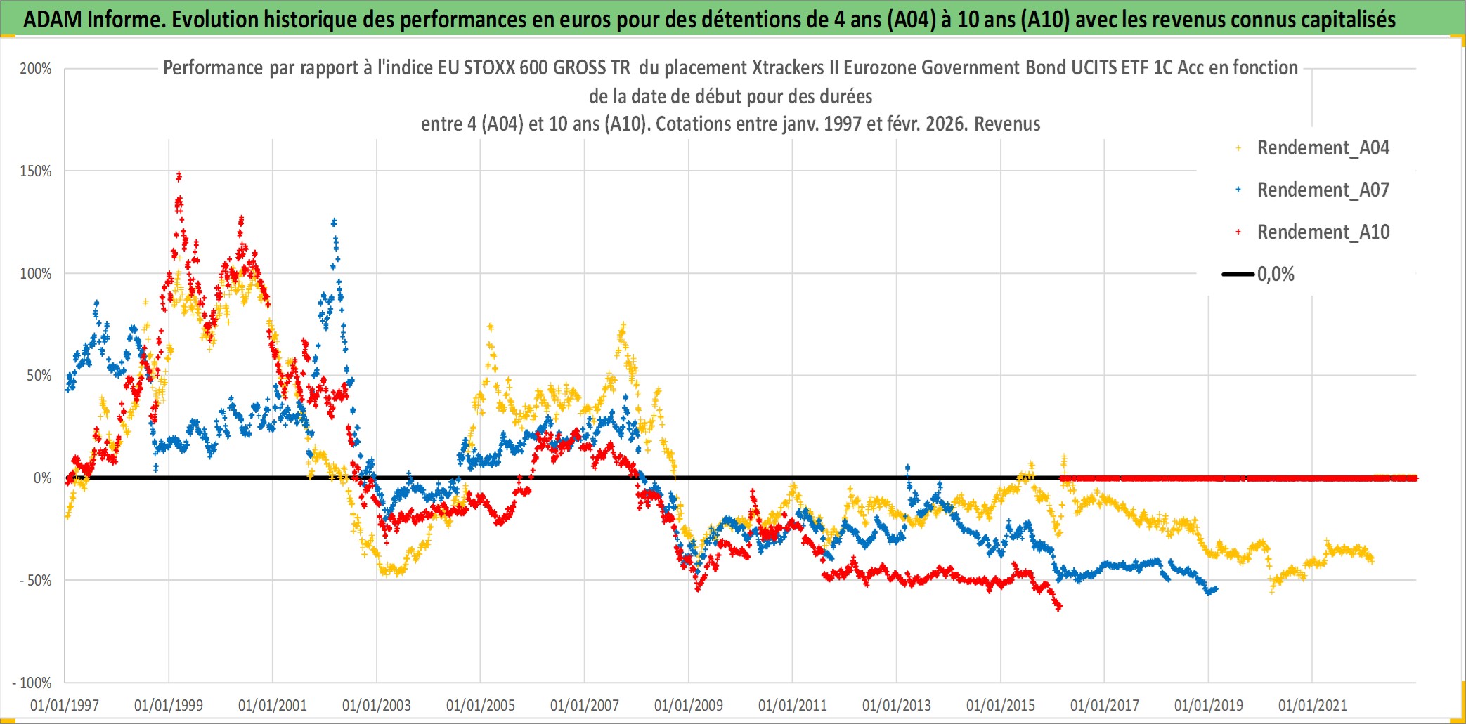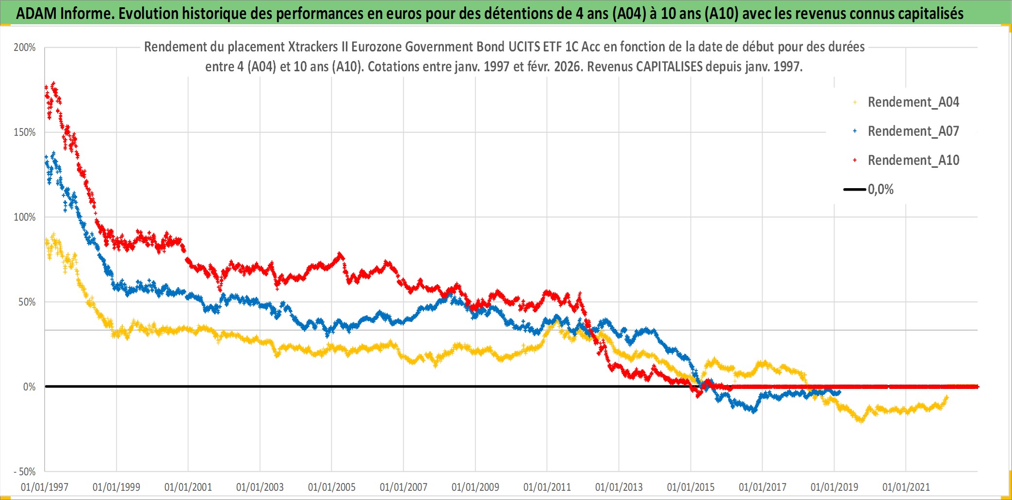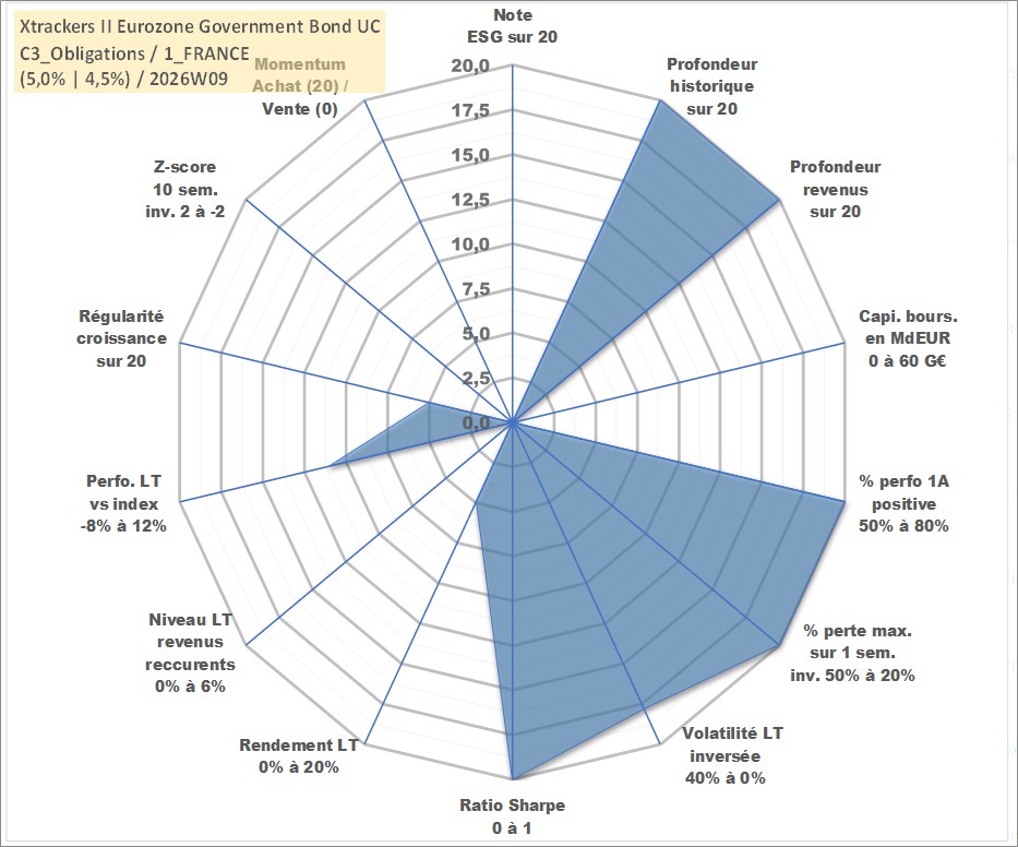 Site dédié aux investisseursPage dédiée sur site financeAnalyse des valorisations hebdomadaires du fonds Xtrackers II Eurozone Government Bond UCITS ETF 1C Acc. Cet actif est cote en EUR. Les valorisations couvrent les semaines 1997W01 a 2026W09. Les revenus de cet actif financier sont pris en compte depuis la semaine 1997W01. La note ESG de cet actif n'est pas connue.
