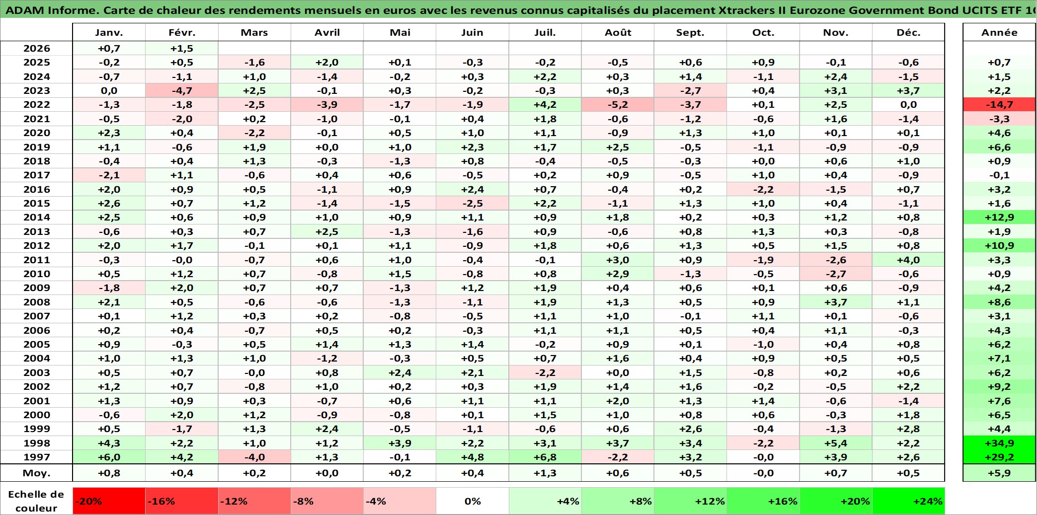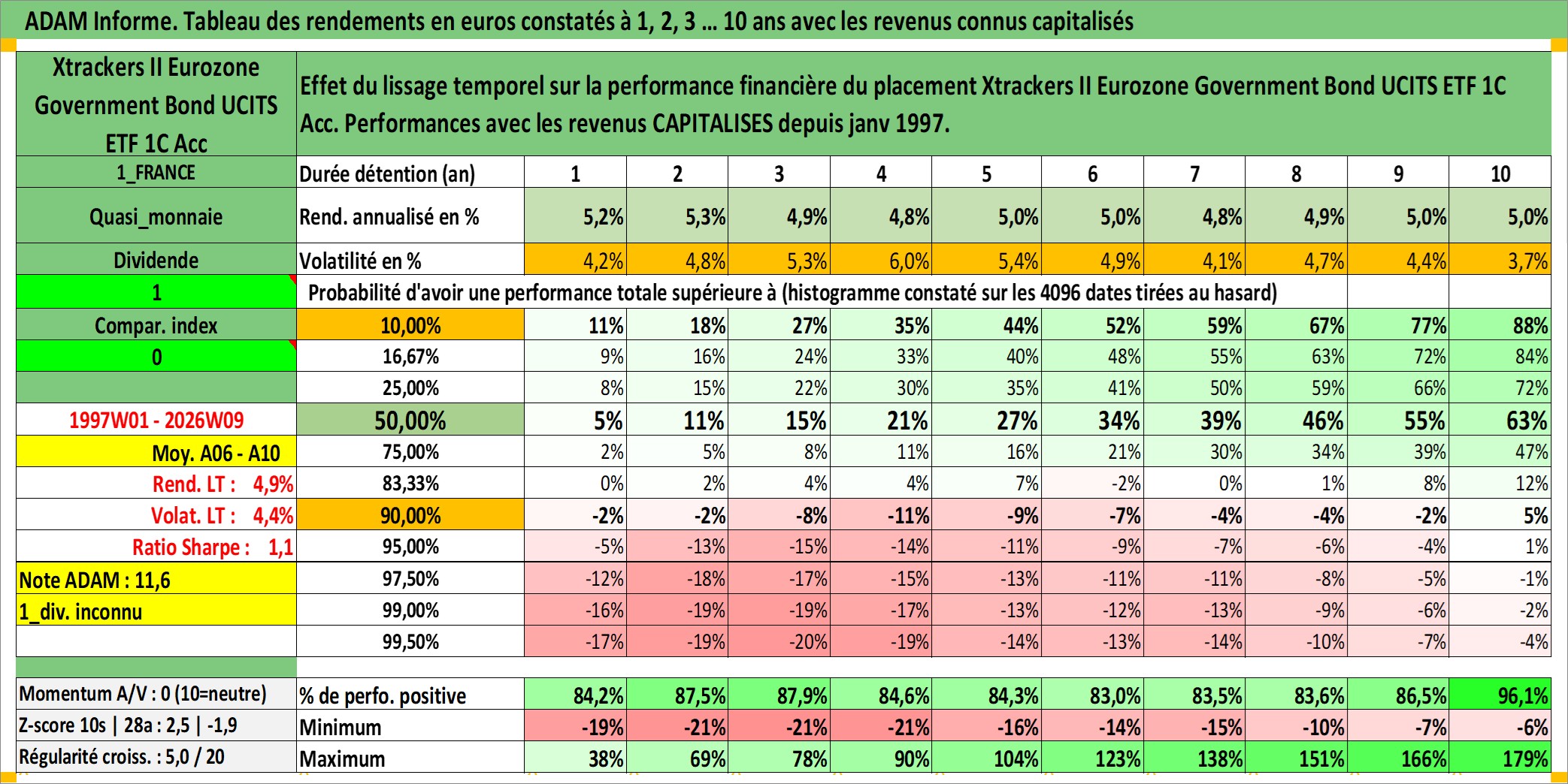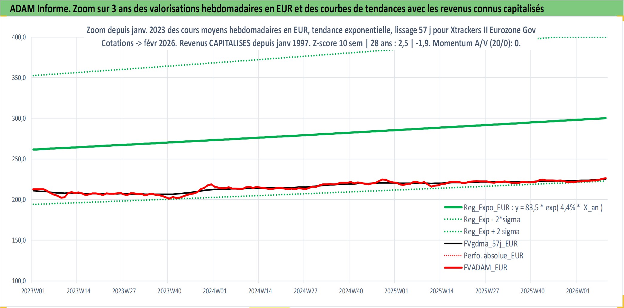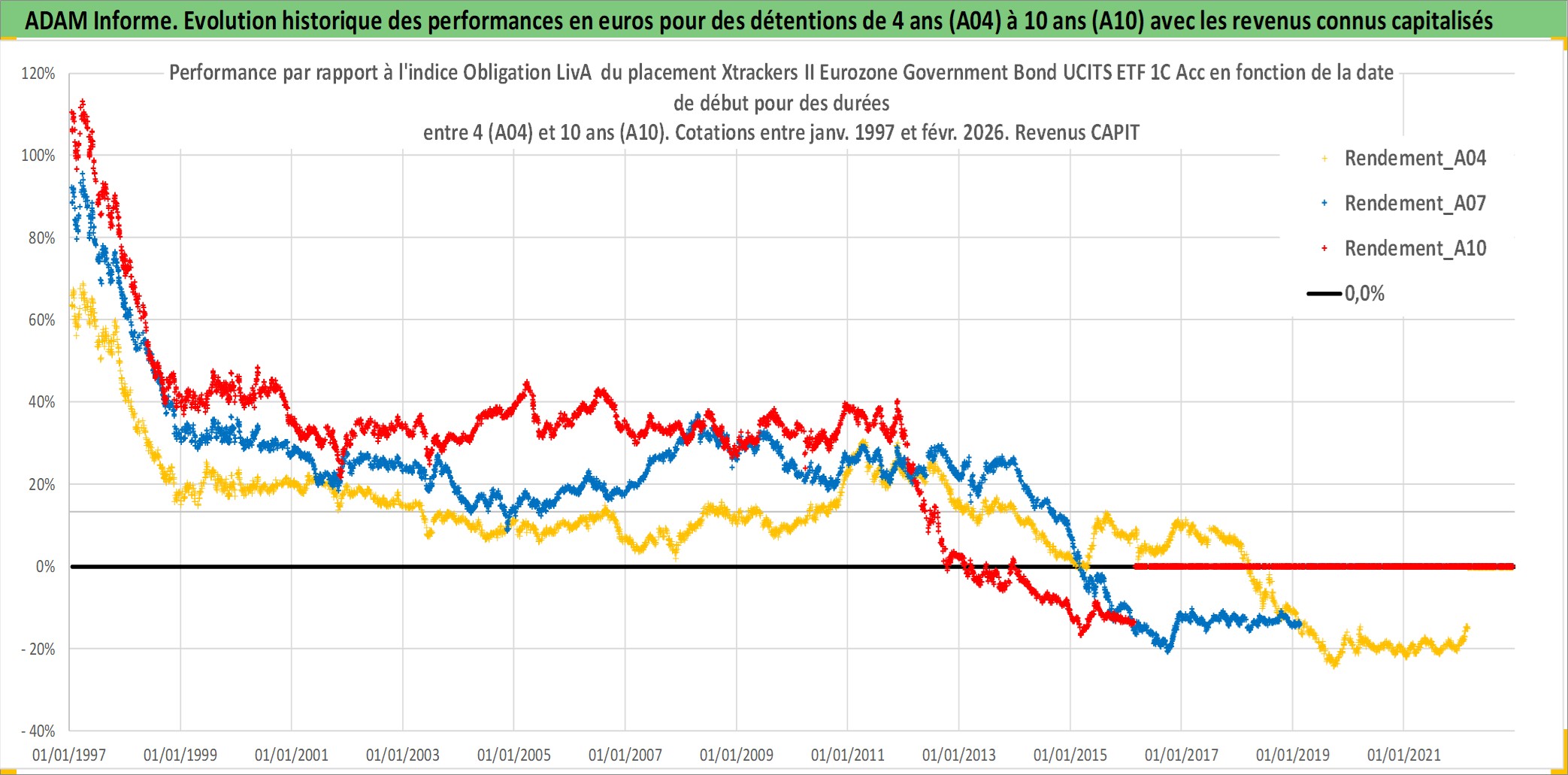 Site dédié aux investisseursPage dédiée sur site financeAnalyse des valorisations hebdomadaires du fonds Xtrackers II Eurozone Government Bond UCITS ETF 1C Acc. Cet actif est cote en EUR. Les valorisations couvrent les semaines 1997W01 a 2026W09. Les revenus de cet actif financier sont pris en compte depuis la semaine 1997W01. La note ESG de cet actif n'est pas connue.