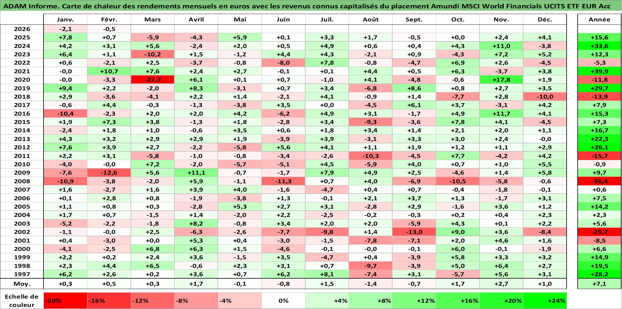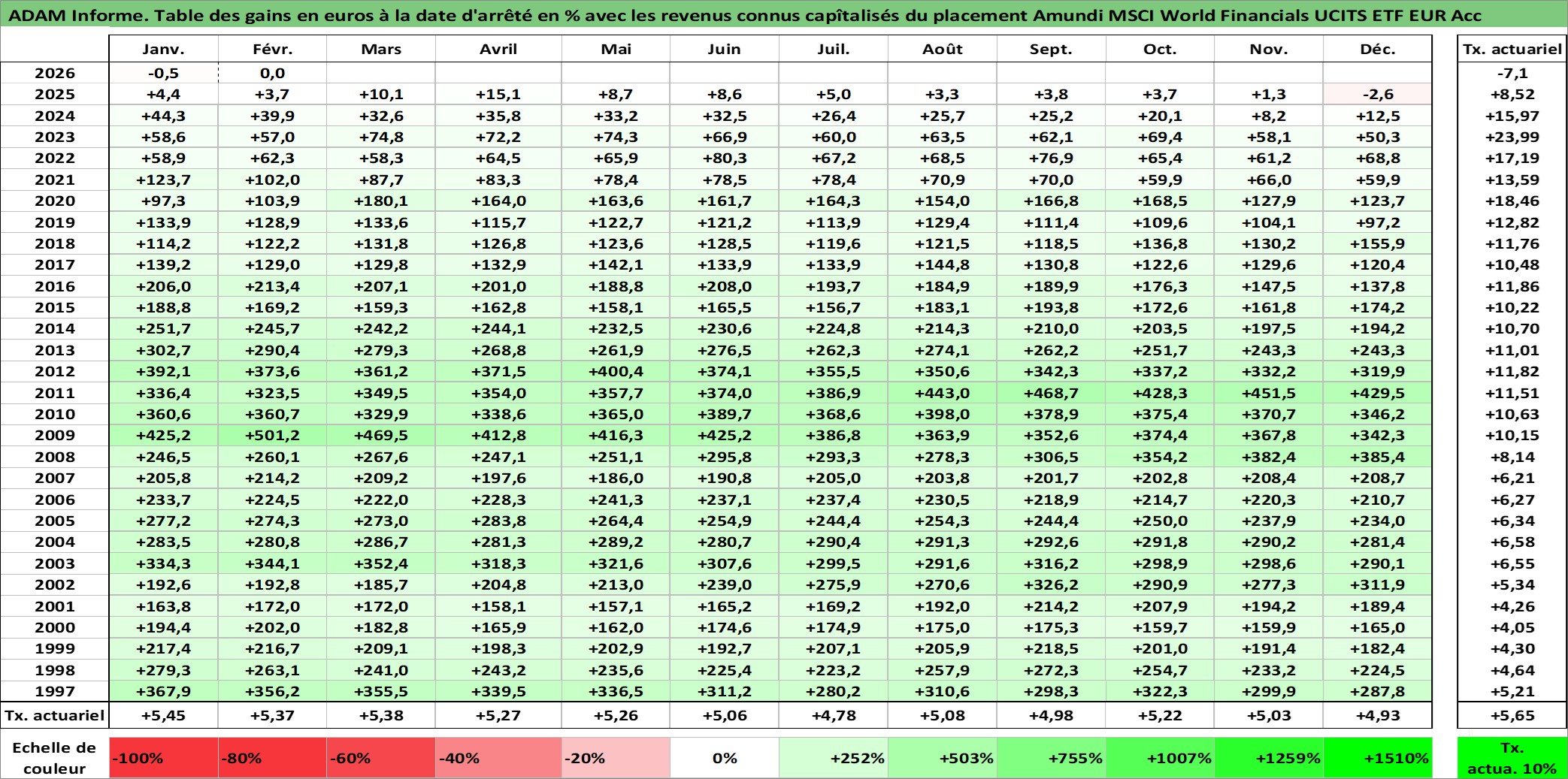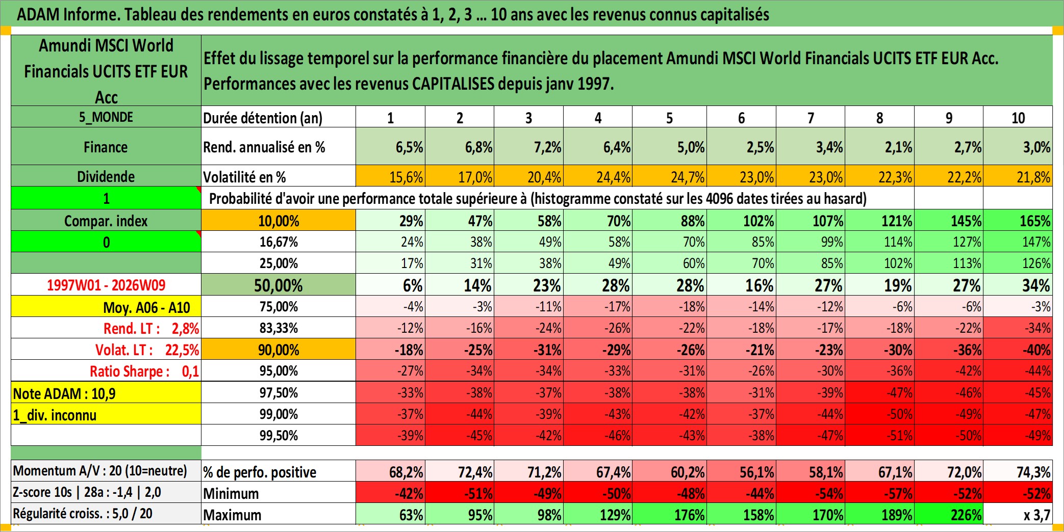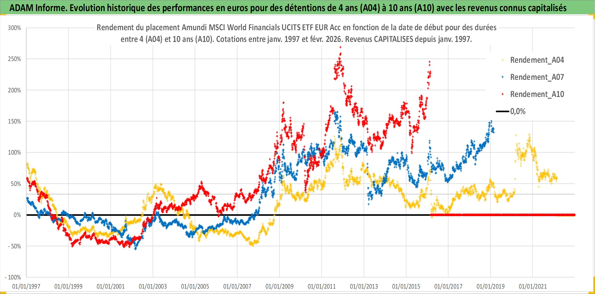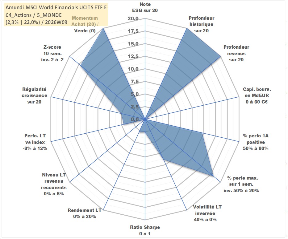 Site dédié aux investisseursPage dédiée sur site financeAnalyse des valorisations hebdomadaires du fonds Amundi MSCI World Financials UCITS ETF EUR Acc. Cet actif est cote en EUR. Les valorisations couvrent les semaines 1997W01 a 2026W09. Les revenus de cet actif financier sont pris en compte depuis la semaine 1997W01. La note ESG de cet actif n'est pas connue.
