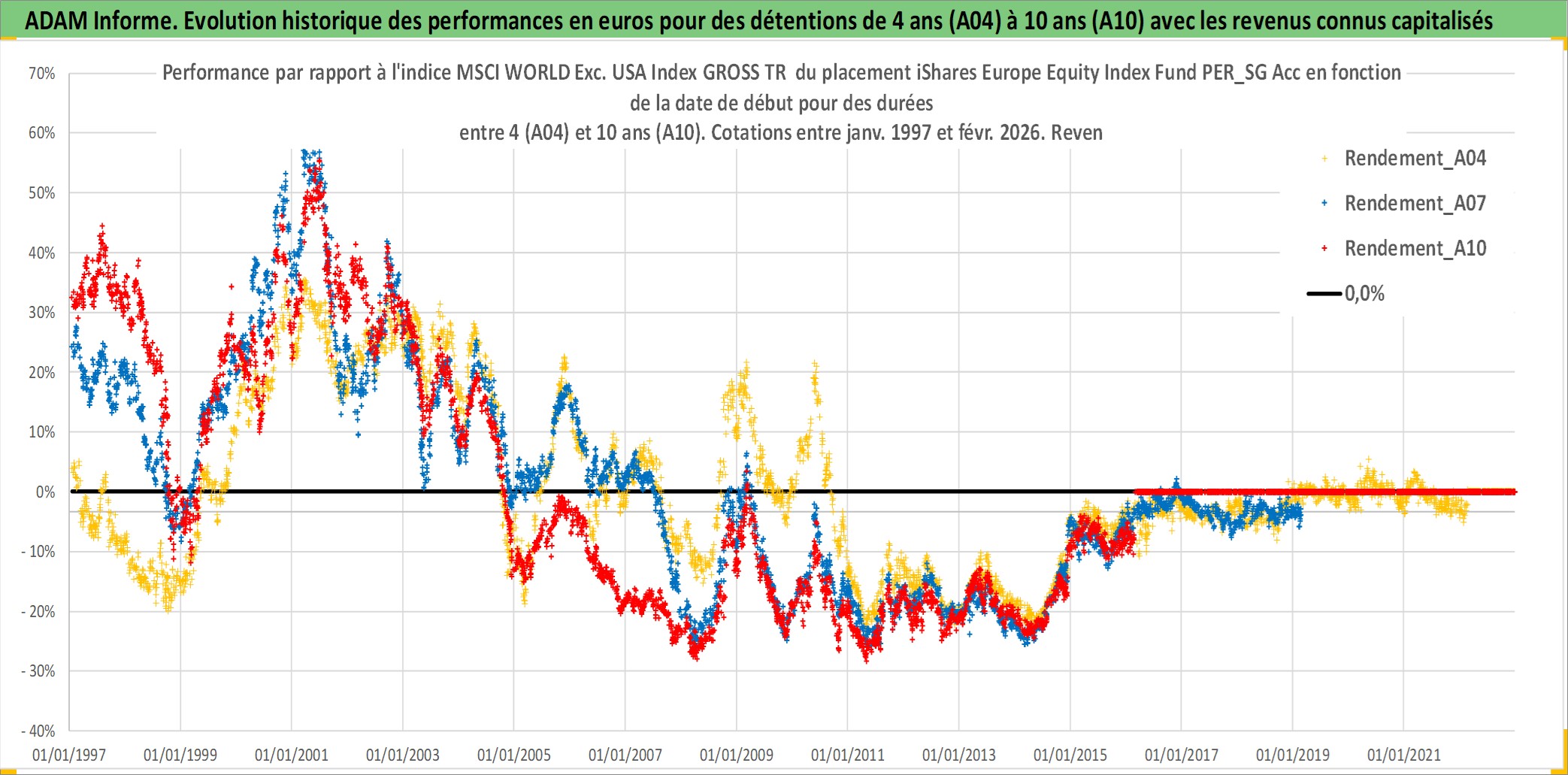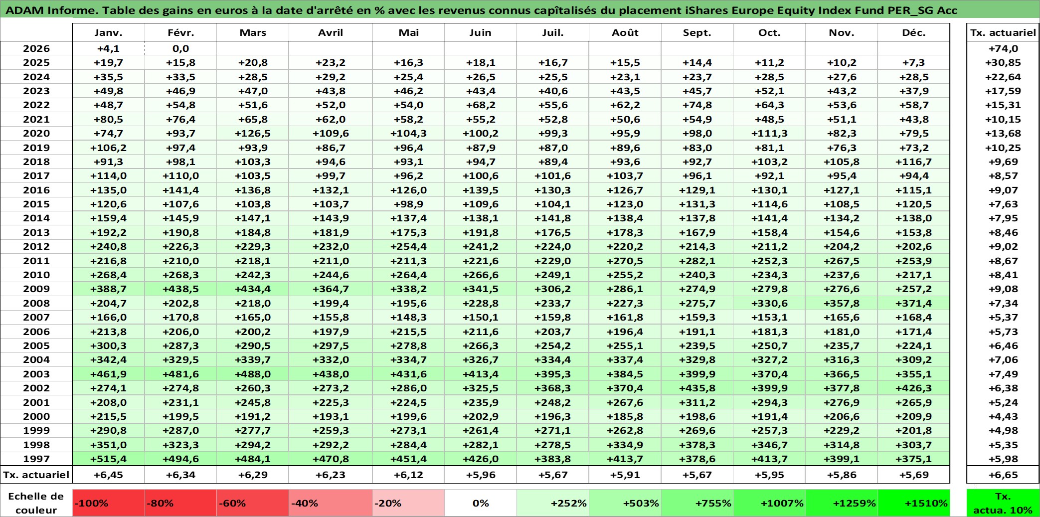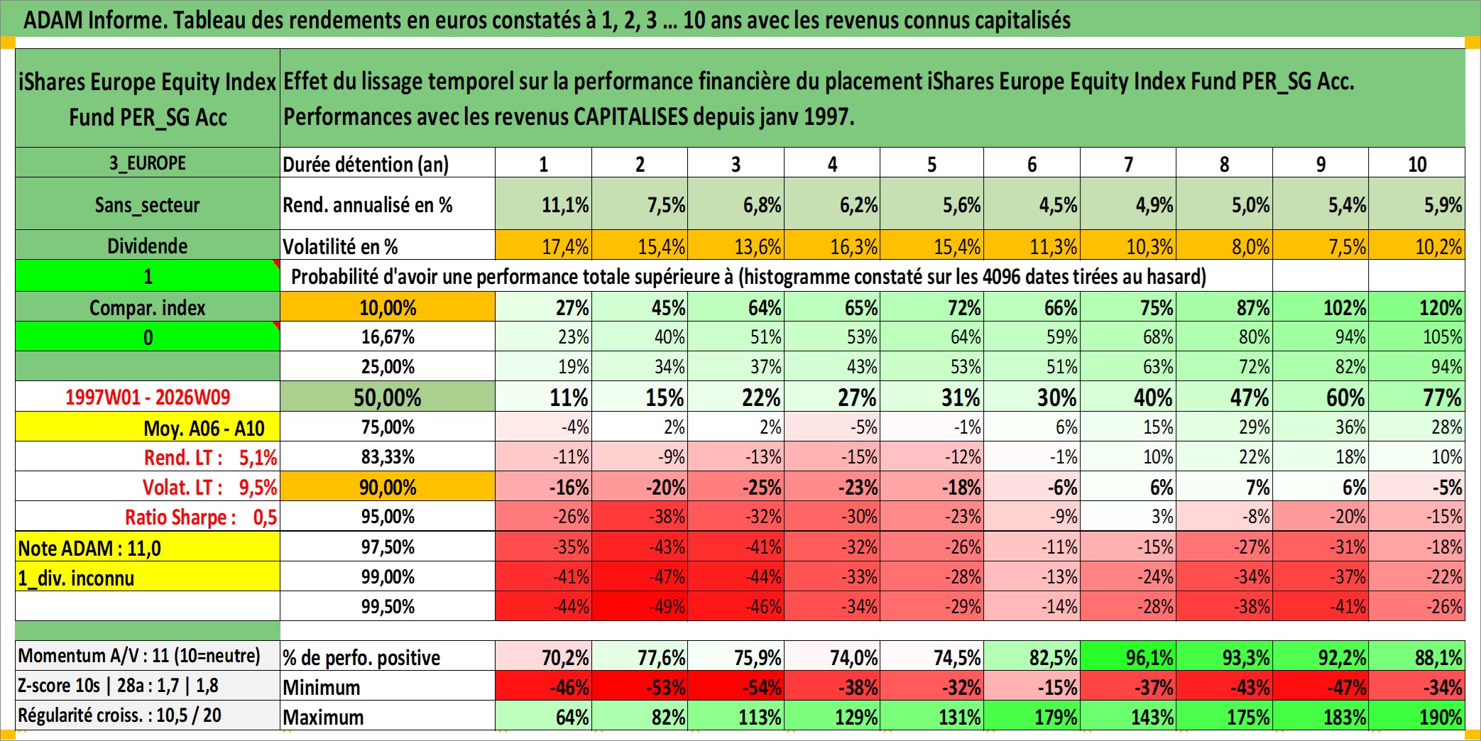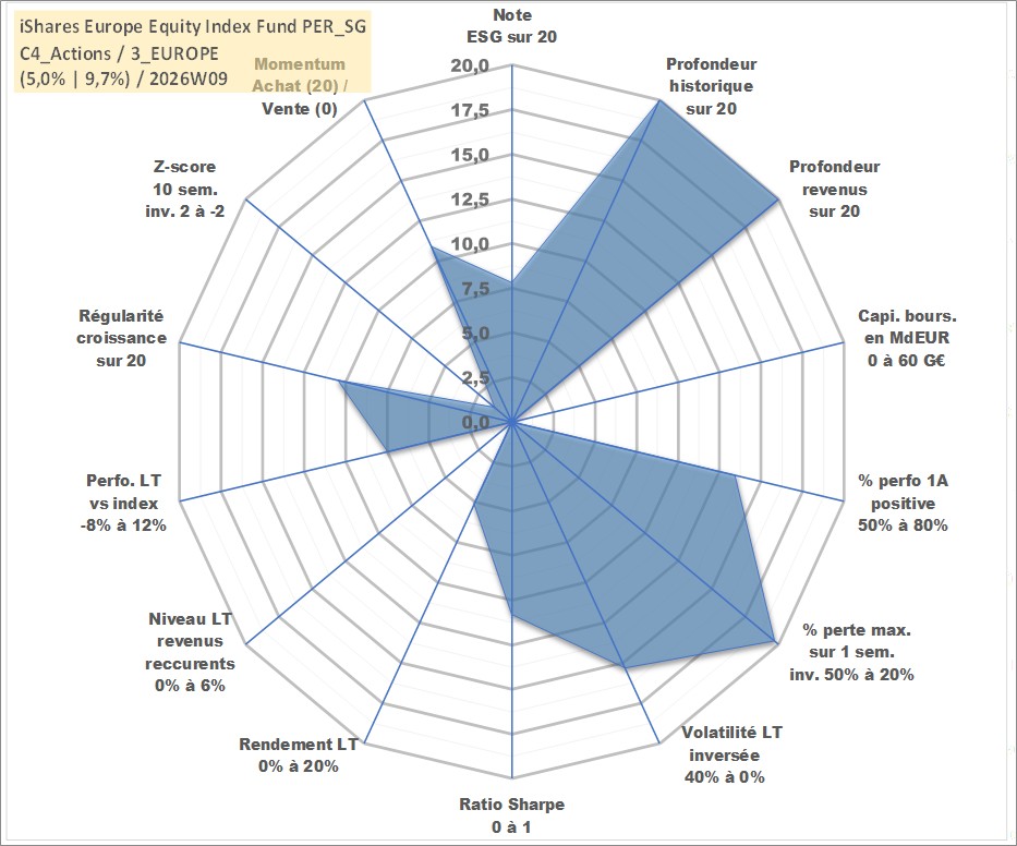 Site dédié aux investisseursPage dédiée sur site financeAnalyse des valorisations hebdomadaires du fonds iShares Europe Equity Index Fund PER_SG Acc. Cet actif est cote en EUR. Les valorisations couvrent les semaines 1997W01 a 2026W09. Les revenus de cet actif financier sont pris en compte depuis la semaine 1997W01. La note globale ESG de cet actif est estimee a 7.9 (apres rebasage entre 0 et 20).