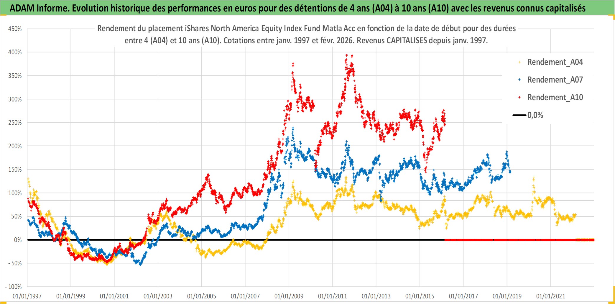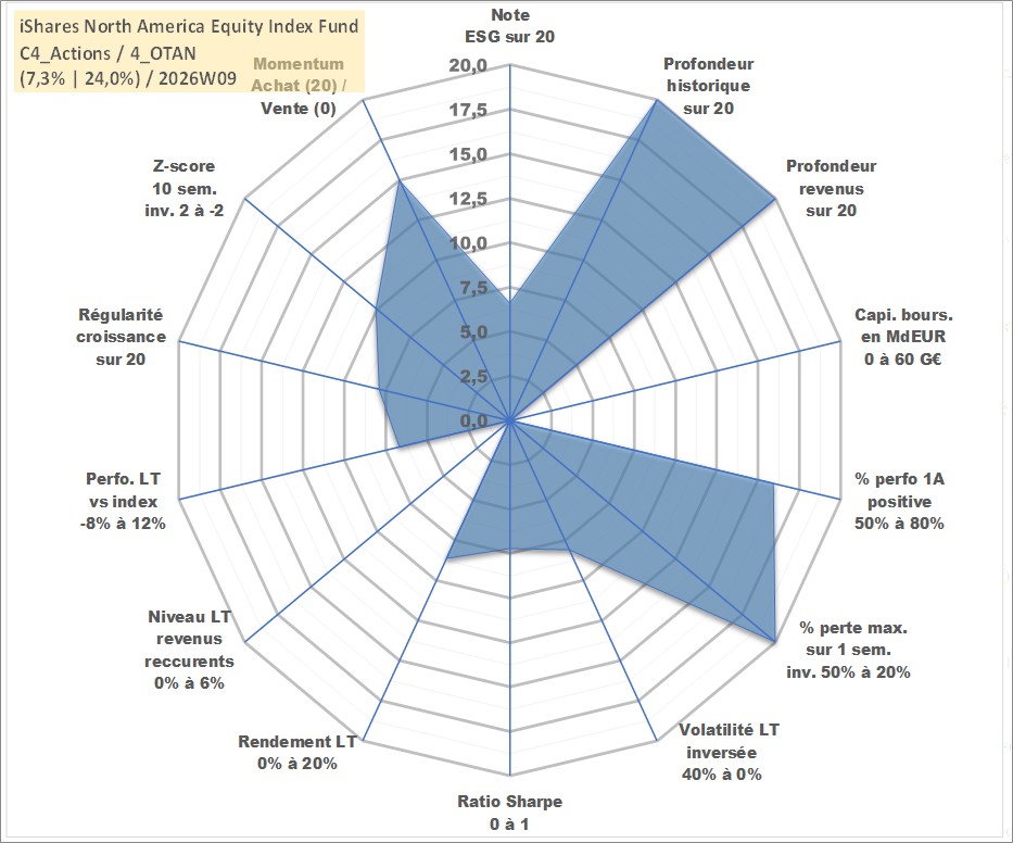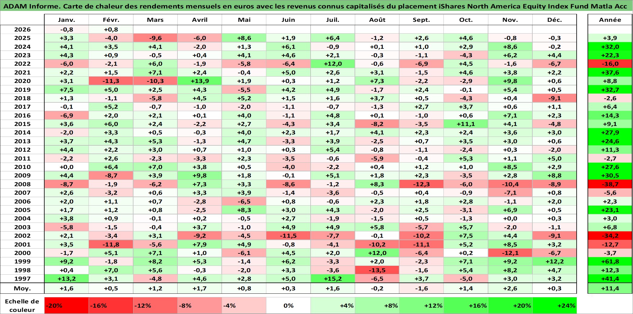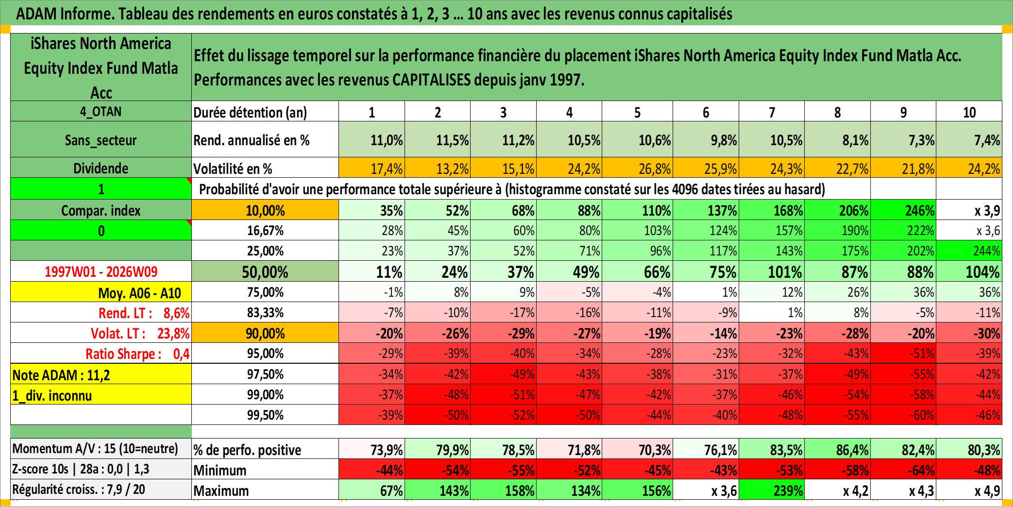 Site dédié aux investisseursPage dédiée sur site financeAnalyse des valorisations hebdomadaires du fonds iShares North America Equity Index Fund Matla Acc. Cet actif est cote en USD. Les valorisations sont en contrevaleur EURO et couvrent les semaines 1997W01 a 2026W09. Les revenus de cet actif financier sont pris en compte depuis la semaine 1997W01. La note globale ESG de cet actif est estimee a 6.6 (apres rebasage entre 0 et 20).
