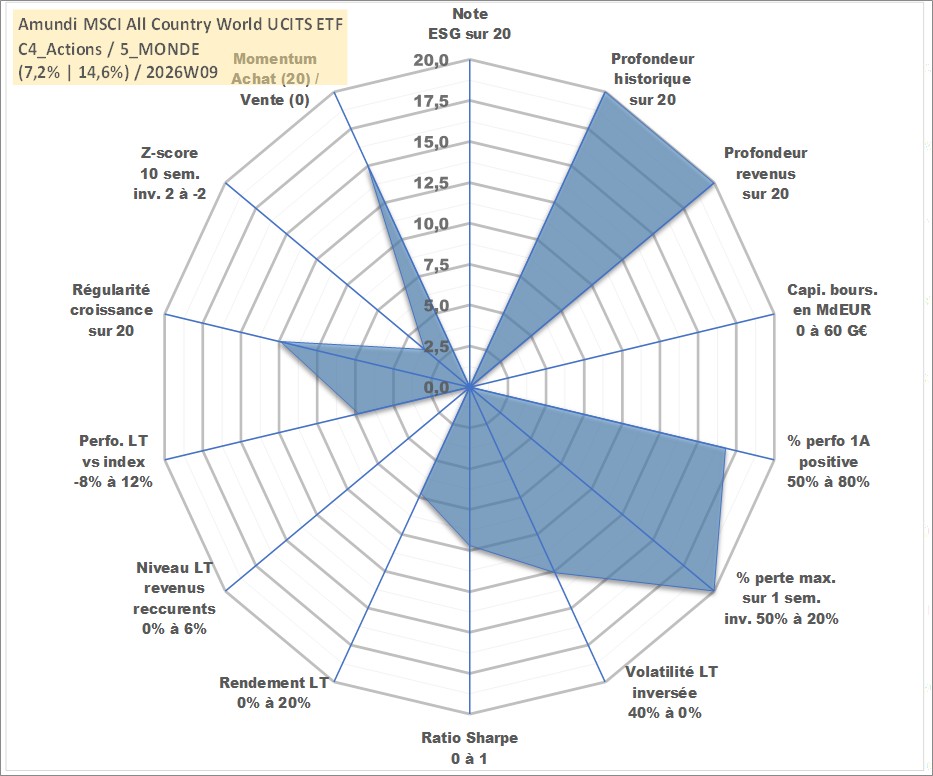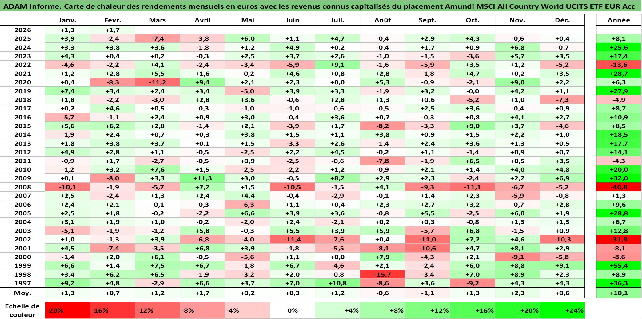 Site dédié aux investisseursPage dédiée sur site financeAnalyse des valorisations hebdomadaires du fonds Amundi MSCI All Country World UCITS ETF EUR Acc. Cet actif est cote en EUR. Les valorisations couvrent les semaines 1997W01 a 2026W09. Les revenus de cet actif financier sont pris en compte depuis la semaine 1997W01. La note ESG de cet actif n'est pas connue.