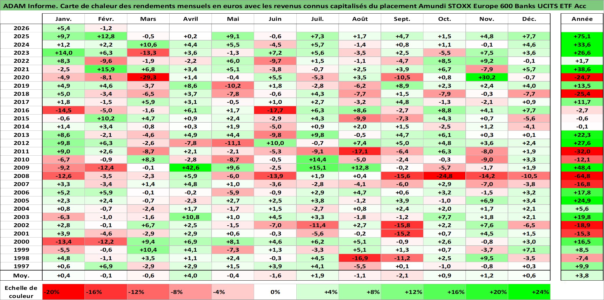 Site dédié aux investisseursPage dédiée sur site financeAnalyse des valorisations hebdomadaires du fonds Amundi STOXX Europe 600 Banks UCITS ETF Acc. Cet actif est cote en EUR. Les valorisations couvrent les semaines 1997W01 a 2026W09. Les revenus de cet actif financier sont pris en compte depuis la semaine 1997W01. La note ESG de cet actif n'est pas connue.