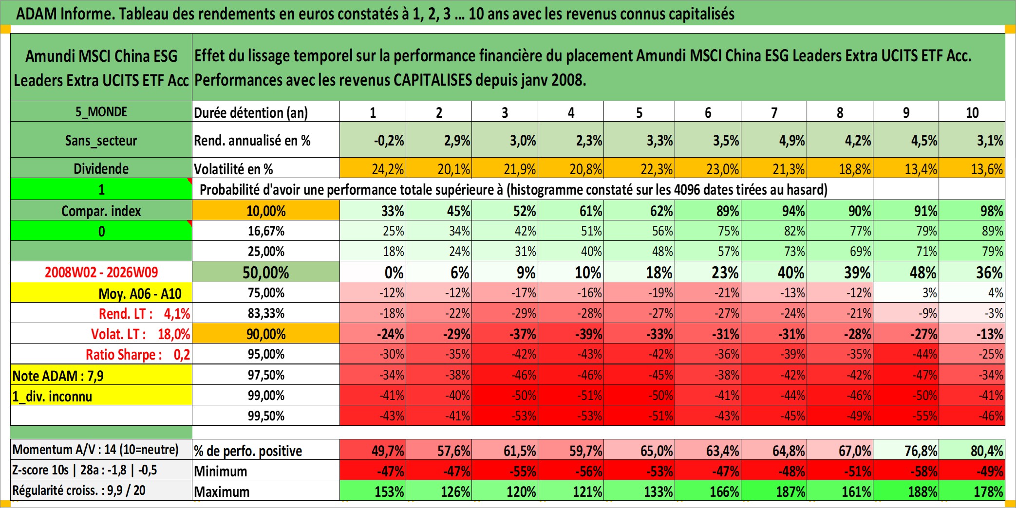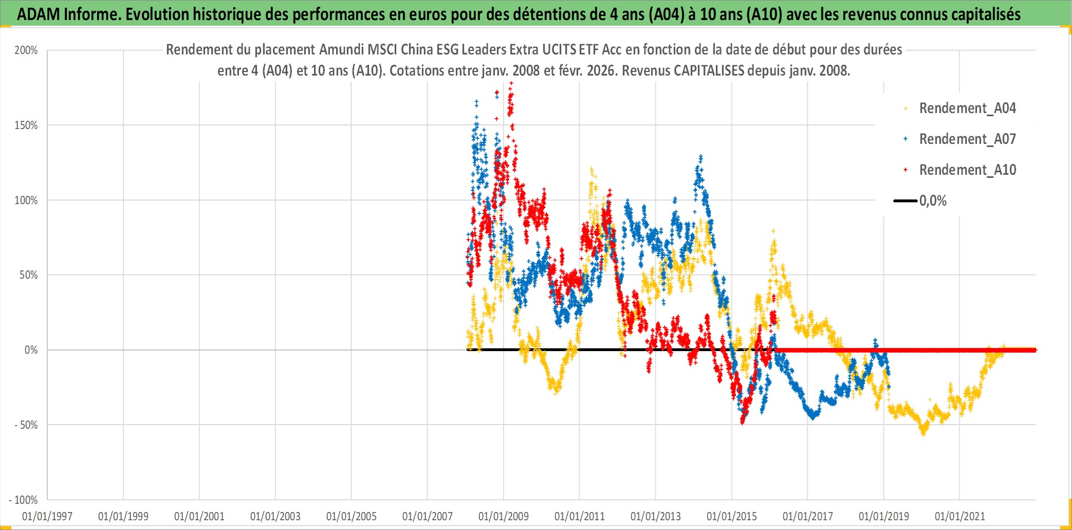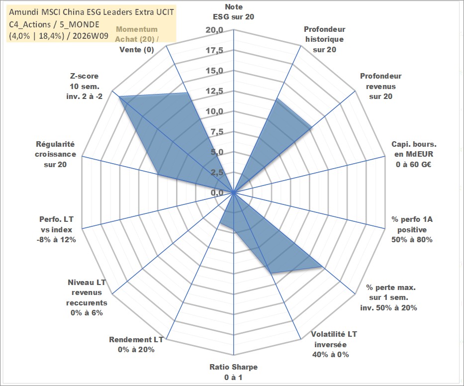 Site dédié aux investisseursPage dédiée sur site financeAnalyse des valorisations hebdomadaires du fonds Amundi MSCI China ESG Leaders Extra UCITS ETF Acc. Cet actif est cote en USD. Les valorisations sont en contrevaleur EURO et couvrent les semaines 2008W02 a 2026W09. Les revenus de cet actif financier sont pris en compte depuis la semaine 2008W02. La note ESG de cet actif n'est pas connue.