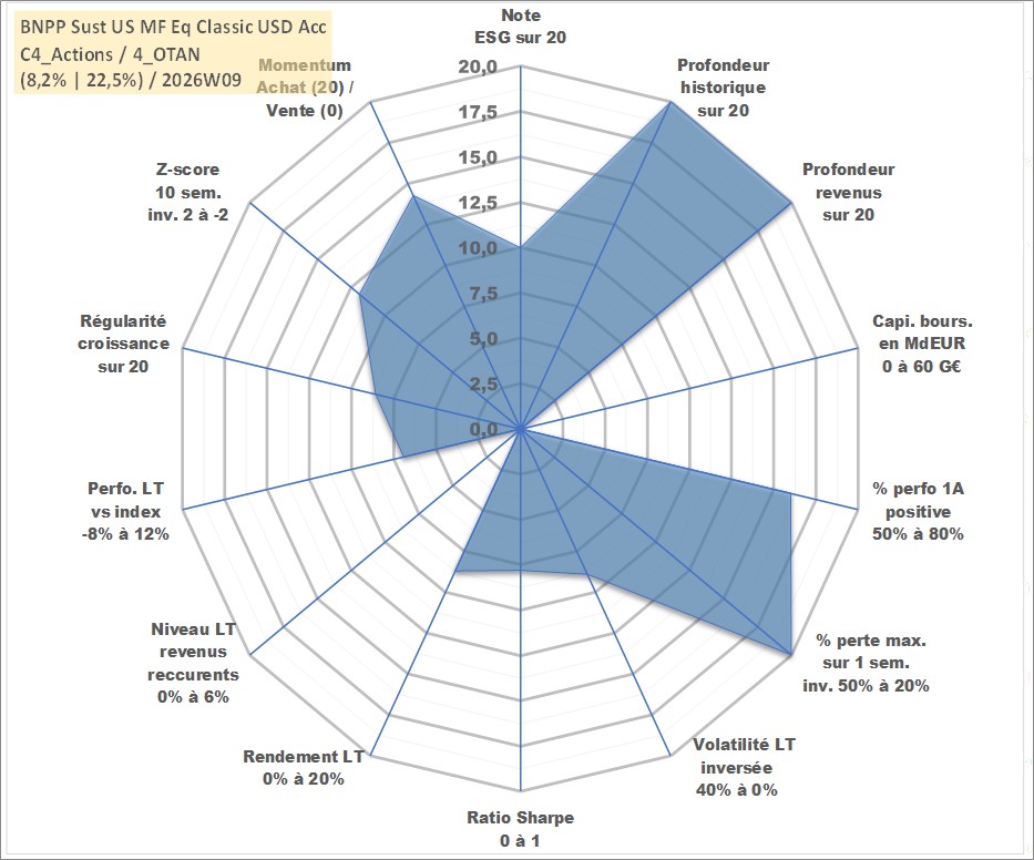 Site dédié aux investisseursPage dédiée sur site financeAnalyse des valorisations hebdomadaires du fonds BNPP Sust US MF Eq Classic USD Acc. Cet actif est cote en USD. Les valorisations sont en contrevaleur EURO et couvrent les semaines 1997W01 a 2026W09. Les revenus de cet actif financier sont pris en compte depuis la semaine 1997W01. La note globale ESG de cet actif est estimee a 10.0 (apres rebasage entre 0 et 20).