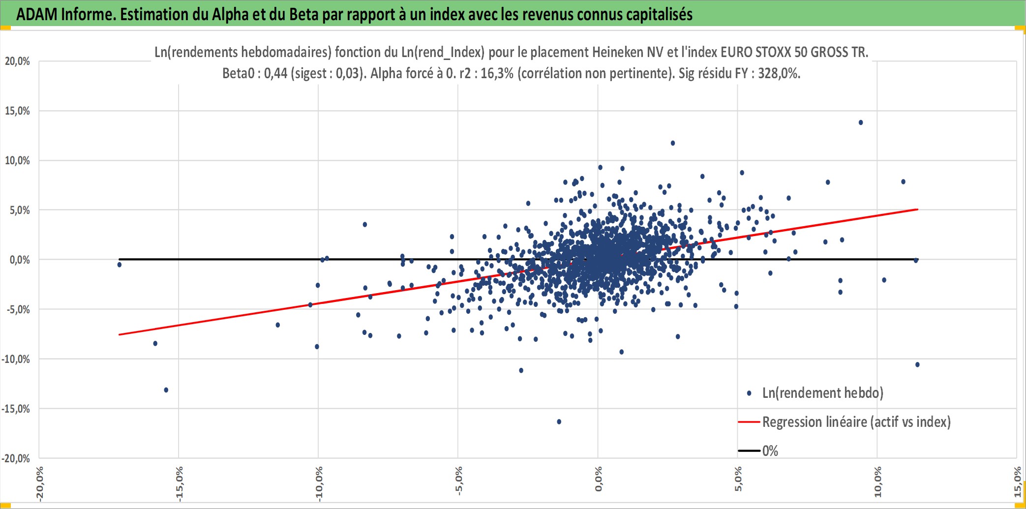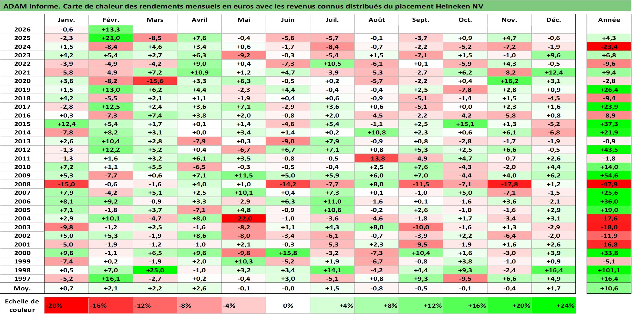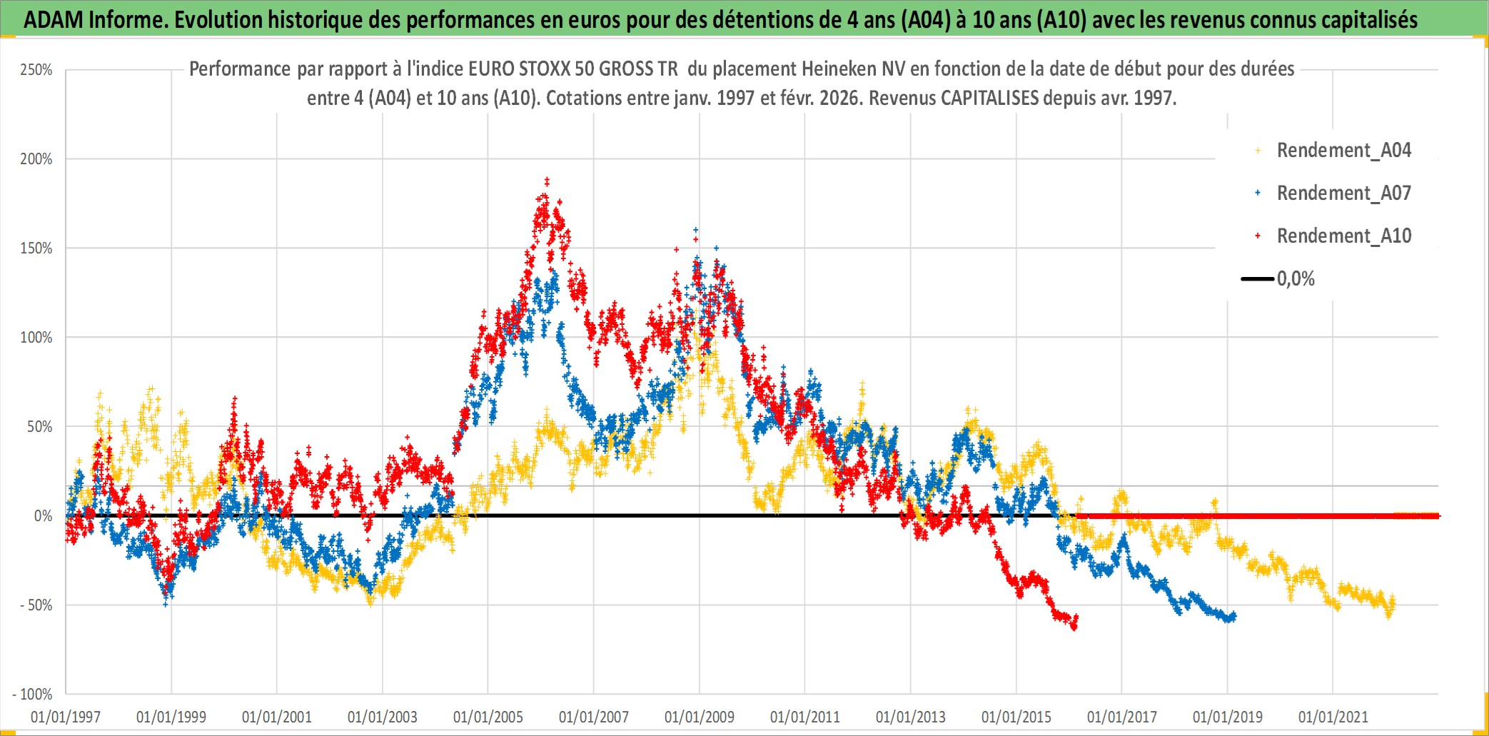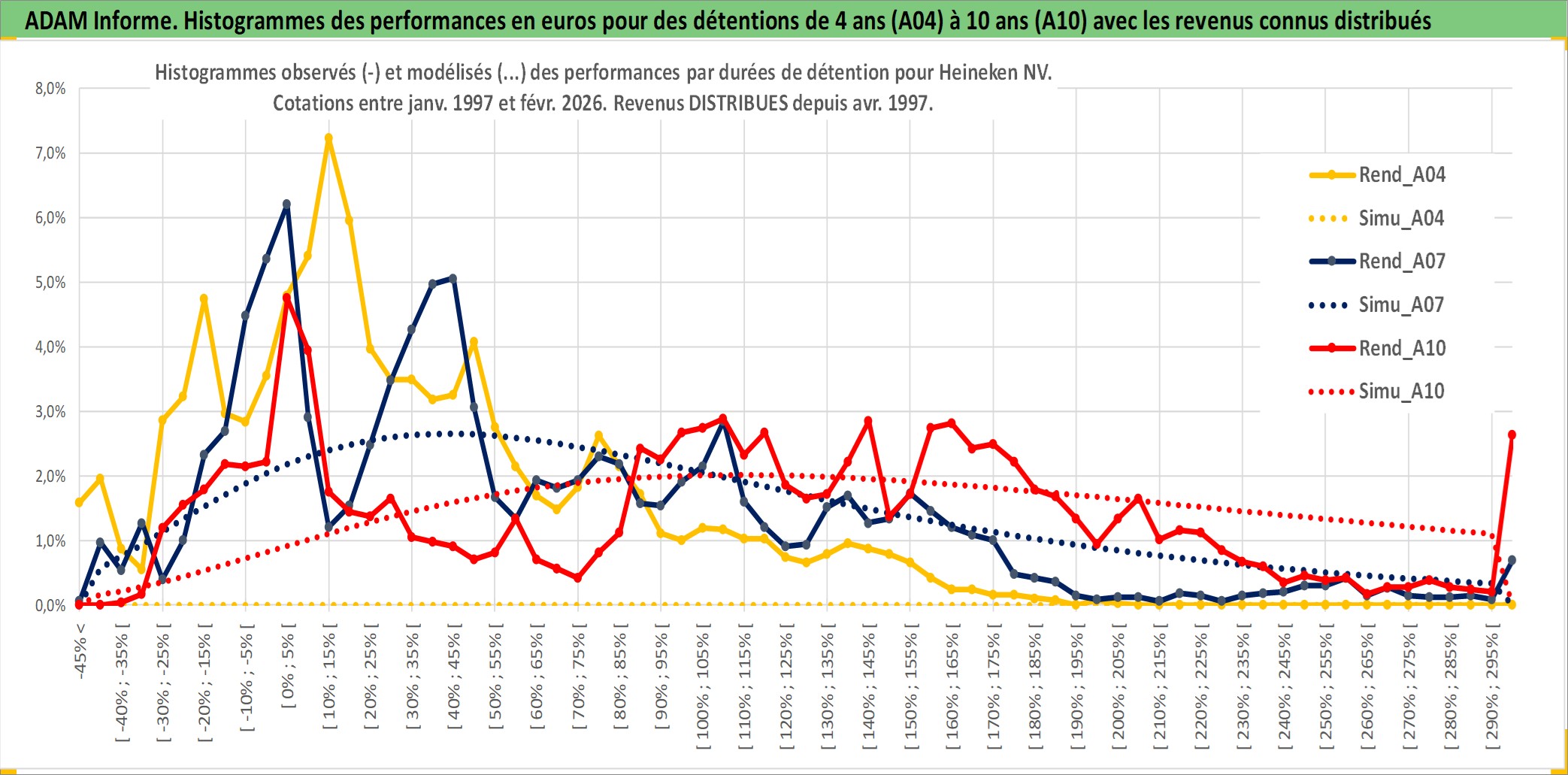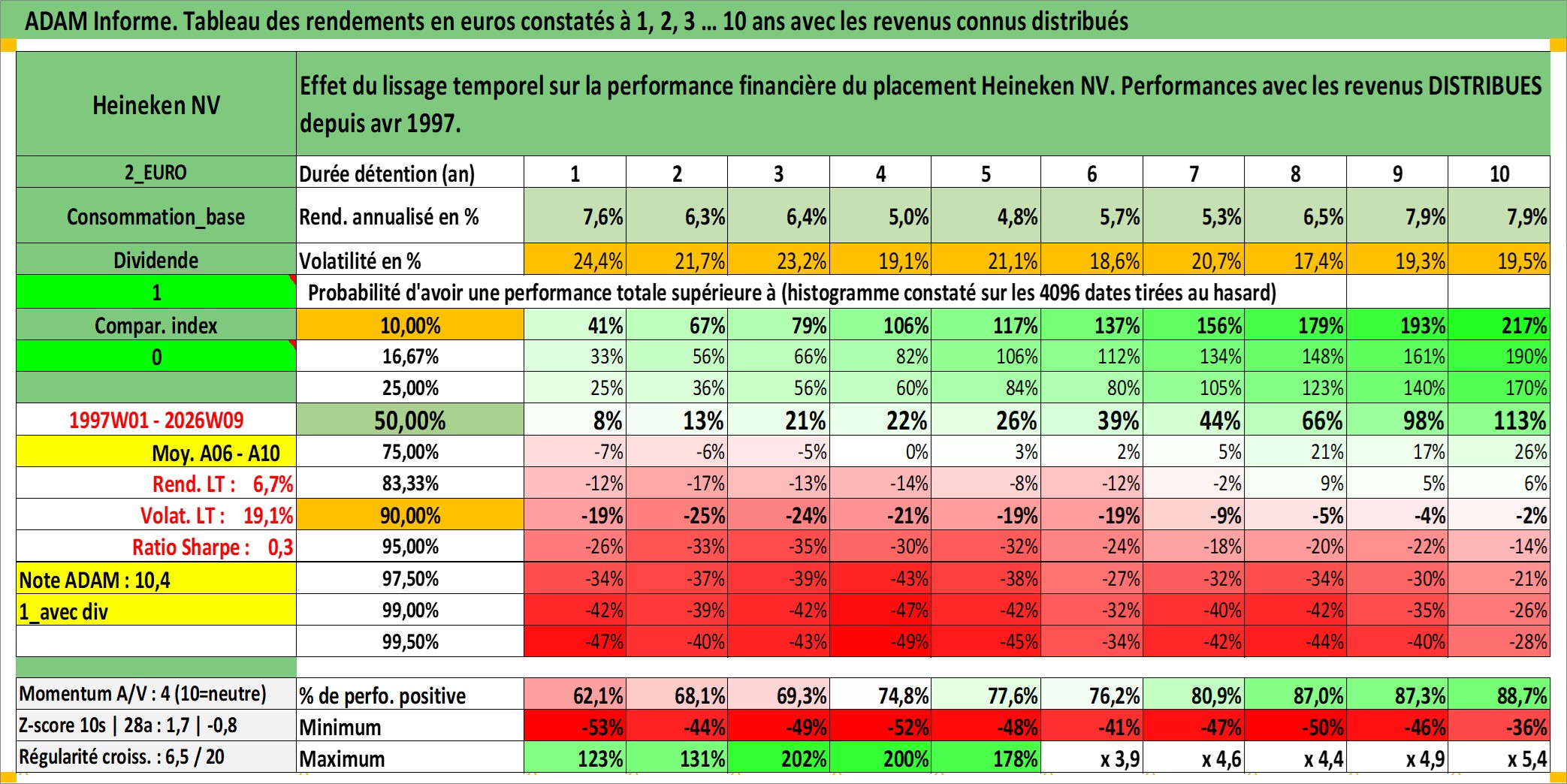 Site dédié aux investisseursPage dédiée sur site financeAnalyse des valorisations hebdomadaires de l'action Heineken NV. Cet actif est cote en EUR. Les valorisations couvrent les semaines 1997W01 a 2026W09. Les revenus de cet actif financier sont pris en compte depuis la semaine 1997W17. La note globale ESG de cet actif est estimee a 11.0 (apres rebasage entre 0 et 20).