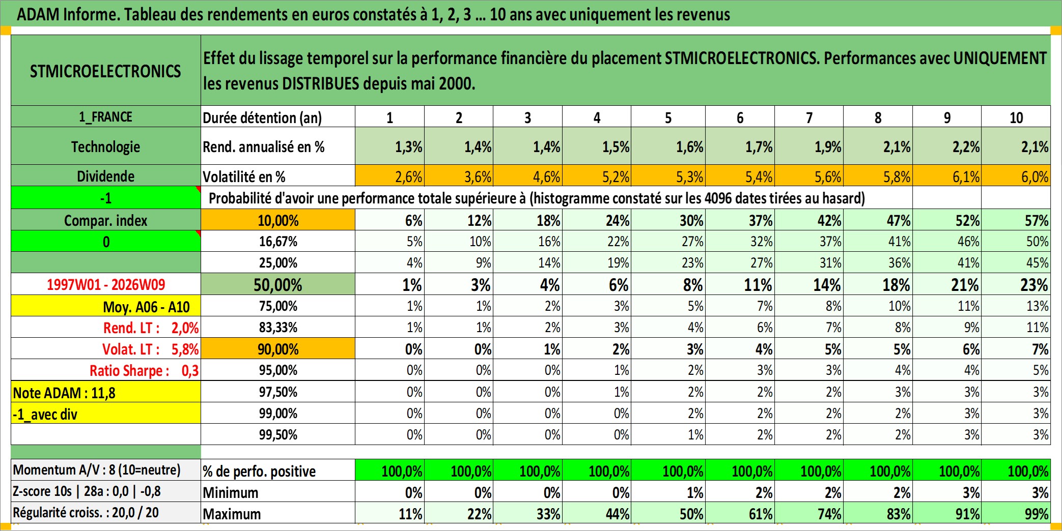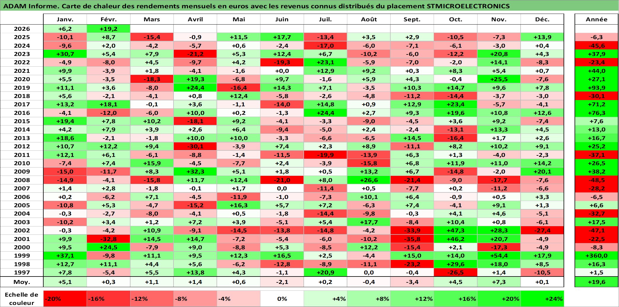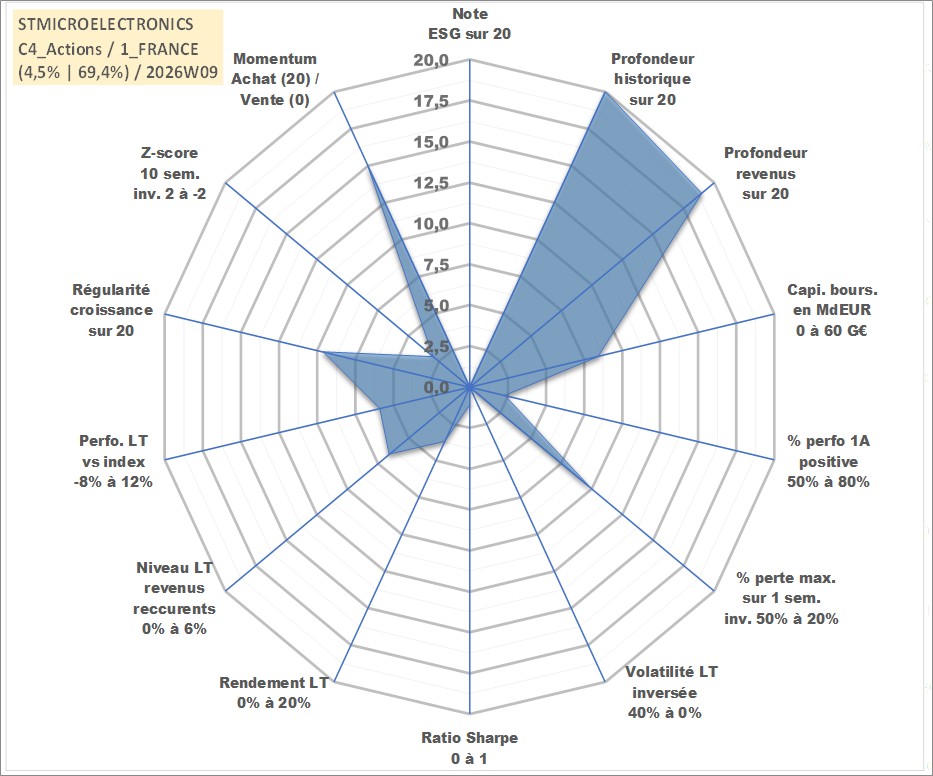 Site dédié aux investisseursPage dédiée sur site financeAnalyse des valorisations hebdomadaires de l'action STMICROELECTRONICS. Cet actif est cote en EUR. Les valorisations couvrent les semaines 1997W01 a 2026W09. Les revenus de cet actif financier sont pris en compte depuis la semaine 2000W18. La note ESG de cet actif n'est pas connue.
