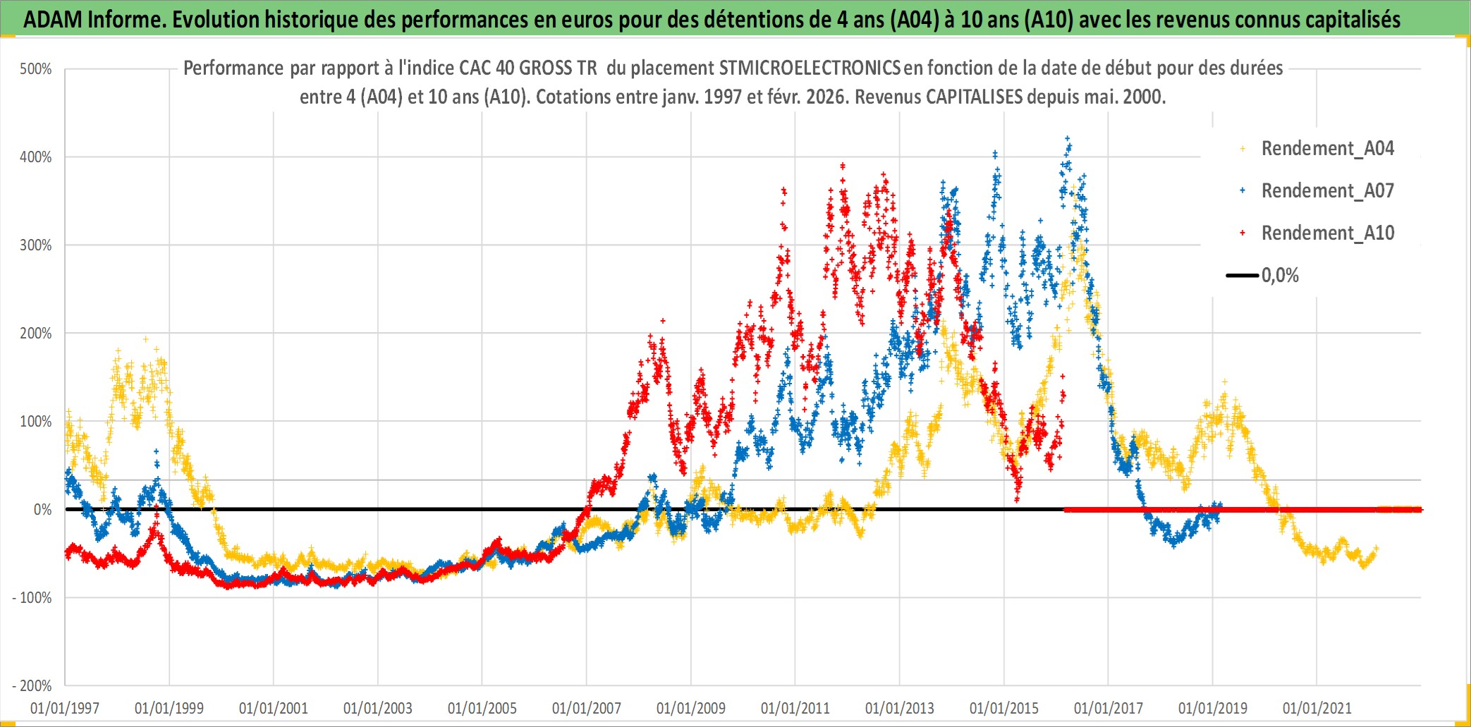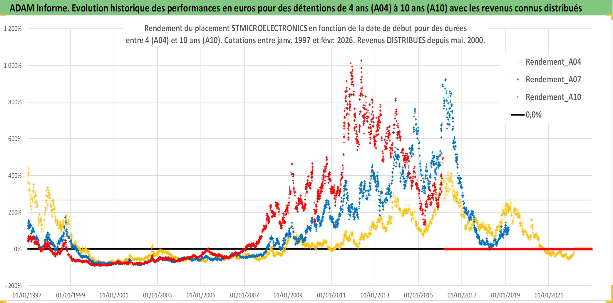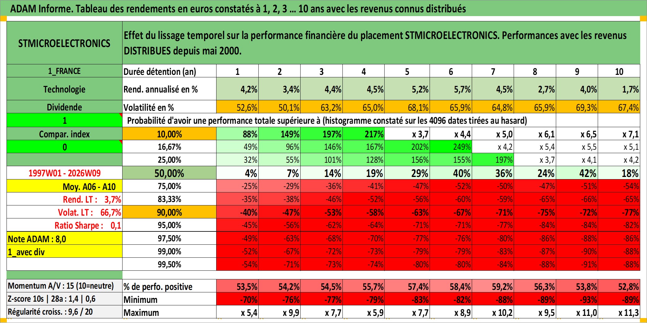 Site dédié aux investisseursPage dédiée sur site financeAnalyse des valorisations hebdomadaires de l'action STMICROELECTRONICS. Cet actif est cote en EUR. Les valorisations couvrent les semaines 1997W01 a 2026W09. Les revenus de cet actif financier sont pris en compte depuis la semaine 2000W18. La note ESG de cet actif n'est pas connue.