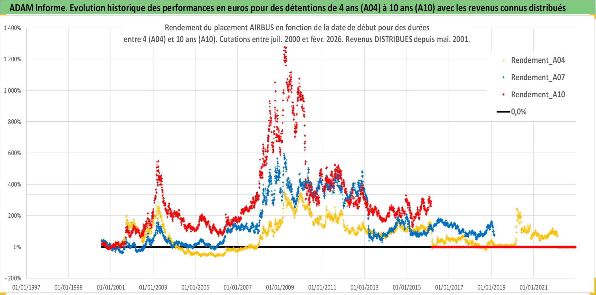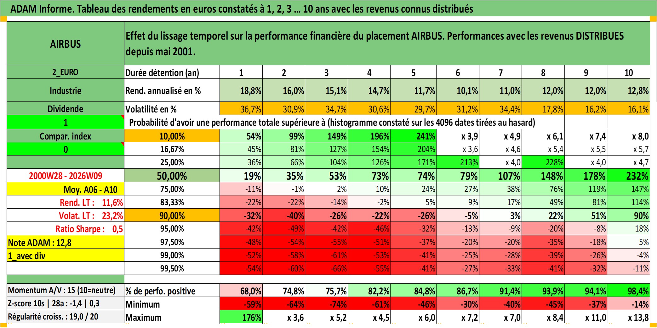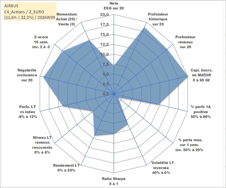Site dédié aux investisseursPage dédiée sur site financeAnalyse des valorisations hebdomadaires de l'action AIRBUS. Cet actif est cote en EUR. Les valorisations couvrent les semaines 2000W28 a 2026W09. Les revenus de cet actif financier sont pris en compte depuis la semaine 2001W20. La note globale ESG de cet actif est estimee a 7.0 (apres rebasage entre 0 et 20).