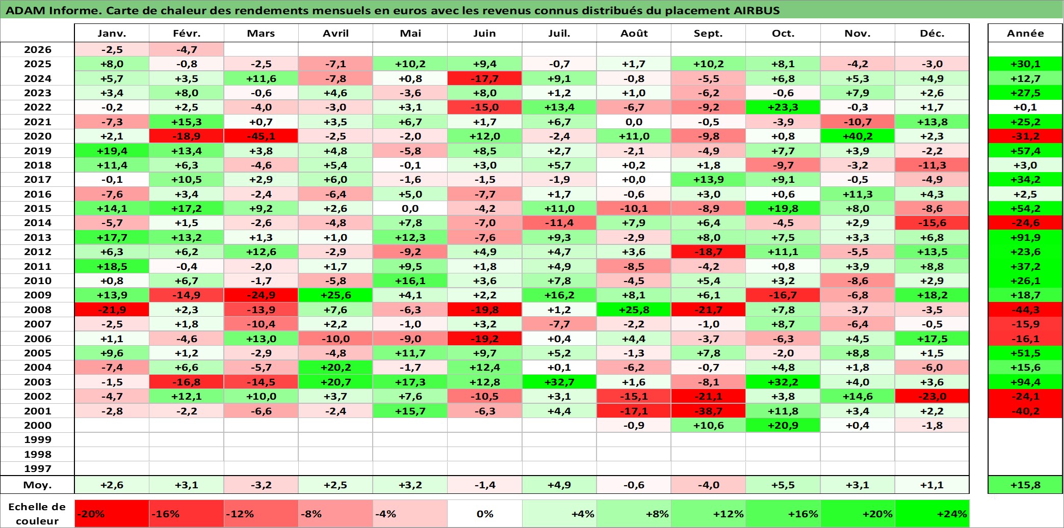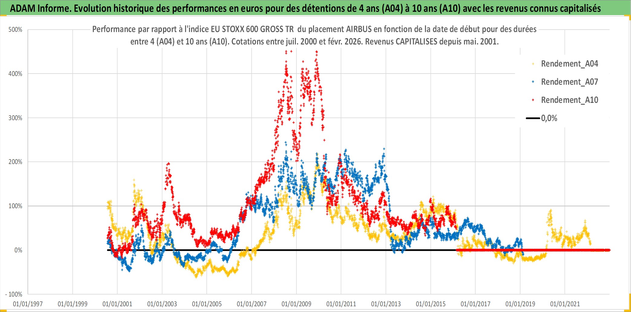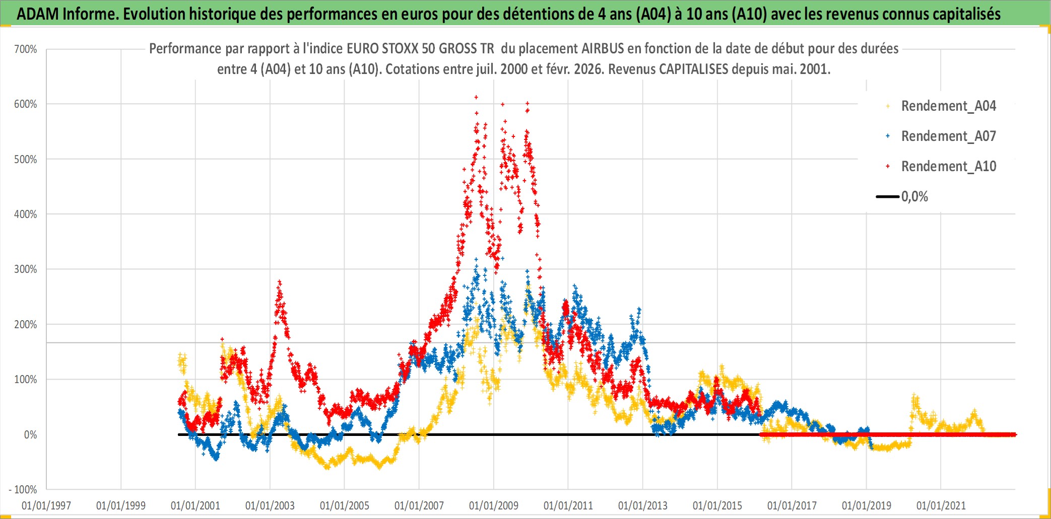 Site dédié aux investisseursPage dédiée sur site financeAnalyse des valorisations hebdomadaires de l'action AIRBUS. Cet actif est cote en EUR. Les valorisations couvrent les semaines 2000W28 a 2026W09. Les revenus de cet actif financier sont pris en compte depuis la semaine 2001W20. La note globale ESG de cet actif est estimee a 7.0 (apres rebasage entre 0 et 20).