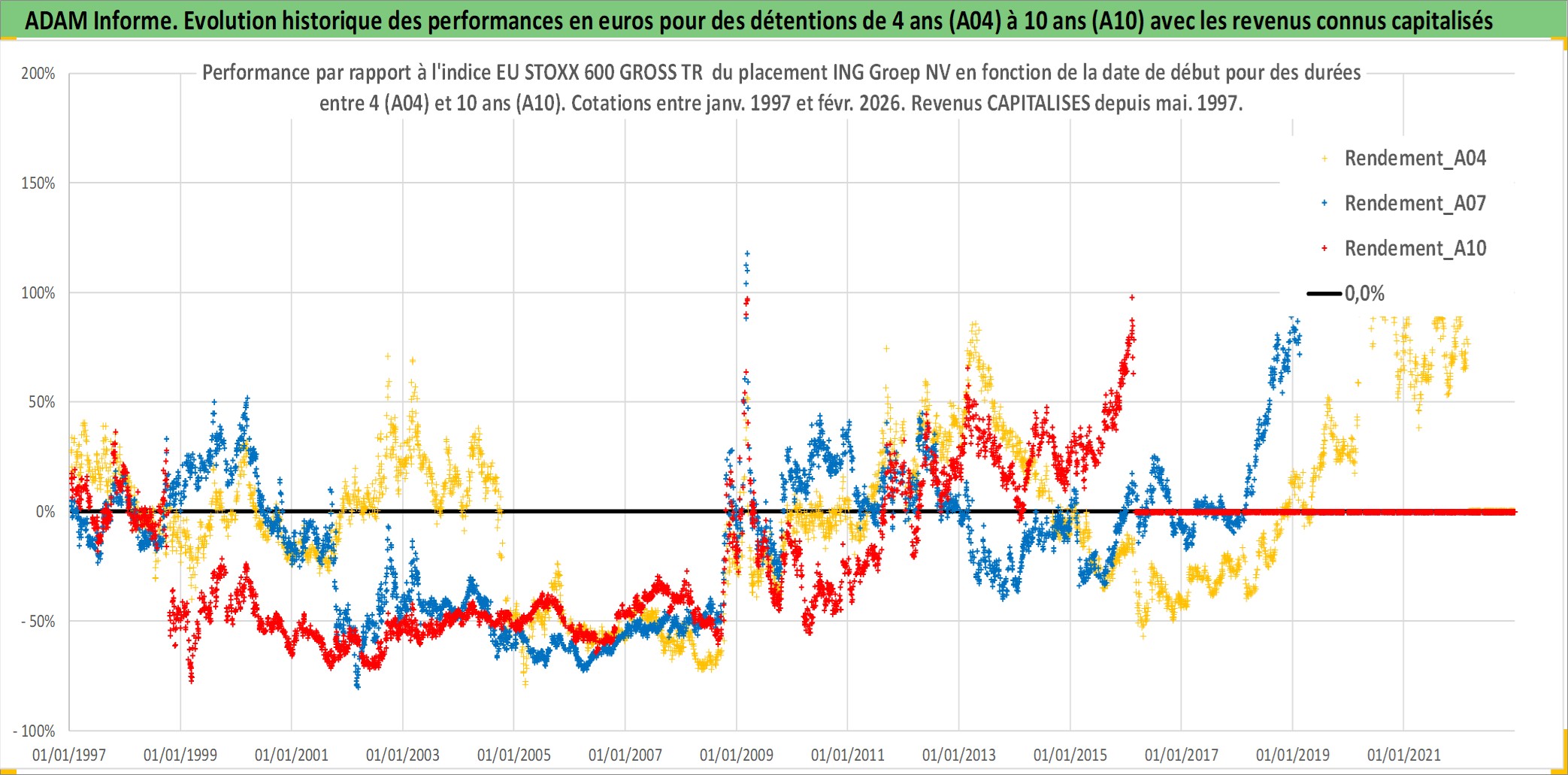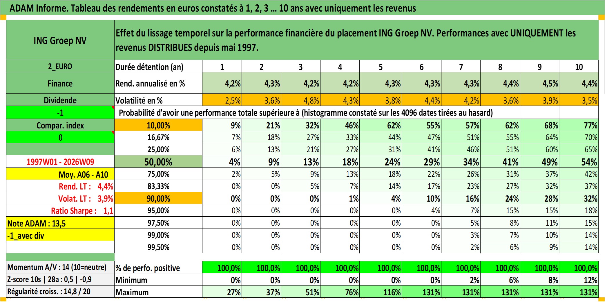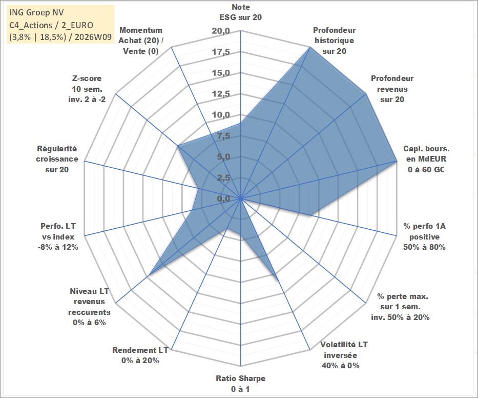 Site dédié aux investisseursPage dédiée sur site financeAnalyse des valorisations hebdomadaires de l'action ING Groep NV. Cet actif est cote en EUR. Les valorisations couvrent les semaines 1997W01 a 2026W09. Les revenus de cet actif financier sont pris en compte depuis la semaine 1997W19. La note globale ESG de cet actif est estimee a 9.0 (apres rebasage entre 0 et 20).
