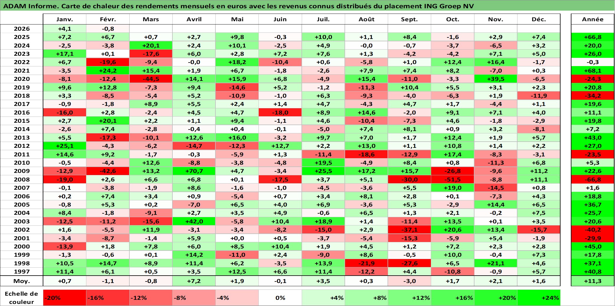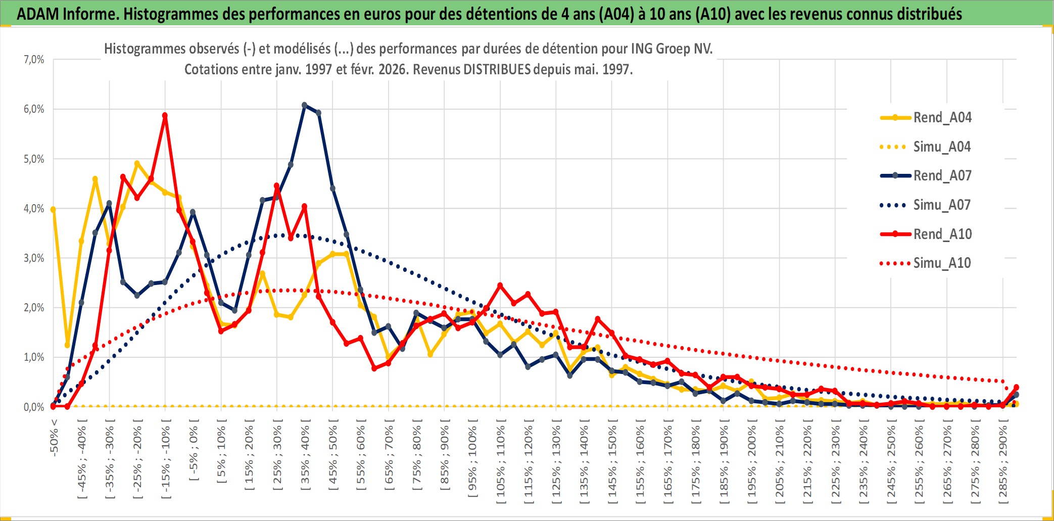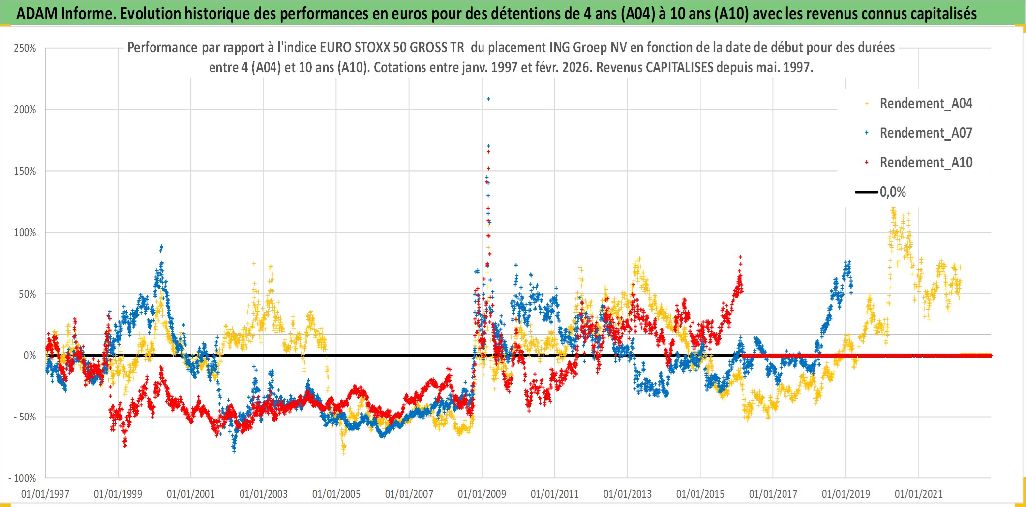 Site dédié aux investisseursPage dédiée sur site financeAnalyse des valorisations hebdomadaires de l'action ING Groep NV. Cet actif est cote en EUR. Les valorisations couvrent les semaines 1997W01 a 2026W09. Les revenus de cet actif financier sont pris en compte depuis la semaine 1997W19. La note globale ESG de cet actif est estimee a 9.0 (apres rebasage entre 0 et 20).