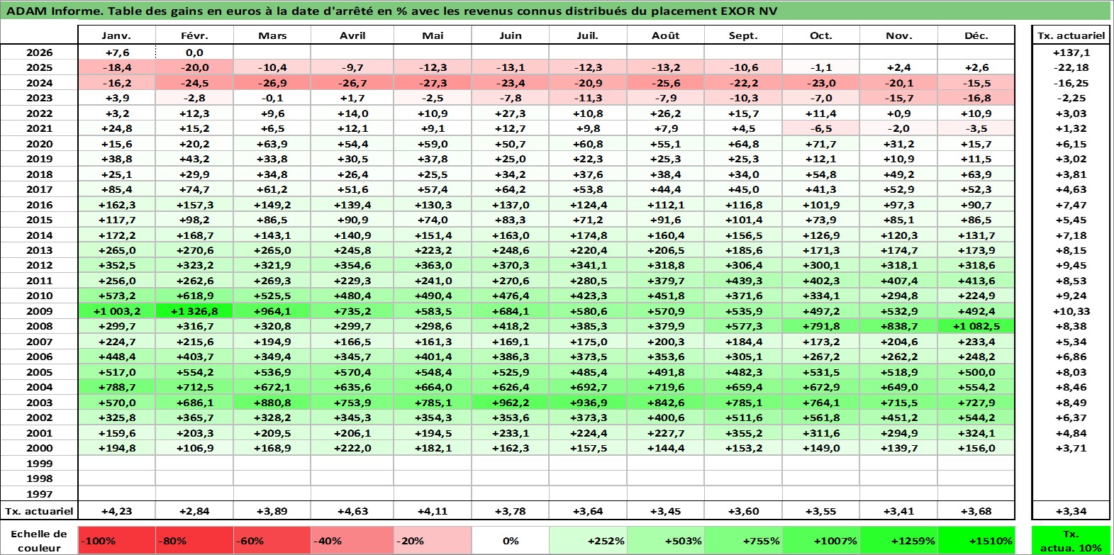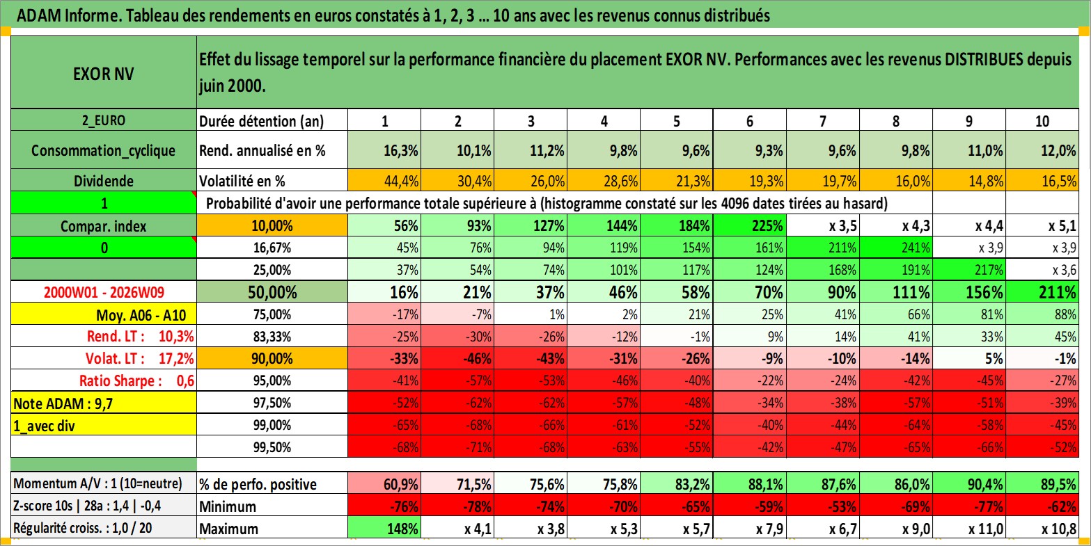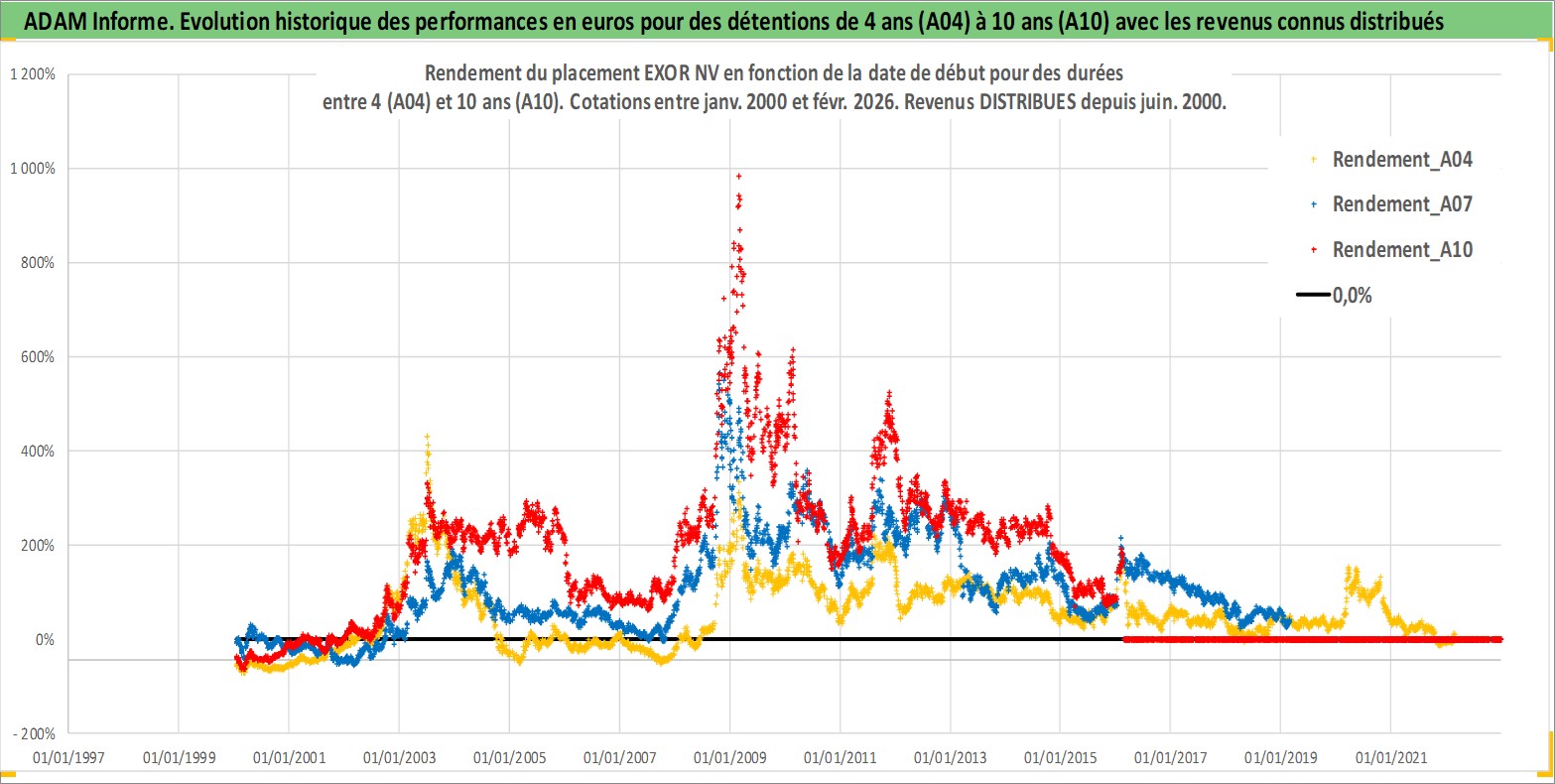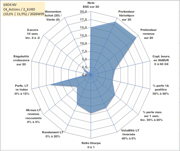 Site dédié aux investisseursPage dédiée sur site financeAnalyse des valorisations hebdomadaires de l'action EXOR NV. Cet actif est cote en EUR. Les valorisations couvrent les semaines 2000W01 a 2026W09. Les revenus de cet actif financier sont pris en compte depuis la semaine 2000W25. La note globale ESG de cet actif est estimee a 15.0 (apres rebasage entre 0 et 20).