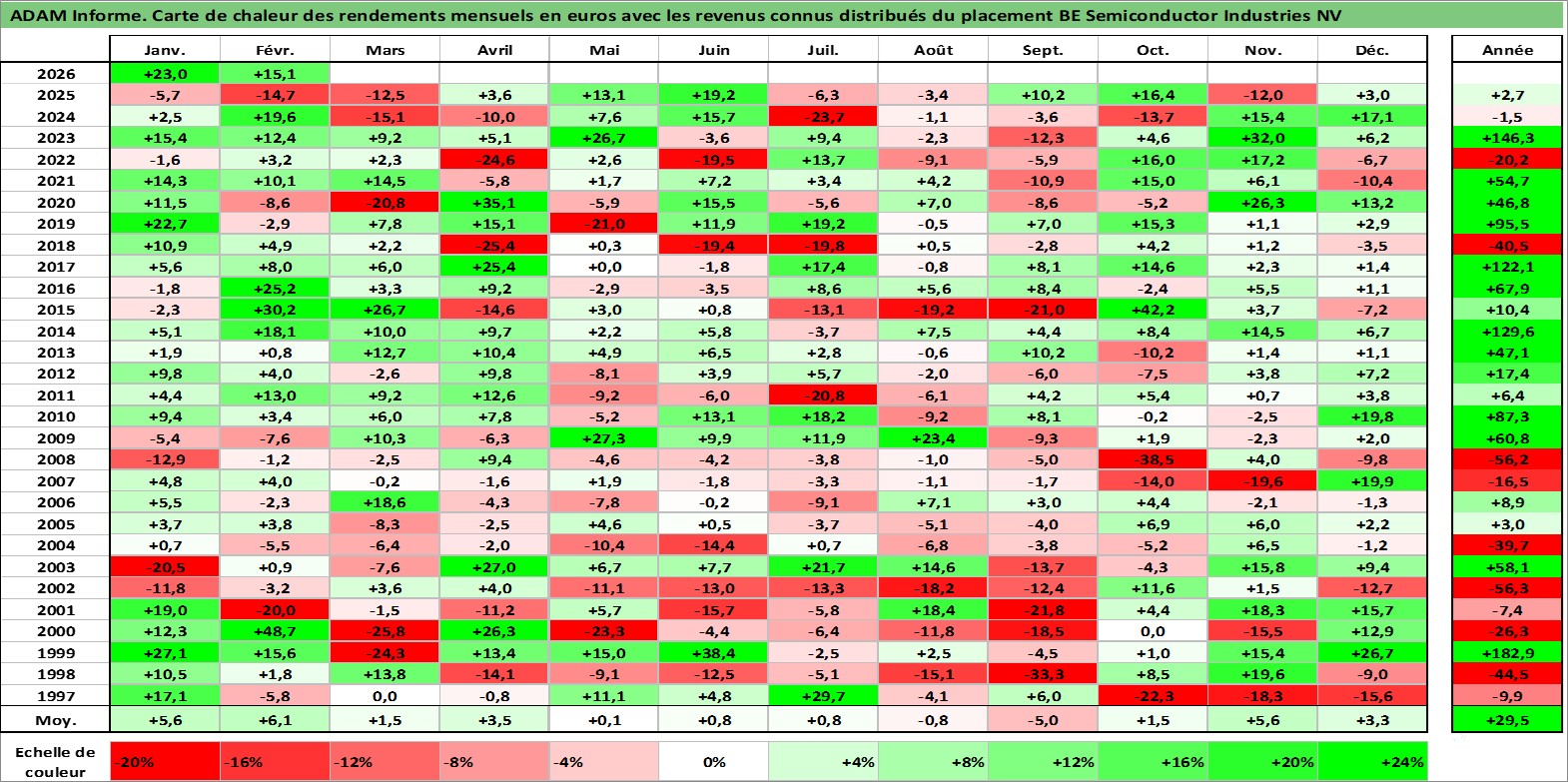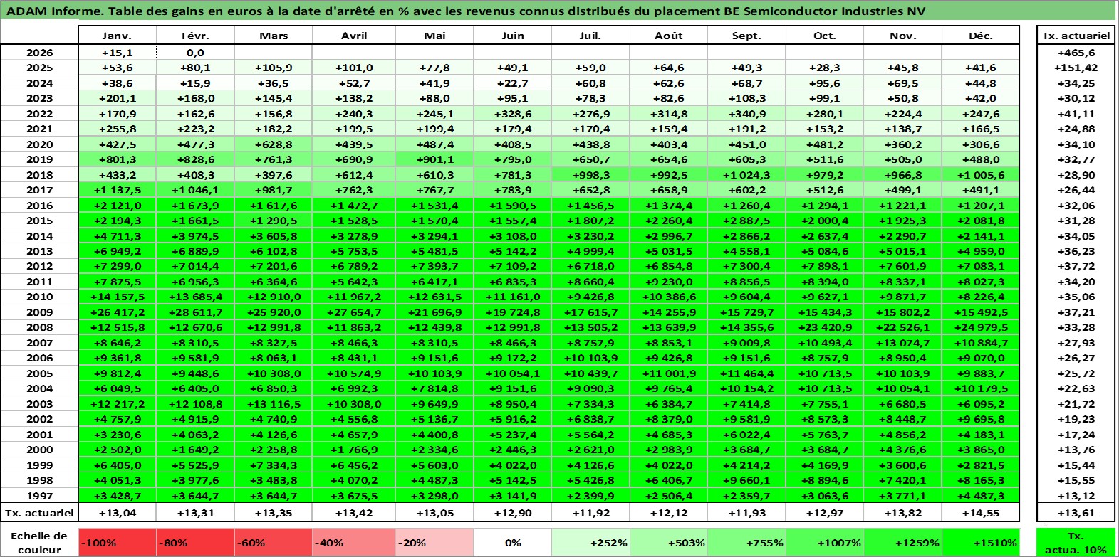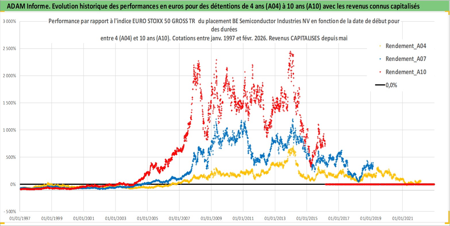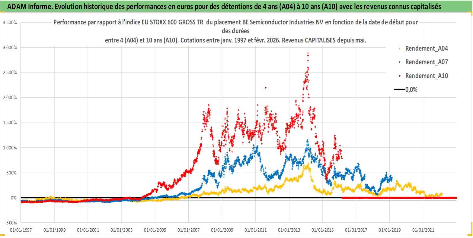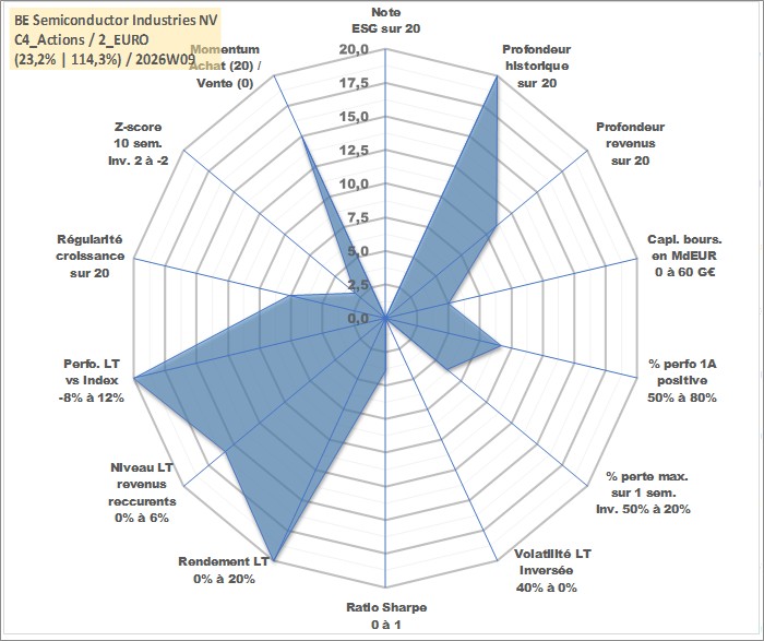 Site dédié aux investisseursPage dédiée sur site financeAnalyse des valorisations hebdomadaires de l'action BE Semiconductor Industries NV. Cet actif est cote en EUR. Les valorisations couvrent les semaines 1997W01 a 2026W09. Les revenus de cet actif financier sont pris en compte depuis la semaine 2011W18. La note ESG de cet actif n'est pas connue.