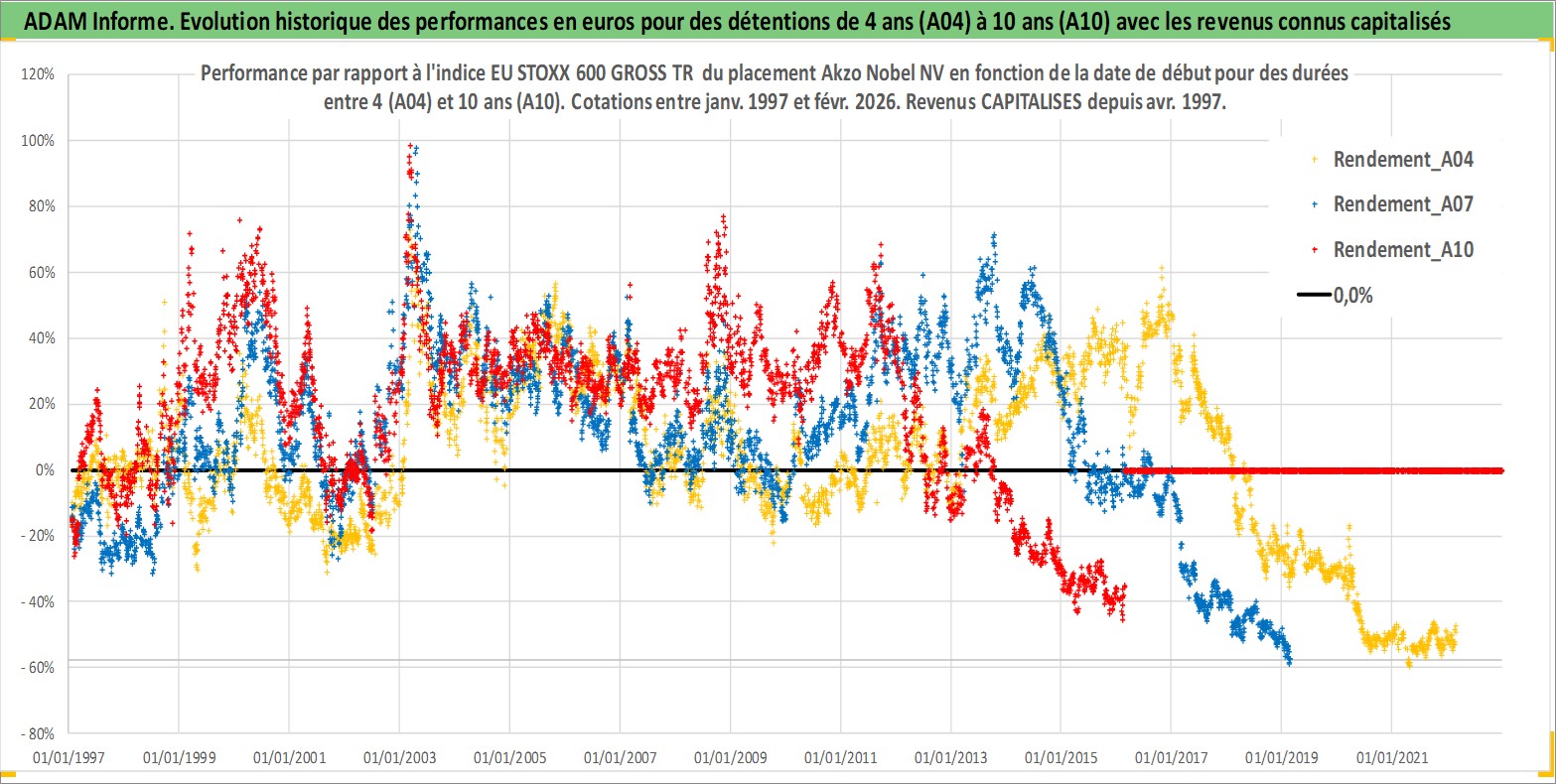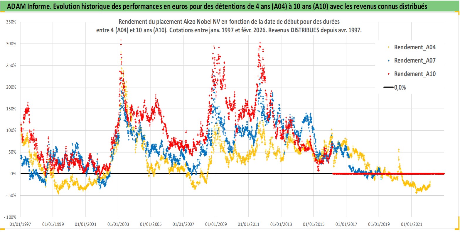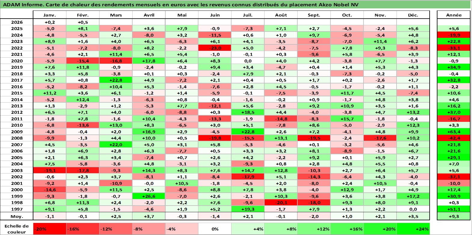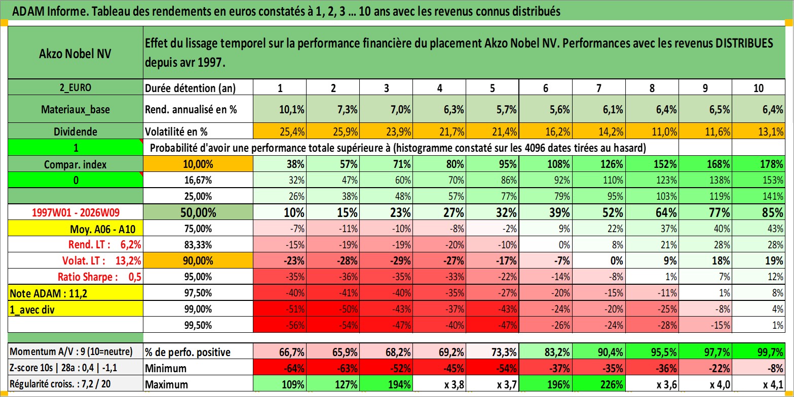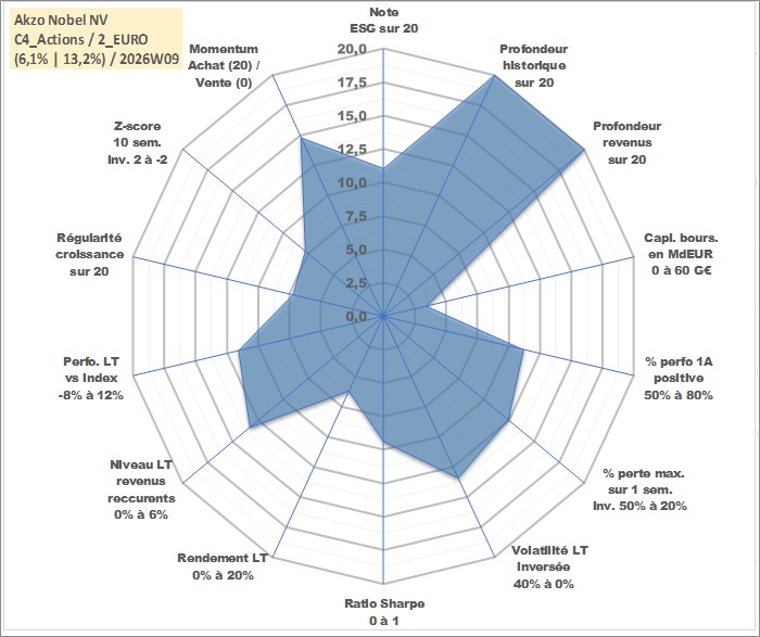 Site dédié aux investisseursPage dédiée sur site financeAnalyse des valorisations hebdomadaires de l'action Akzo Nobel NV. Cet actif est cote en EUR. Les valorisations couvrent les semaines 1997W01 a 2026W09. Les revenus de cet actif financier sont pris en compte depuis la semaine 1997W18. La note globale ESG de cet actif est estimee a 11.0 (apres rebasage entre 0 et 20).