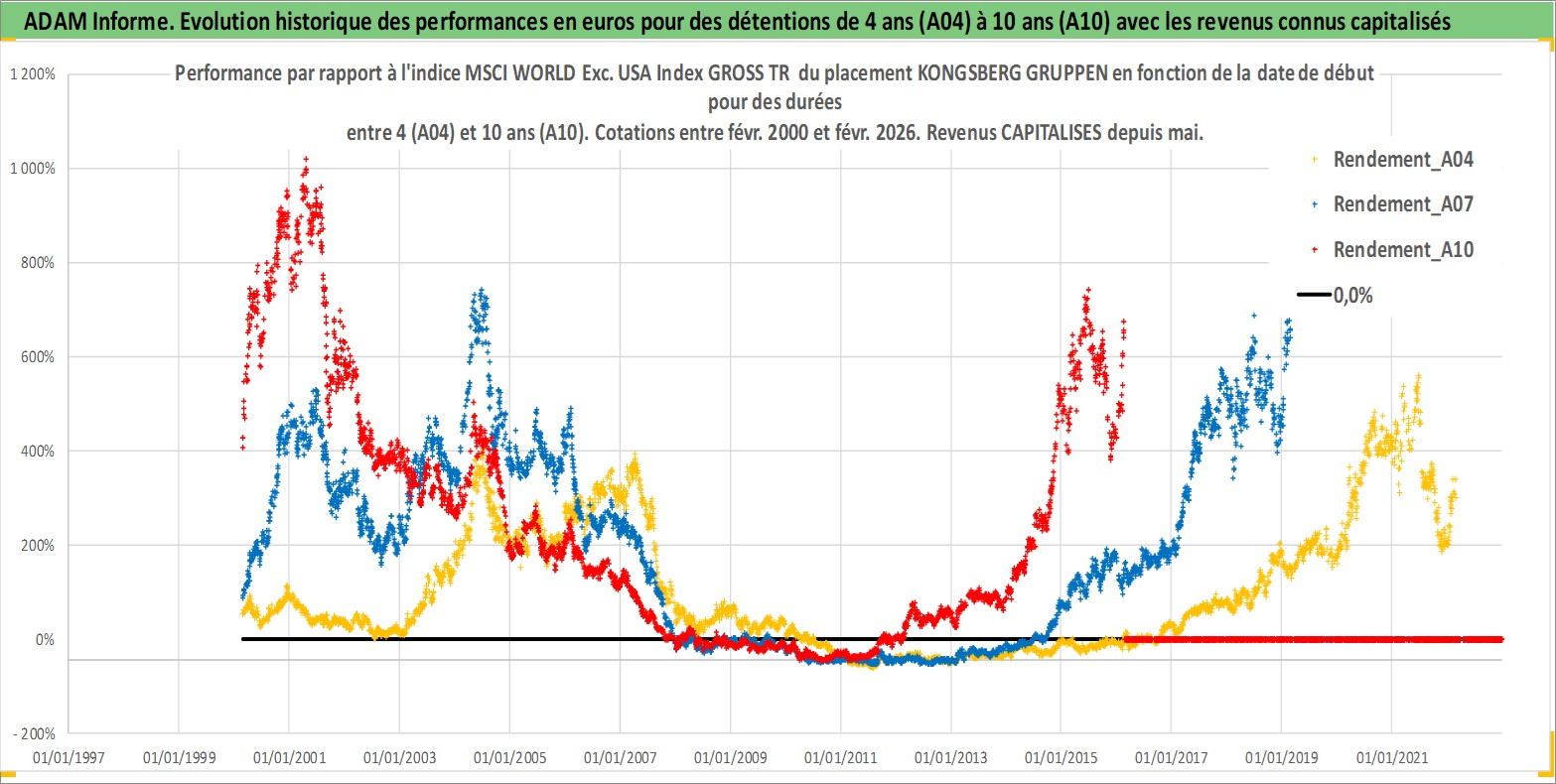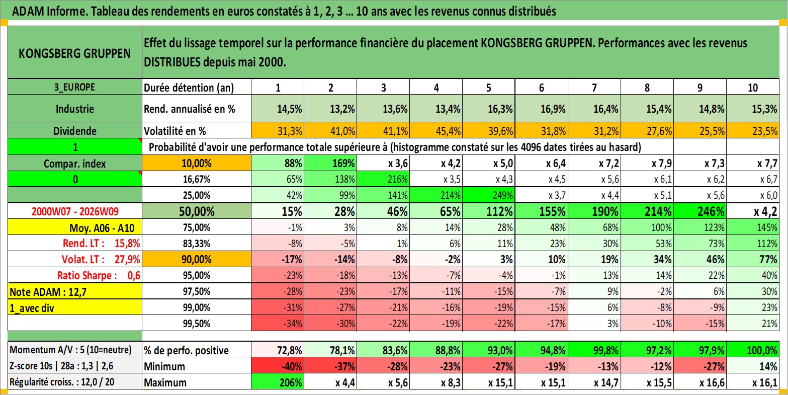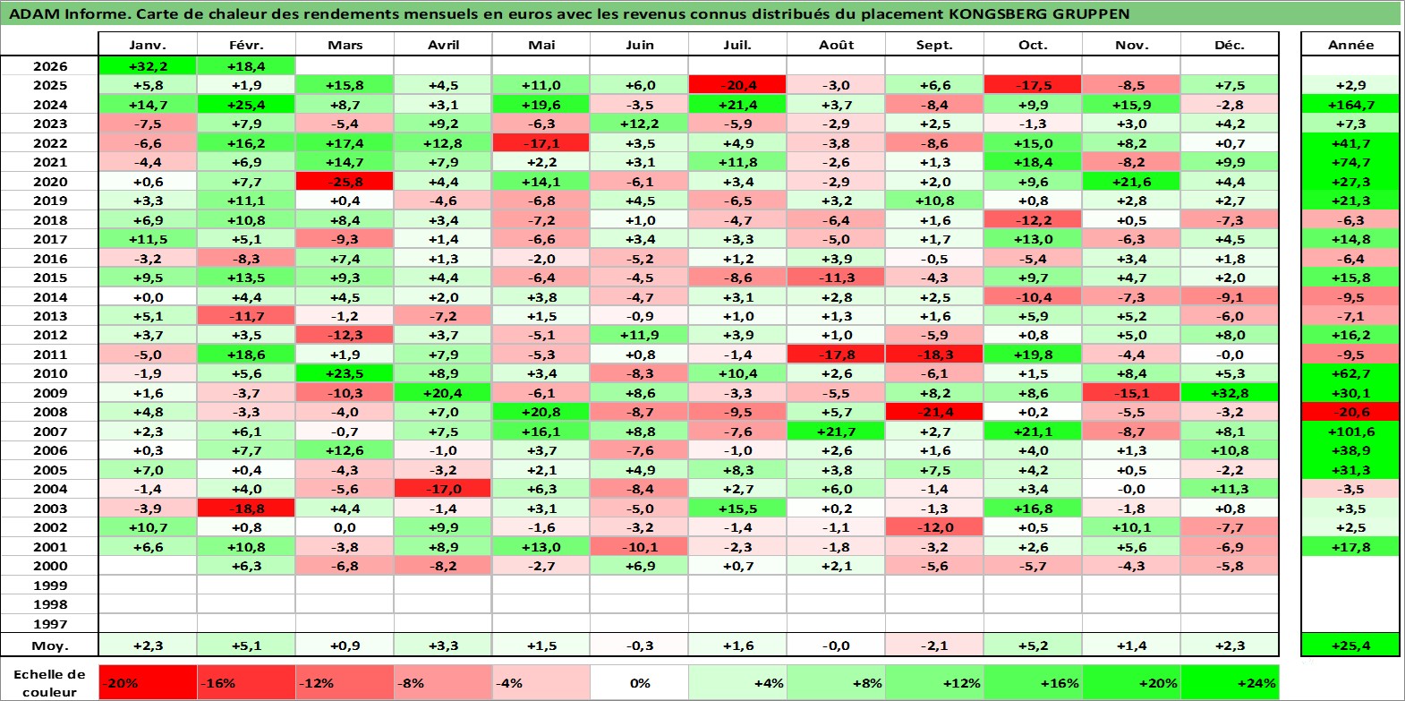 Site dédié aux investisseursPage dédiée sur site financeAnalyse des valorisations hebdomadaires de l'action KONGSBERG GRUPPEN. Cet actif est cote en NOK. Les valorisations sont en contrevaleur EURO et couvrent les semaines 2000W07 a 2026W09. Les revenus de cet actif financier sont pris en compte depuis la semaine 2000W19. La note ESG de cet actif n'est pas connue.