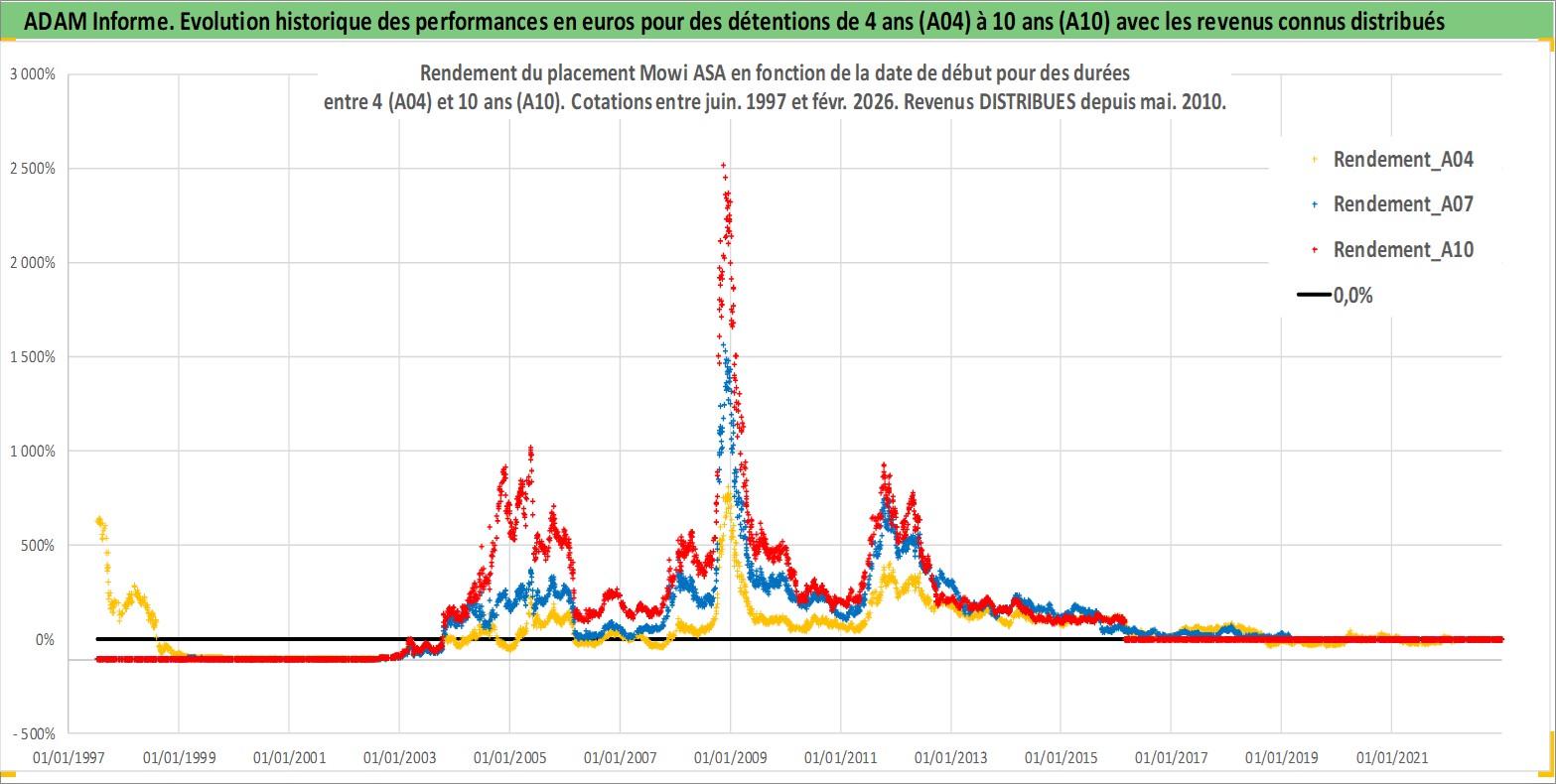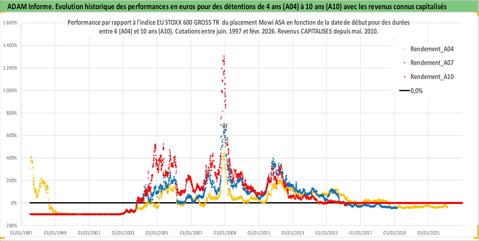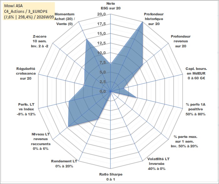 Site dédié aux investisseursPage dédiée sur site financeAnalyse des valorisations hebdomadaires de l'action Mowi ASA. Cet actif est cote en NOK. Les valorisations sont en contrevaleur EURO et couvrent les semaines 1997W27 a 2026W09. Les revenus de cet actif financier sont pris en compte depuis la semaine 2010W21. La note globale ESG de cet actif est estimee a 7.0 (apres rebasage entre 0 et 20).