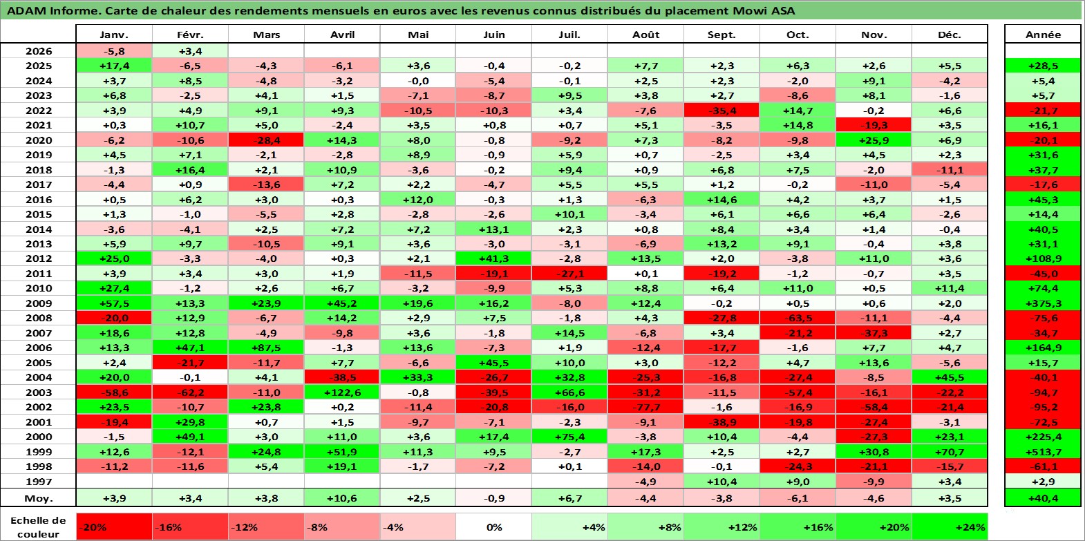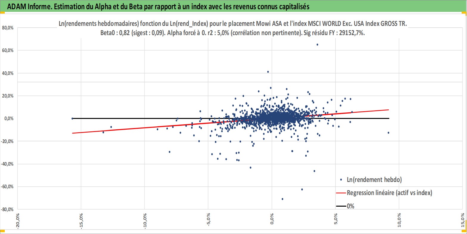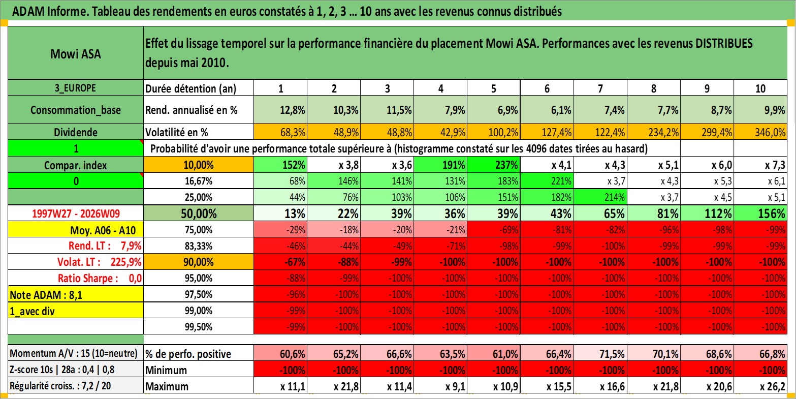Site dédié aux investisseursPage dédiée sur site financeAnalyse des valorisations hebdomadaires de l'action Mowi ASA. Cet actif est cote en NOK. Les valorisations sont en contrevaleur EURO et couvrent les semaines 1997W27 a 2026W09. Les revenus de cet actif financier sont pris en compte depuis la semaine 2010W21. La note globale ESG de cet actif est estimee a 7.0 (apres rebasage entre 0 et 20).