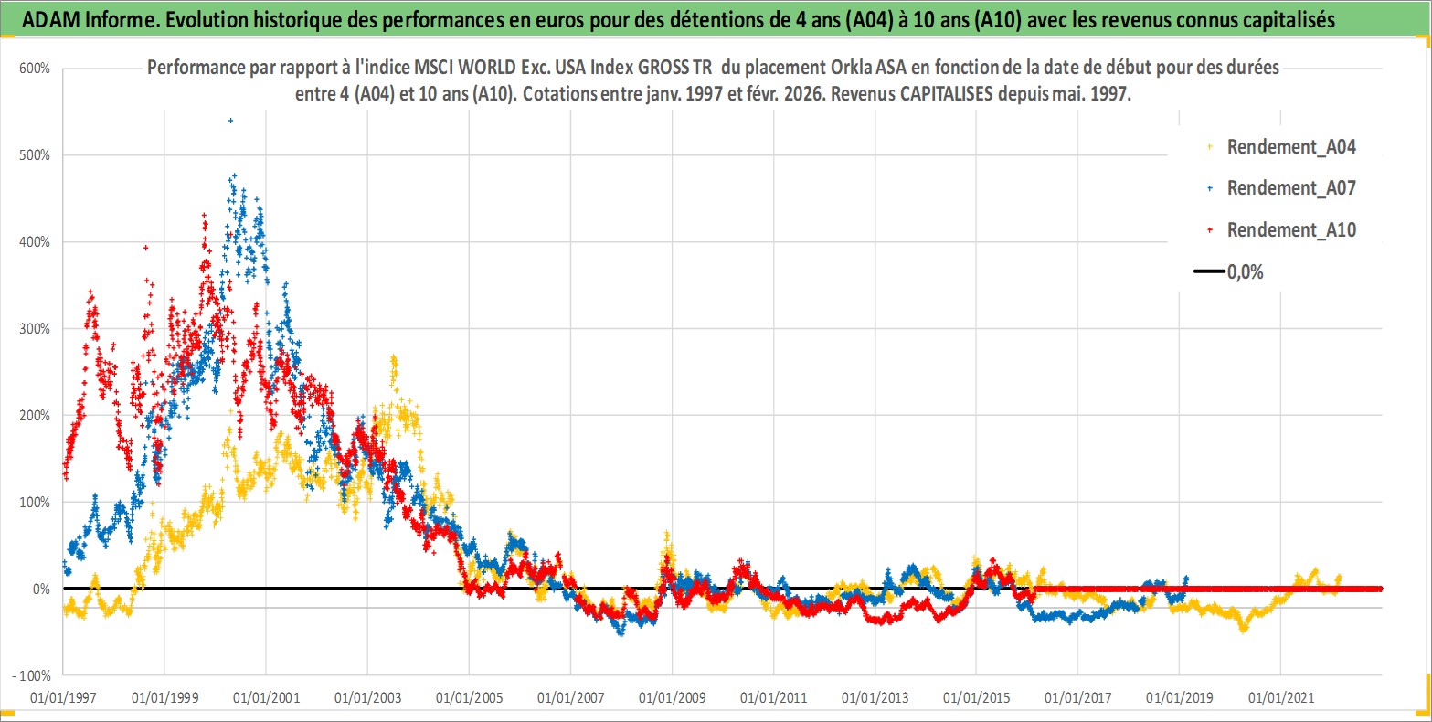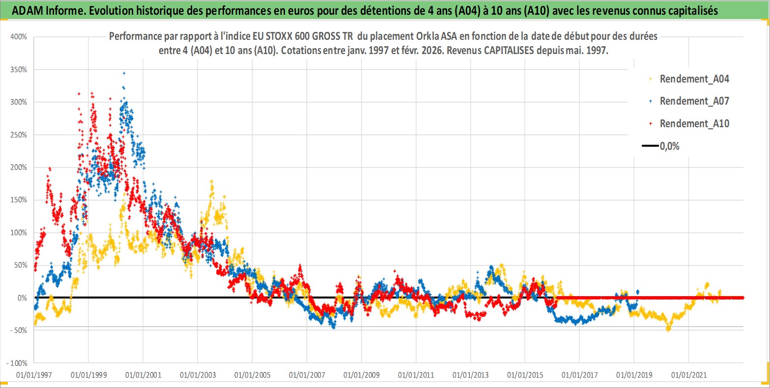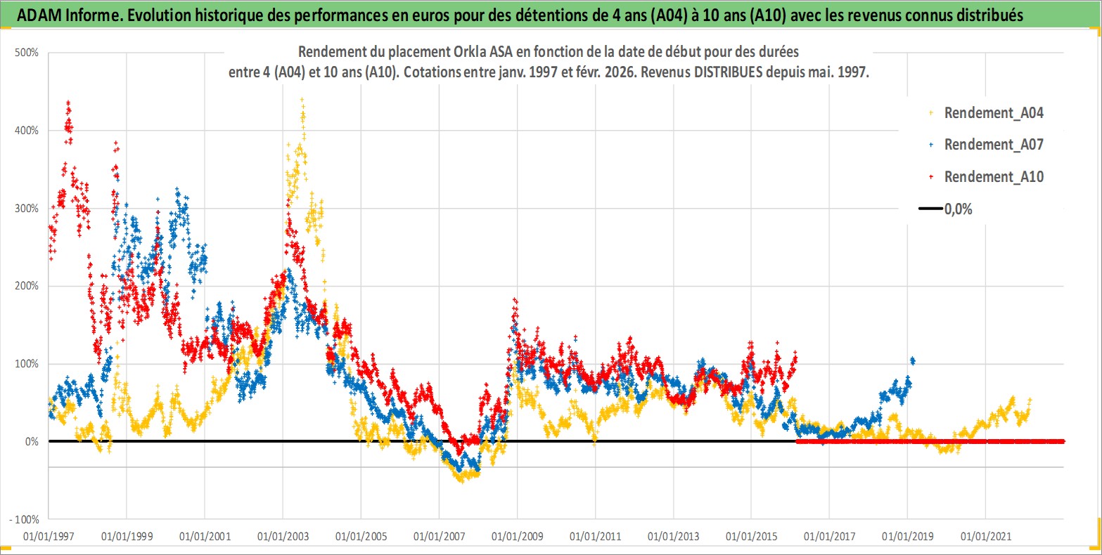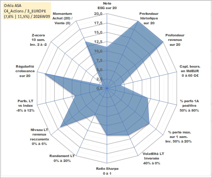 Site dédié aux investisseursPage dédiée sur site financeAnalyse des valorisations hebdomadaires de l'action Orkla ASA. Cet actif est cote en NOK. Les valorisations sont en contrevaleur EURO et couvrent les semaines 1997W01 a 2026W09. Les revenus de cet actif financier sont pris en compte depuis la semaine 1997W19. La note globale ESG de cet actif est estimee a 11.0 (apres rebasage entre 0 et 20).