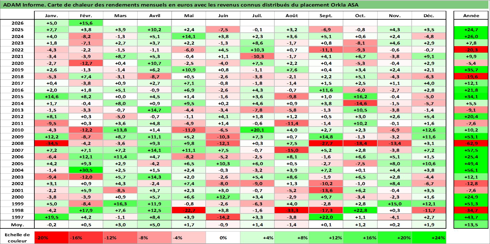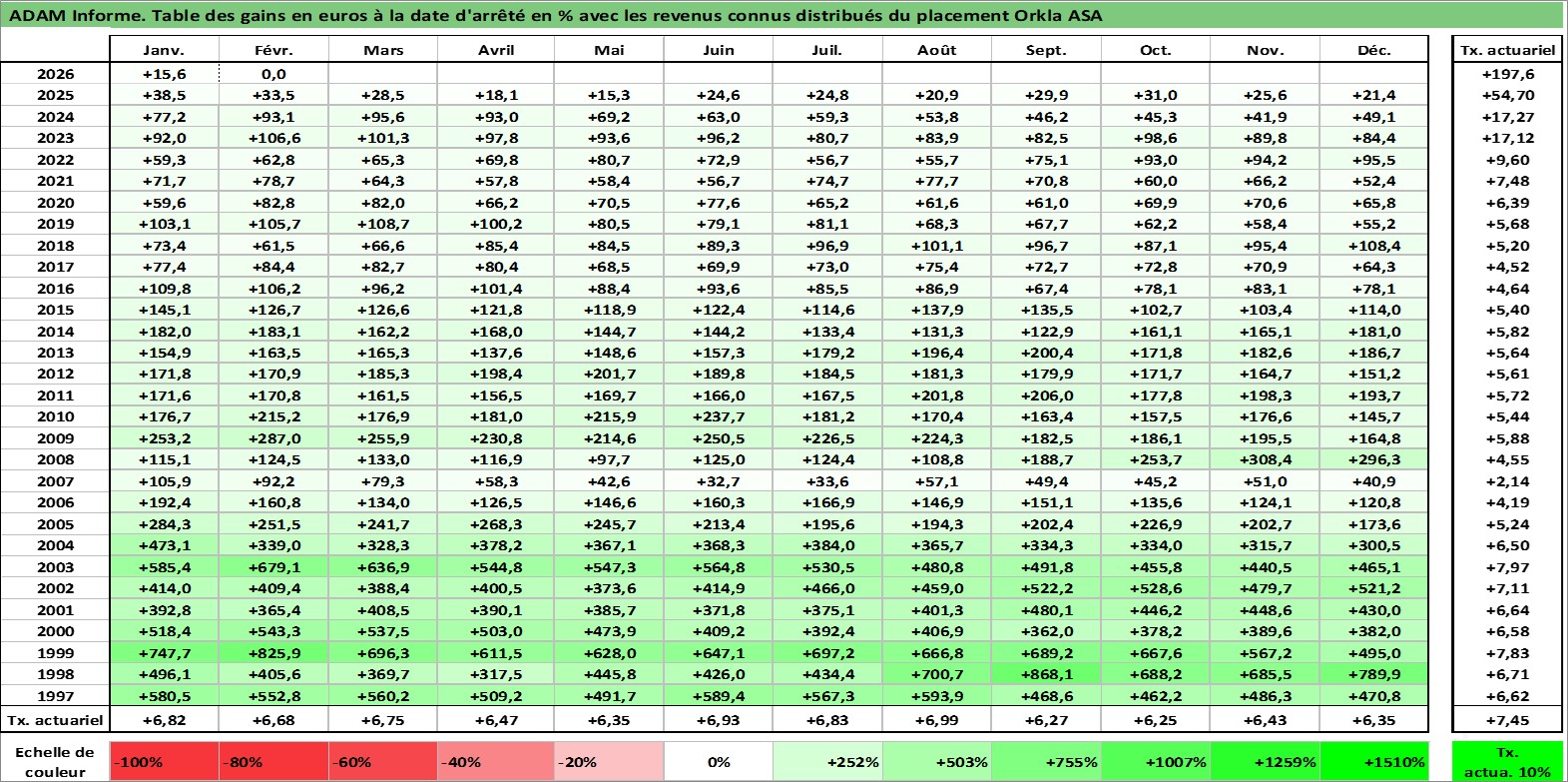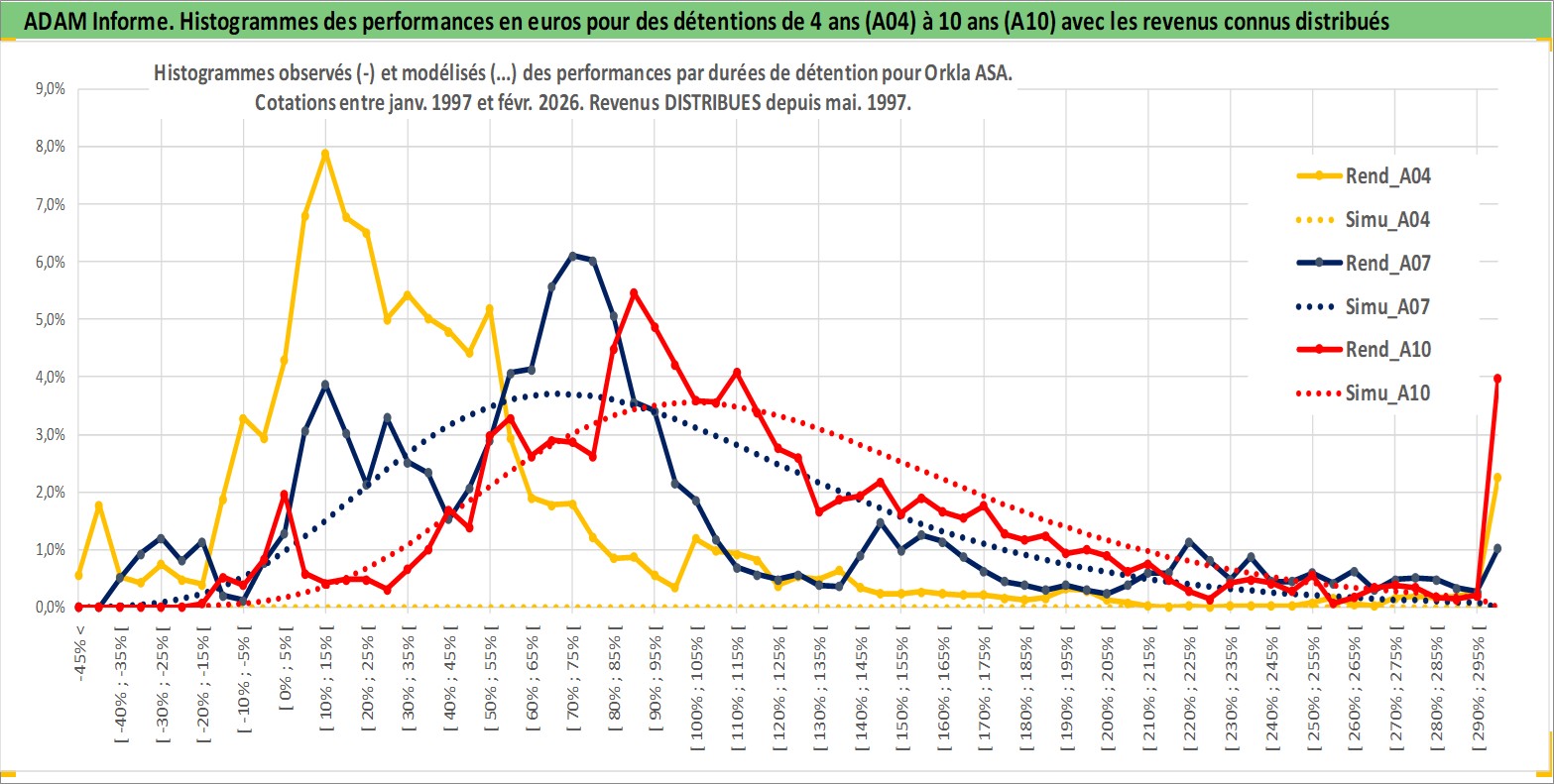 Site dédié aux investisseursPage dédiée sur site financeAnalyse des valorisations hebdomadaires de l'action Orkla ASA. Cet actif est cote en NOK. Les valorisations sont en contrevaleur EURO et couvrent les semaines 1997W01 a 2026W09. Les revenus de cet actif financier sont pris en compte depuis la semaine 1997W19. La note globale ESG de cet actif est estimee a 11.0 (apres rebasage entre 0 et 20).