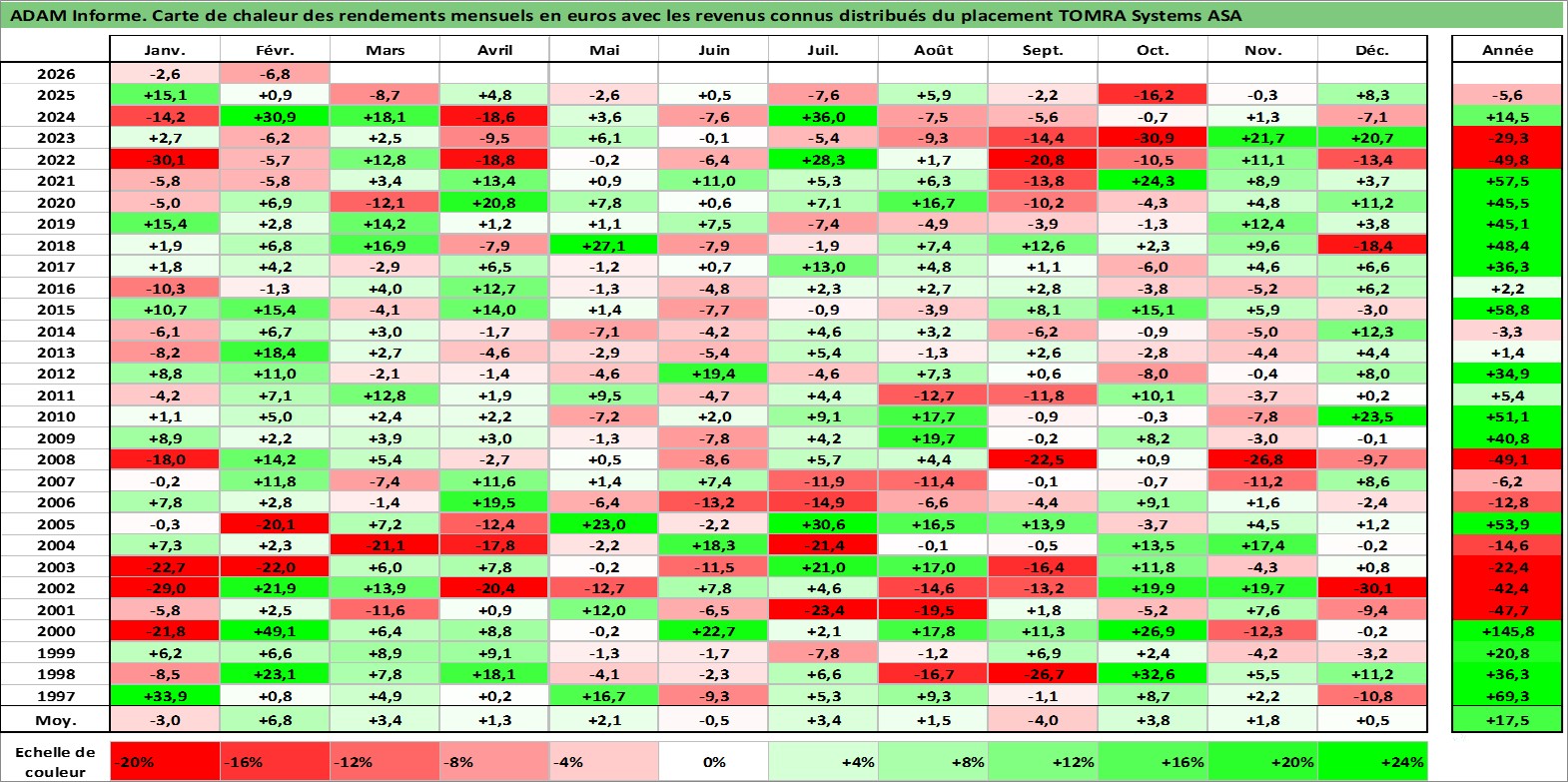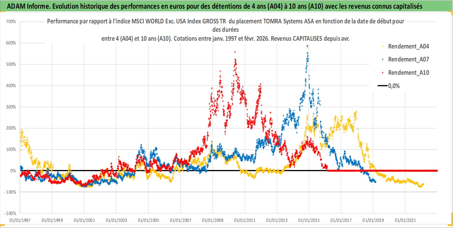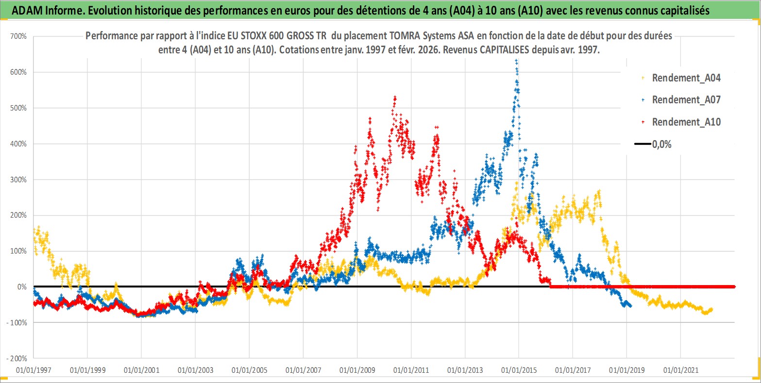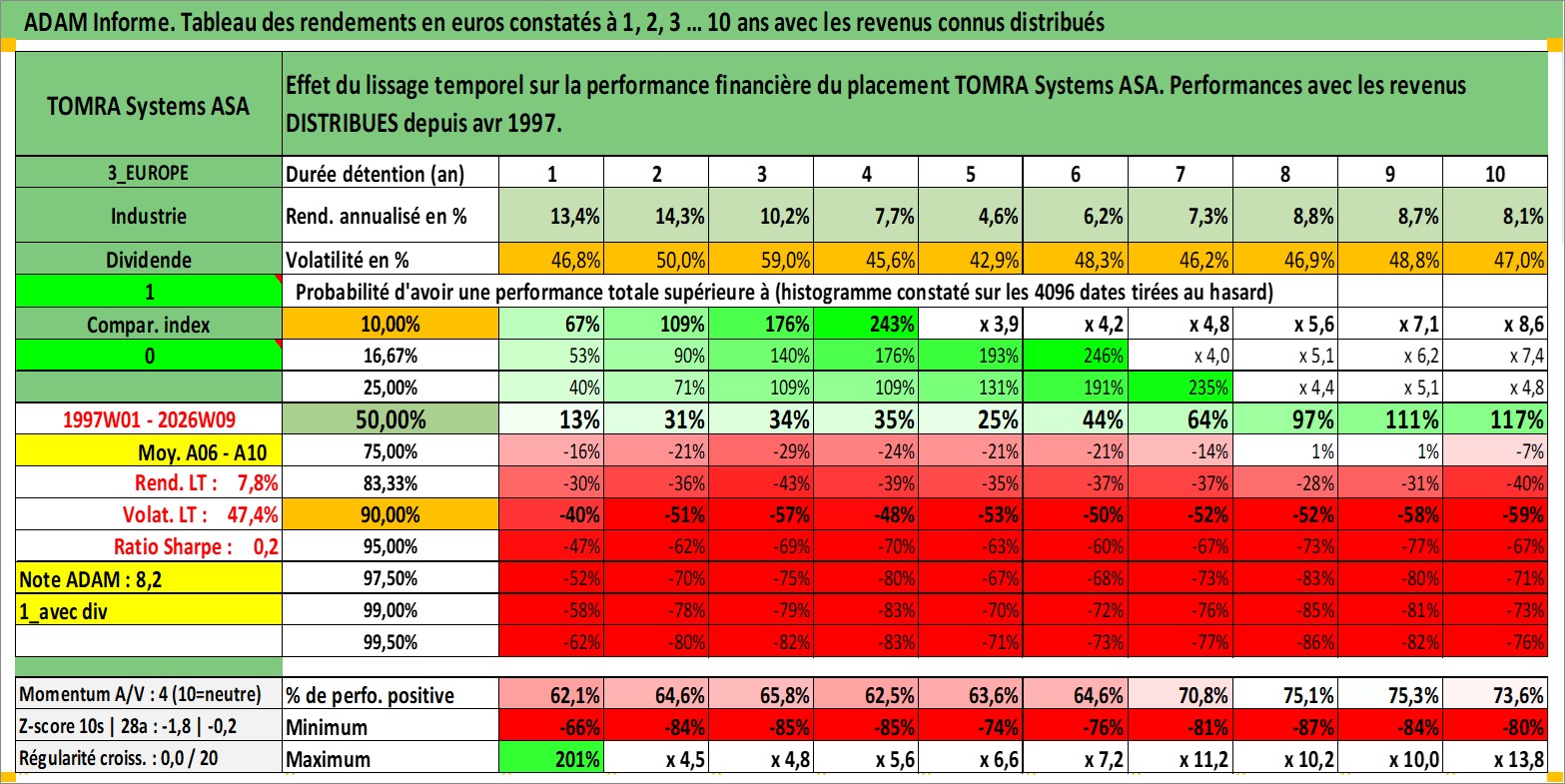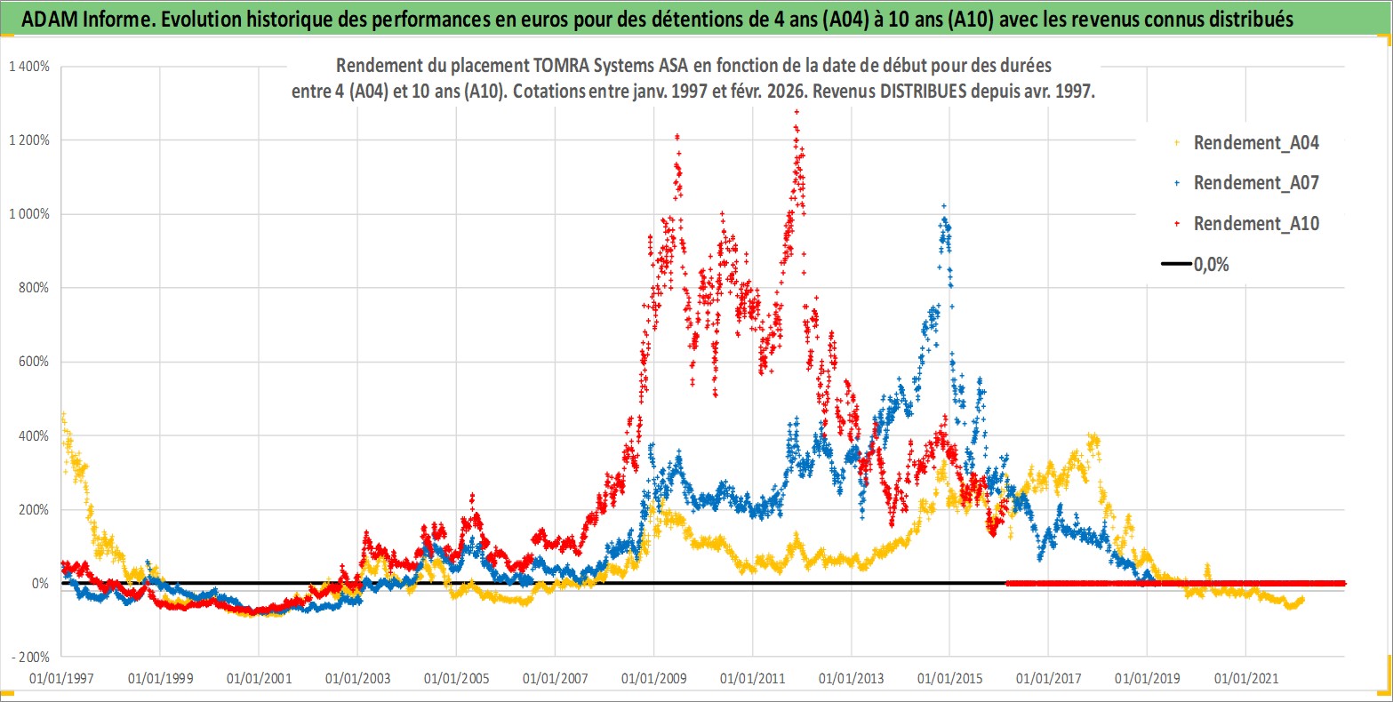 Site dédié aux investisseursPage dédiée sur site financeAnalyse des valorisations hebdomadaires de l'action TOMRA Systems ASA. Cet actif est cote en NOK. Les valorisations sont en contrevaleur EURO et couvrent les semaines 1997W01 a 2026W09. Les revenus de cet actif financier sont pris en compte depuis la semaine 1997W16. La note ESG de cet actif n'est pas connue.
