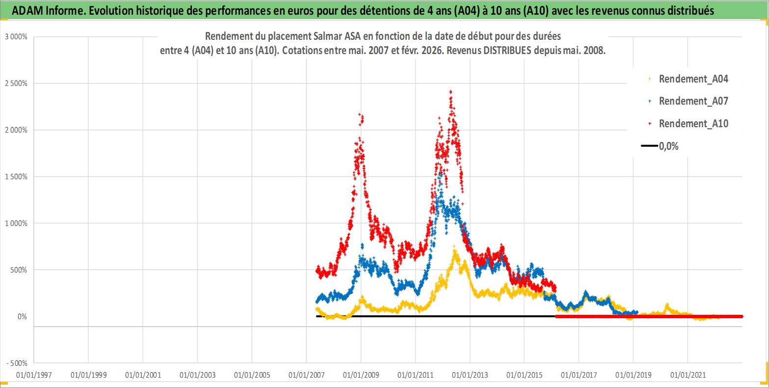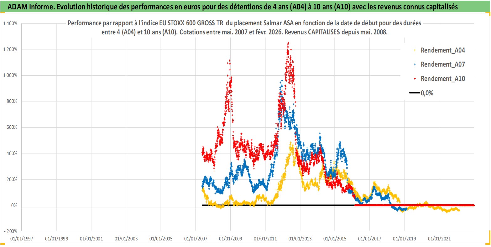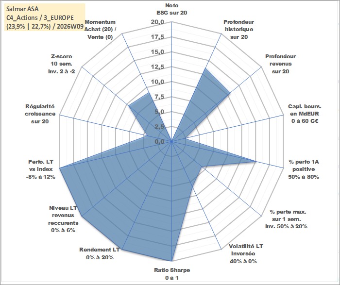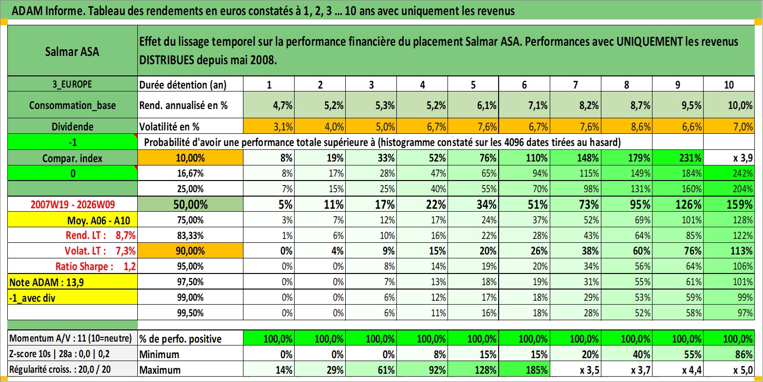 Site dédié aux investisseursPage dédiée sur site financeAnalyse des valorisations hebdomadaires de l'action Salmar ASA. Cet actif est cote en NOK. Les valorisations sont en contrevaleur EURO et couvrent les semaines 2007W19 a 2026W09. Les revenus de cet actif financier sont pris en compte depuis la semaine 2008W21. La note ESG de cet actif n'est pas connue.