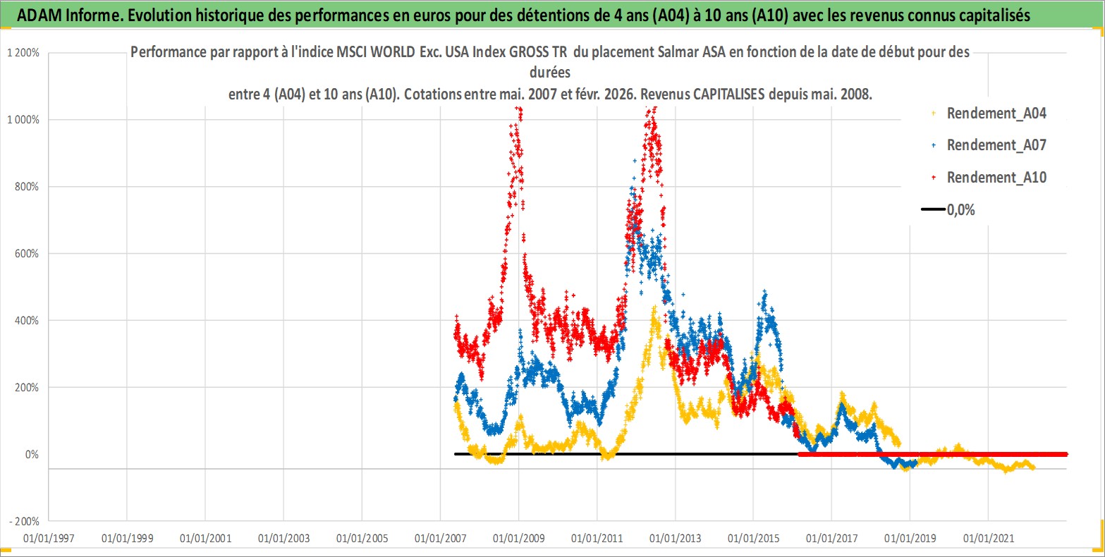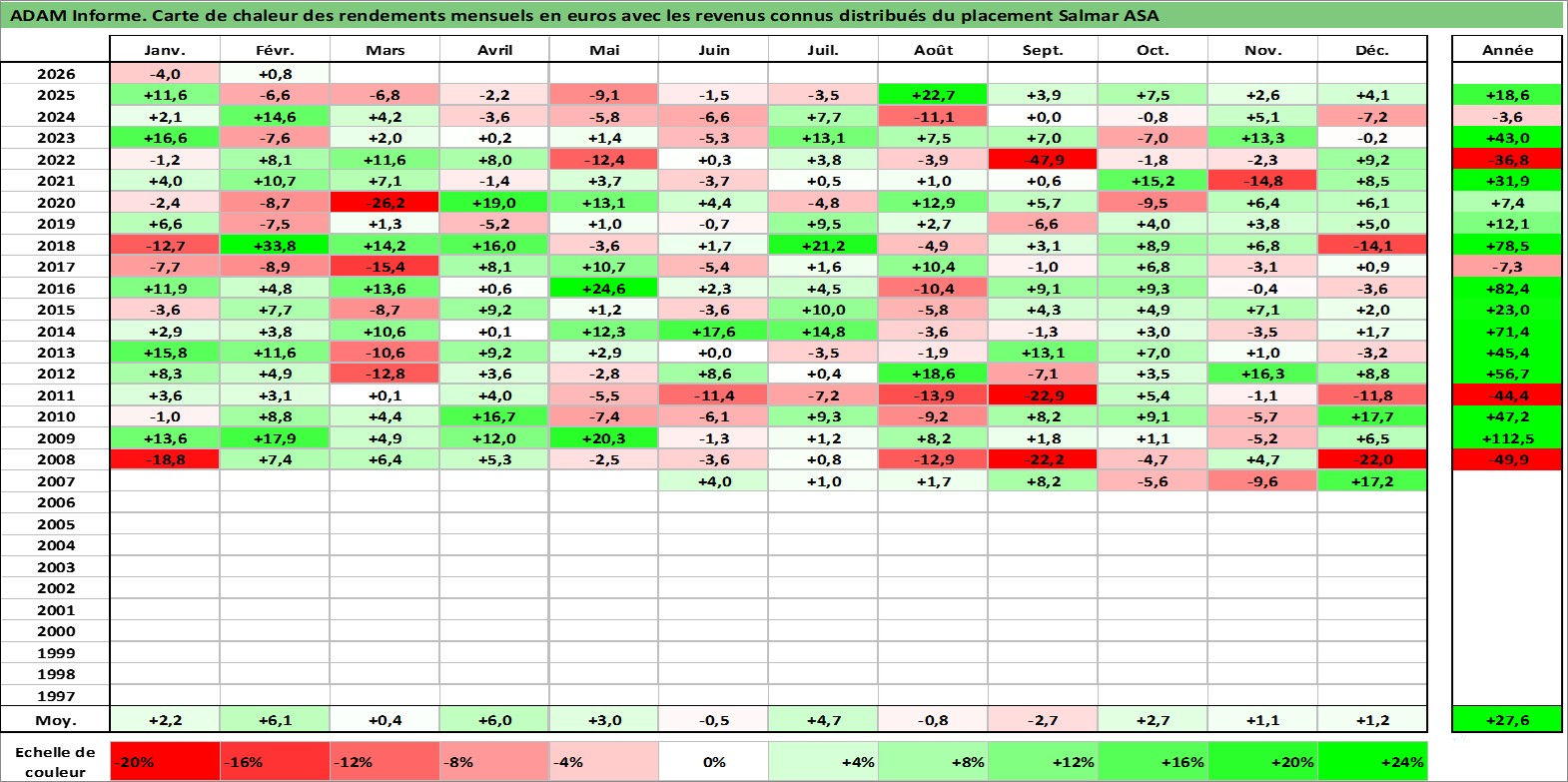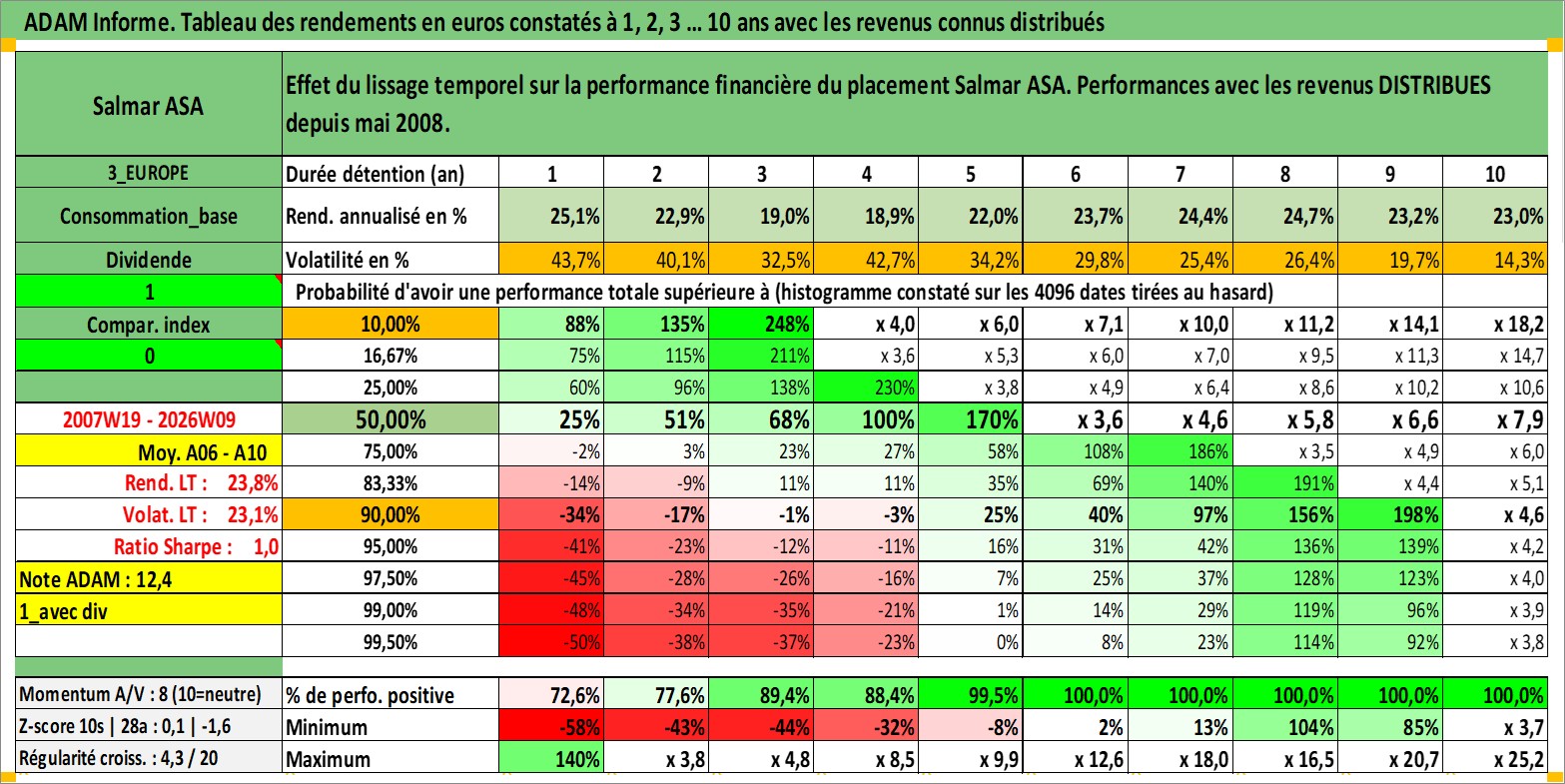 Site dédié aux investisseursPage dédiée sur site financeAnalyse des valorisations hebdomadaires de l'action Salmar ASA. Cet actif est cote en NOK. Les valorisations sont en contrevaleur EURO et couvrent les semaines 2007W19 a 2026W09. Les revenus de cet actif financier sont pris en compte depuis la semaine 2008W21. La note ESG de cet actif n'est pas connue.
