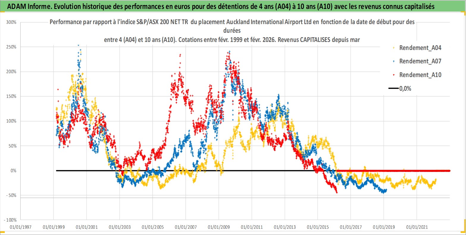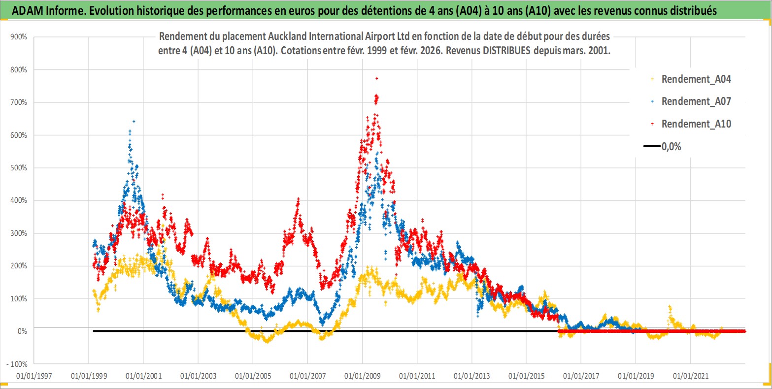 Site dédié aux investisseursPage dédiée sur site financeAnalyse des valorisations hebdomadaires de l'action Auckland International Airport Ltd. Cet actif est cote en AUD. Les valorisations sont en contrevaleur EURO et couvrent les semaines 1999W08 a 2026W09. Les revenus de cet actif financier sont pris en compte depuis la semaine 2001W11. La note globale ESG de cet actif est estimee a 11.0 (apres rebasage entre 0 et 20).