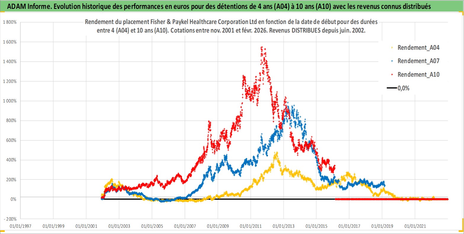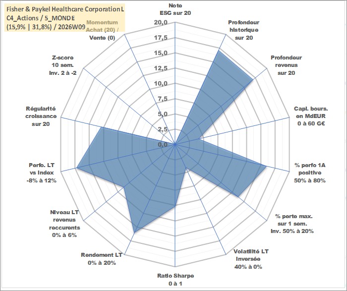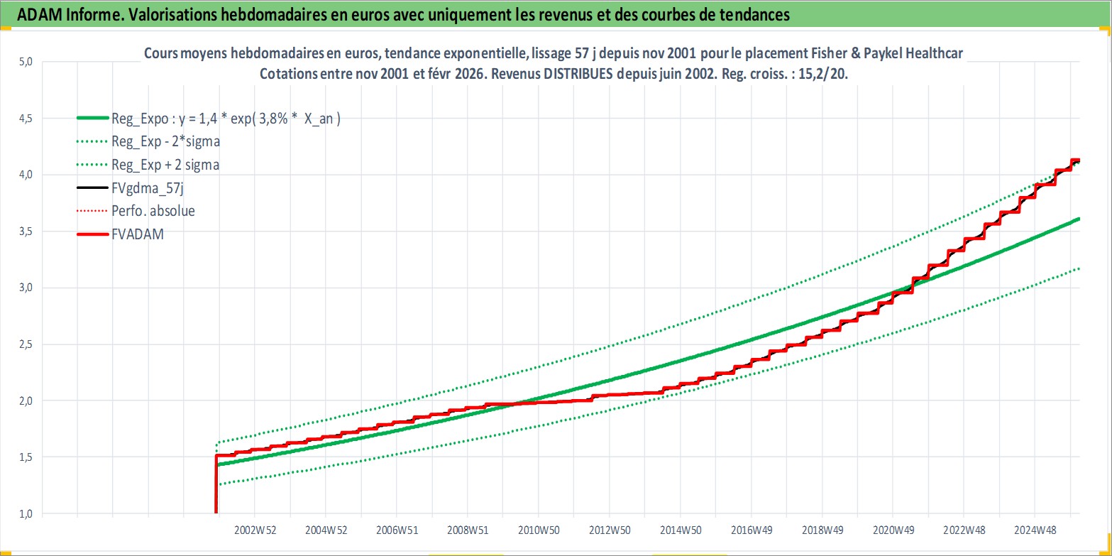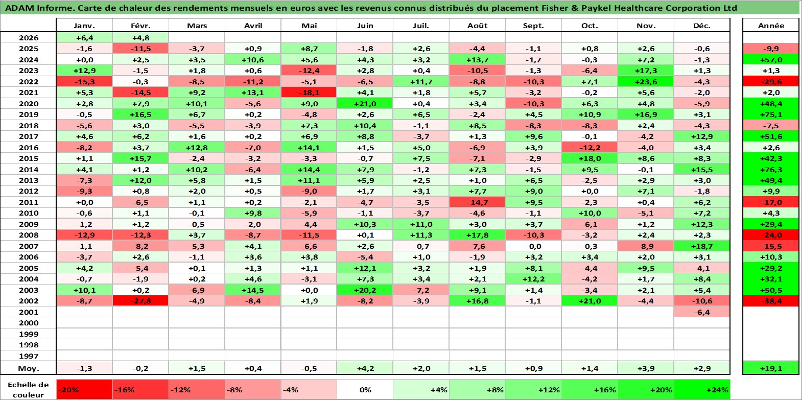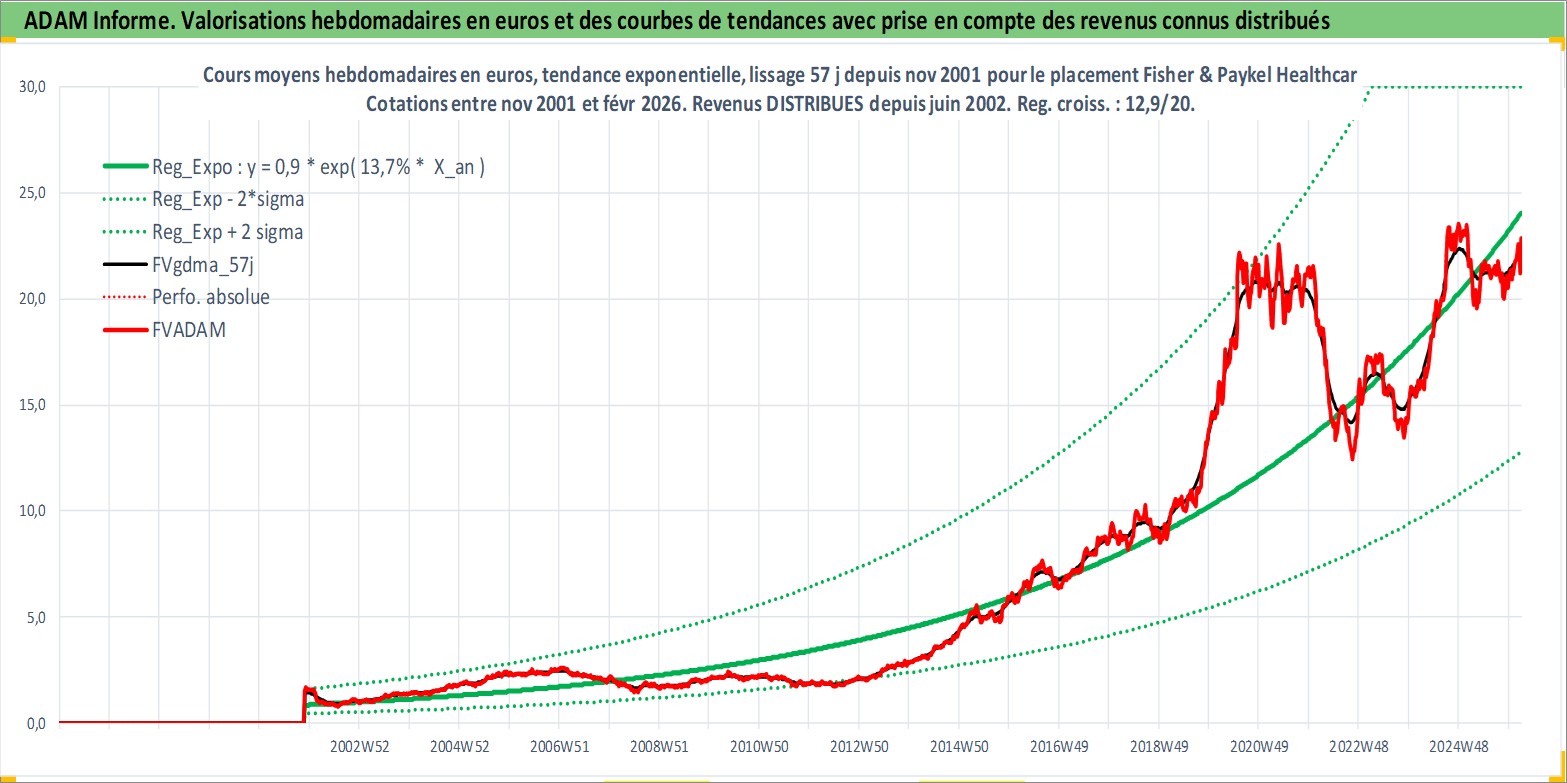 Site dédié aux investisseursPage dédiée sur site financeAnalyse des valorisations hebdomadaires de l'action Fisher & Paykel Healthcare Corporation Ltd. Cet actif est cote en AUD. Les valorisations sont en contrevaleur EURO et couvrent les semaines 2001W47 a 2026W09. Les revenus de cet actif financier sont pris en compte depuis la semaine 2002W23. La note ESG de cet actif n'est pas connue.