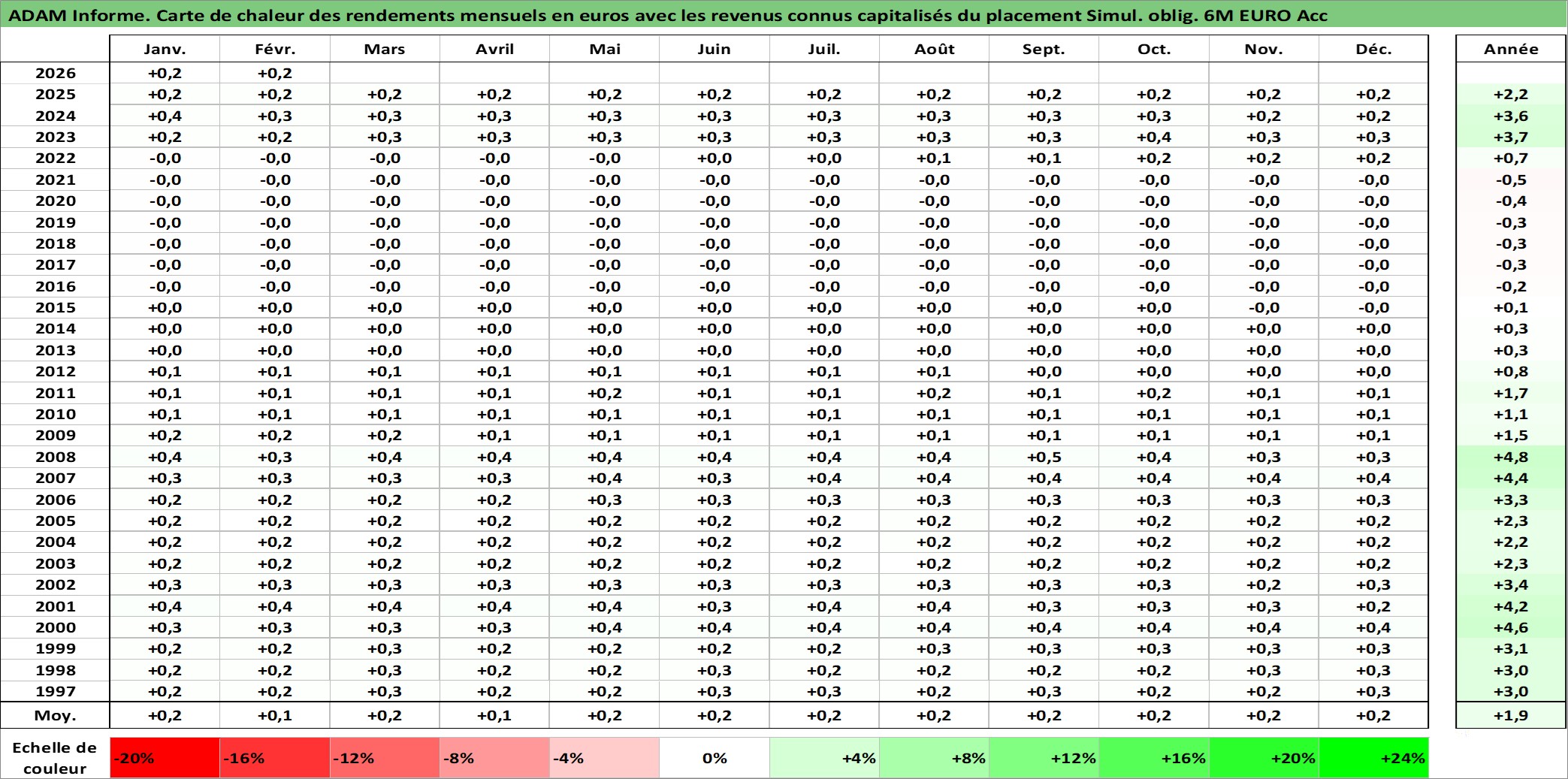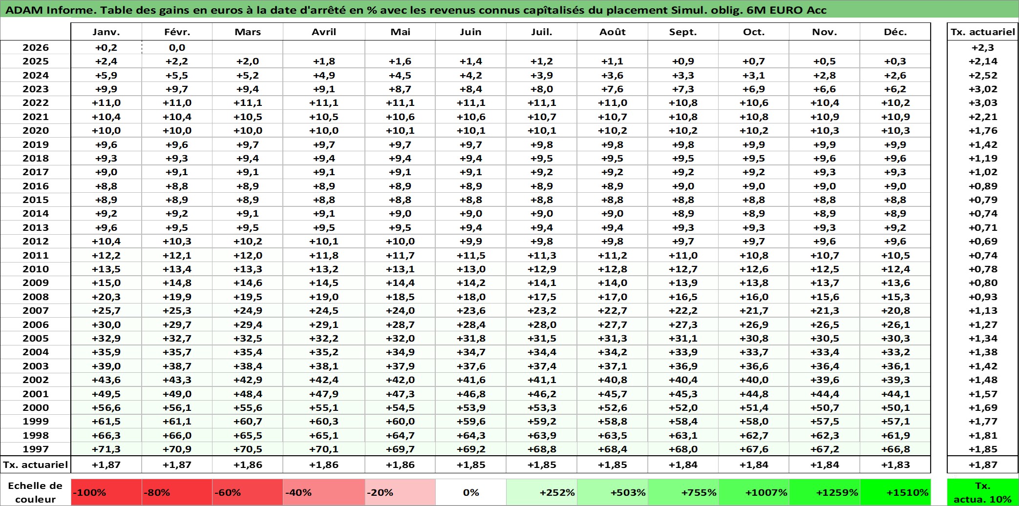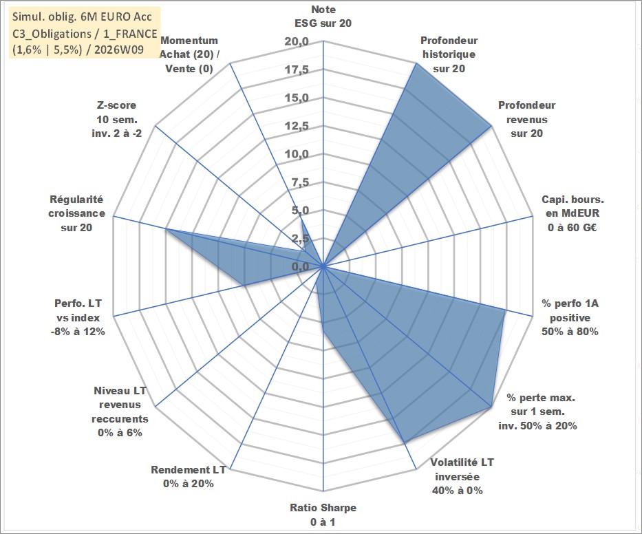 Site dédié aux investisseursPage dédiée sur site financeAnalyse des valorisations hebdomadaires de l'action Simul. oblig. 6M EURO Acc. Cet actif est cote en EUR. Les valorisations couvrent les semaines 1997W01 a 2026W09. Les revenus de cet actif financier sont pris en compte depuis la semaine 1997W01. La note ESG de cet actif n'est pas connue.