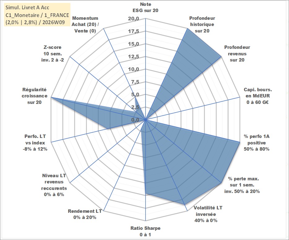 Site dédié aux investisseursPage dédiée sur site financeAnalyse des valorisations hebdomadaires de l'action Simul. Livret A Acc. Cet actif est cote en EUR. Les valorisations couvrent les semaines 1997W01 a 2026W09. Les revenus de cet actif financier sont pris en compte depuis la semaine 1997W01. La note ESG de cet actif n'est pas connue.