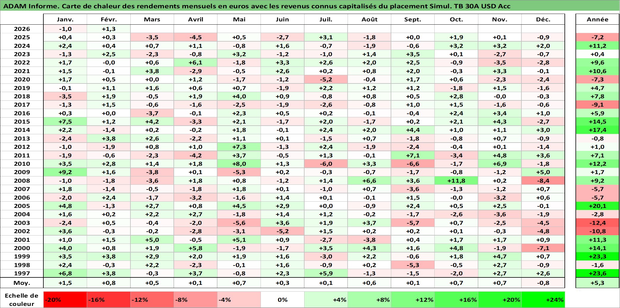 Site dédié aux investisseursPage dédiée sur site financeAnalyse des valorisations hebdomadaires de l'action Simul. TB 30A USD Acc. Cet actif est cote en USD. Les valorisations sont en contrevaleur EURO et couvrent les semaines 1997W01 a 2026W09. Les revenus de cet actif financier sont pris en compte depuis la semaine 1997W01. La note ESG de cet actif n'est pas connue.