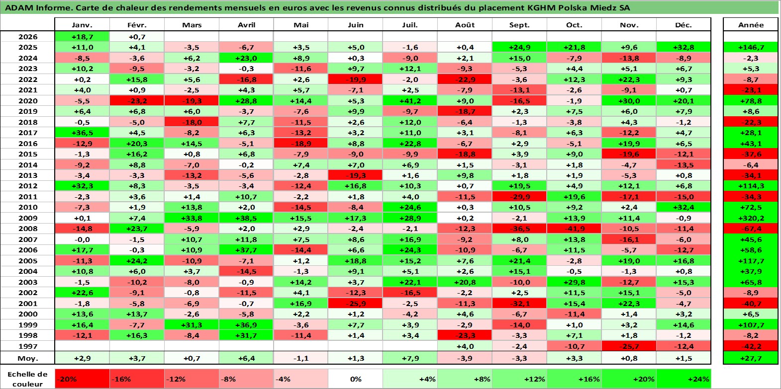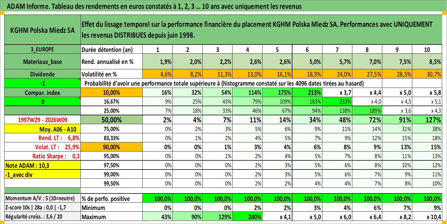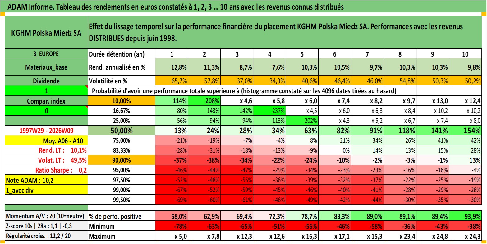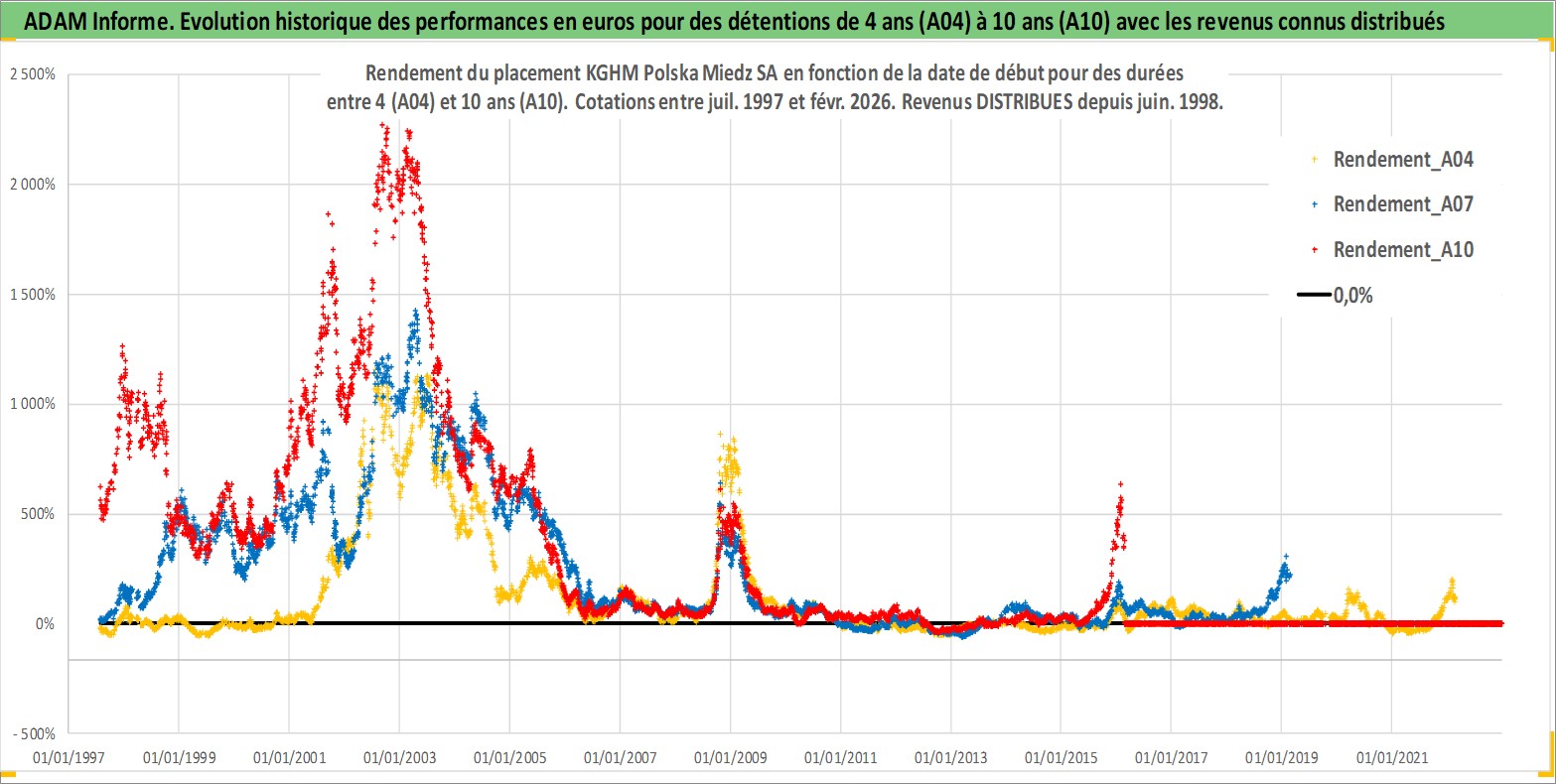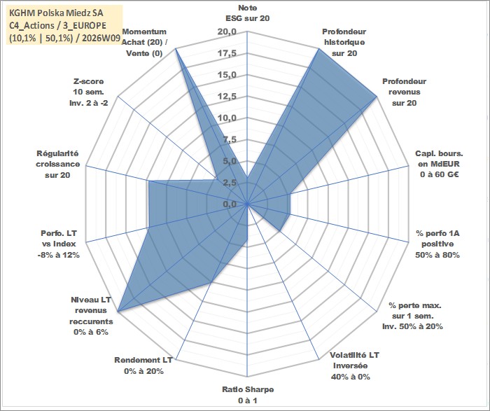 Site dédié aux investisseursPage dédiée sur site financeAnalyse des valorisations hebdomadaires de l'action KGHM Polska Miedz SA. Cet actif est cote en PLN. Les valorisations sont en contrevaleur EURO et couvrent les semaines 1997W29 a 2026W09. Les revenus de cet actif financier sont pris en compte depuis la semaine 1998W26. La note globale ESG de cet actif est estimee a 3.0 (apres rebasage entre 0 et 20).