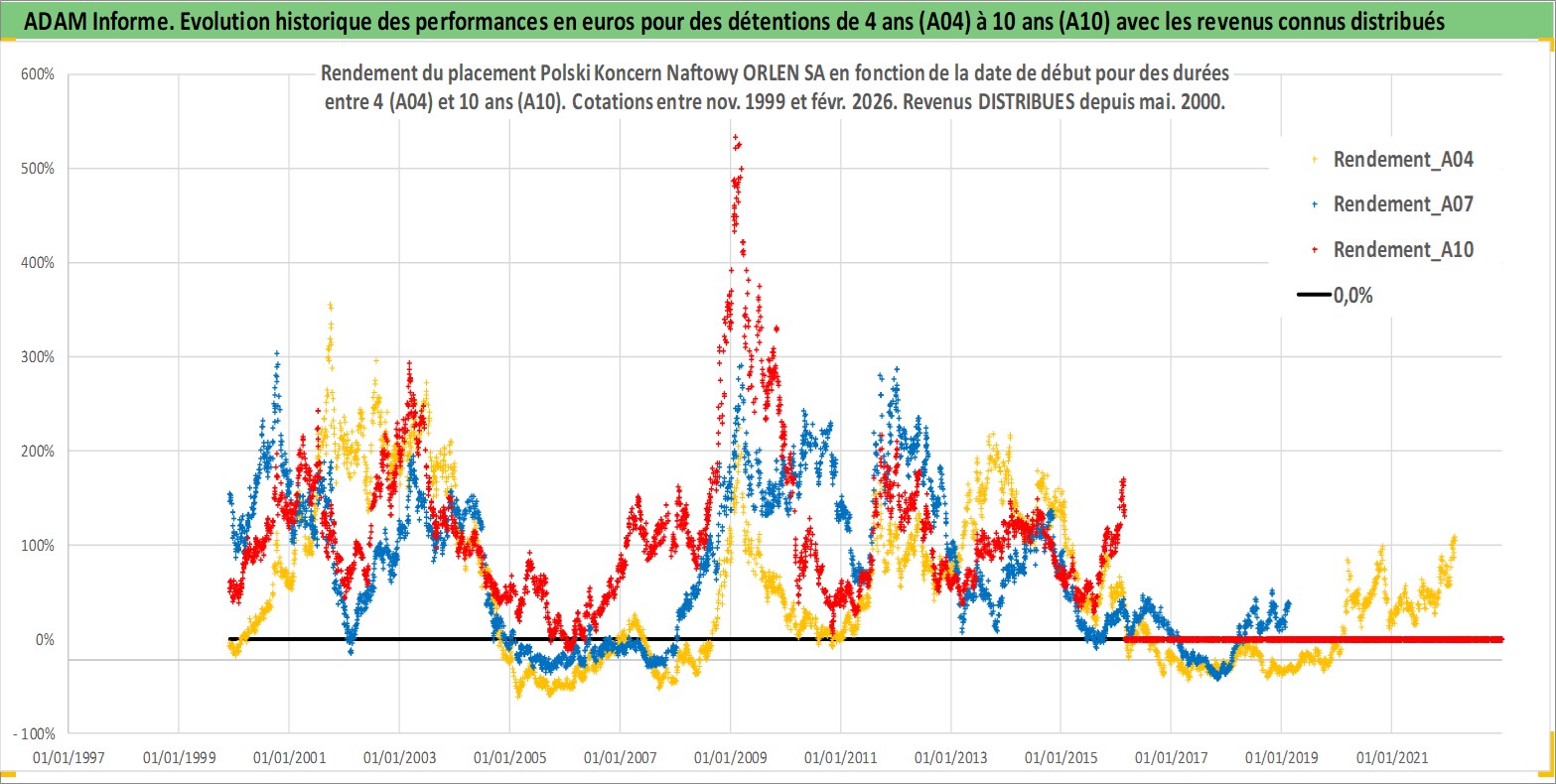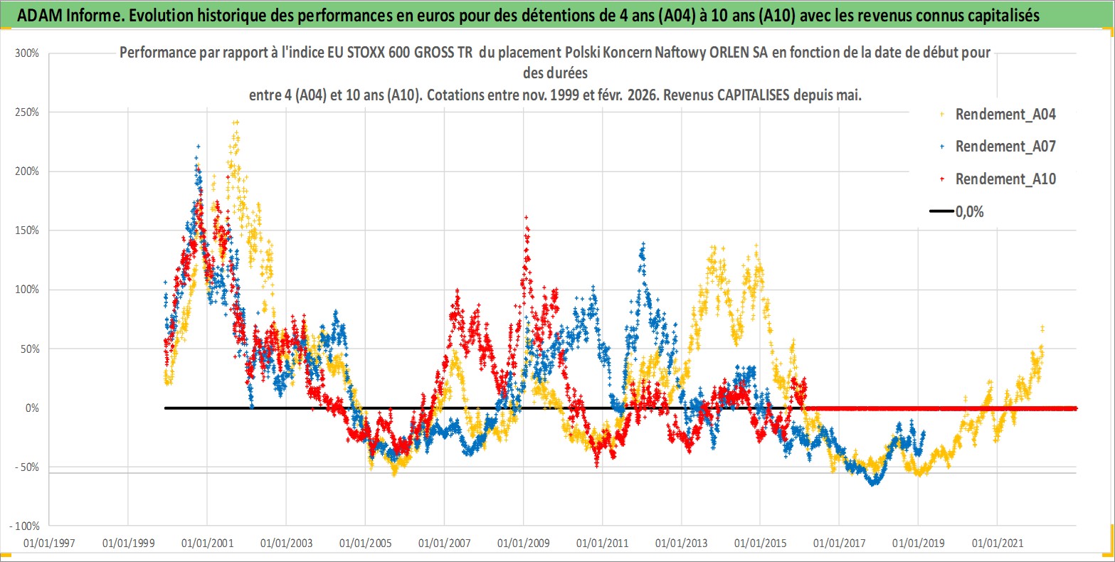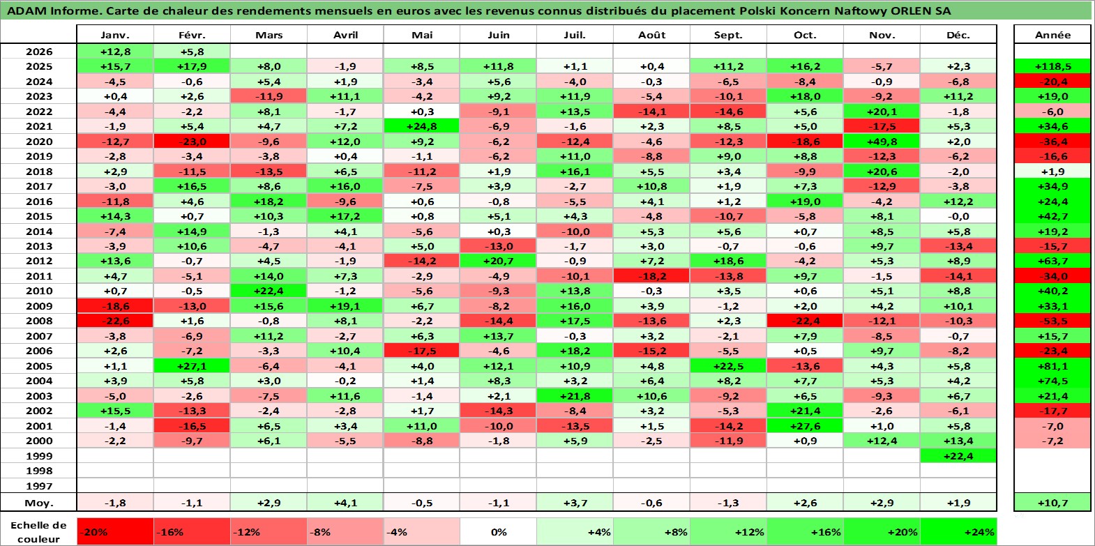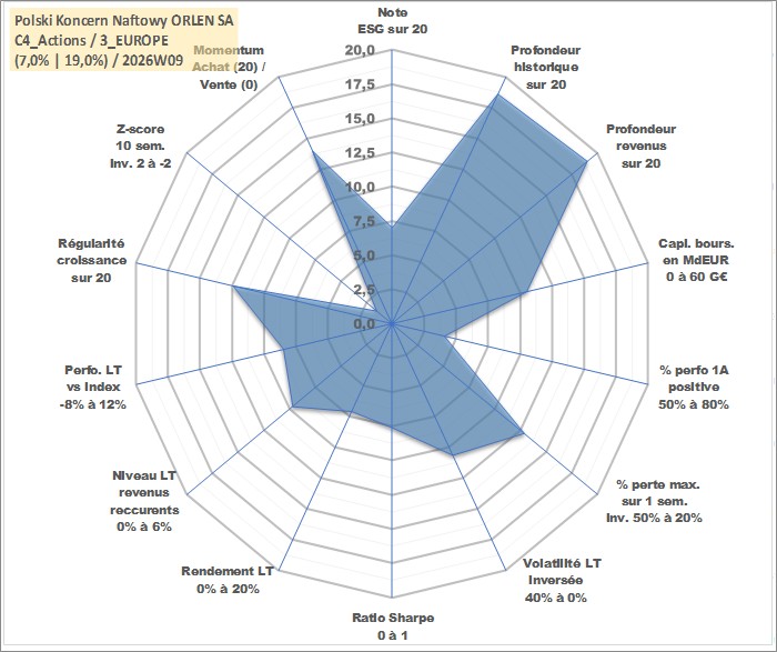 Site dédié aux investisseursPage dédiée sur site financeAnalyse des valorisations hebdomadaires de l'action Polski Koncern Naftowy ORLEN SA. Cet actif est cote en PLN. Les valorisations sont en contrevaleur EURO et couvrent les semaines 1999W47 a 2026W09. Les revenus de cet actif financier sont pris en compte depuis la semaine 2000W22. La note globale ESG de cet actif est estimee a 7.0 (apres rebasage entre 0 et 20).