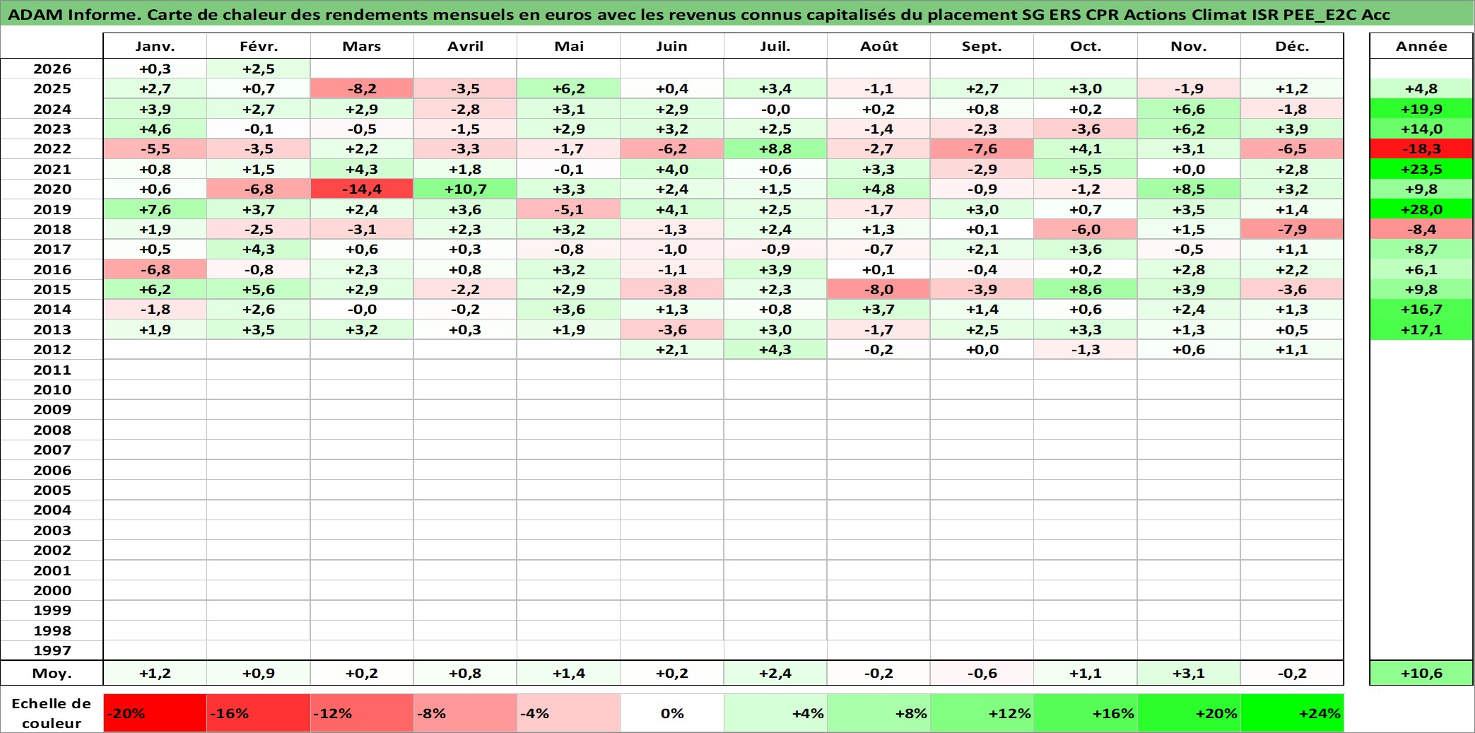 Site dédié aux investisseursPage dédiée sur site financeAnalyse des valorisations hebdomadaires du fonds SG ERS CPR Actions Climat ISR PEE_E2C Acc. Cet actif est cote en EUR. Les valorisations couvrent les semaines 2012W21 a 2026W09. Les revenus de cet actif financier sont pris en compte depuis la semaine 2012W21. La note ESG de cet actif n'est pas connue.