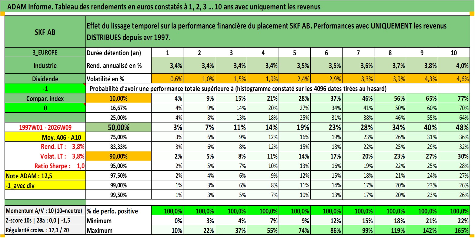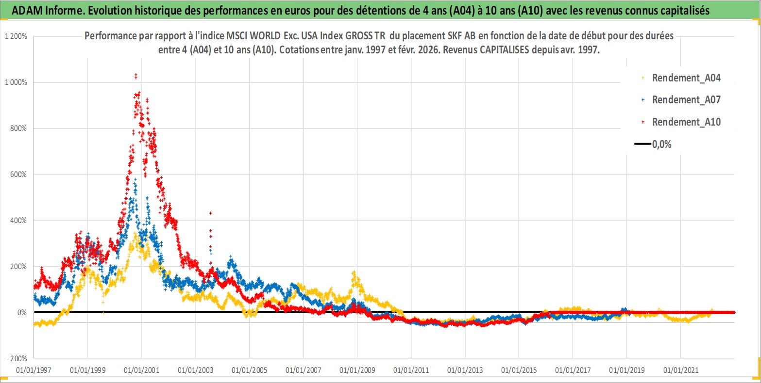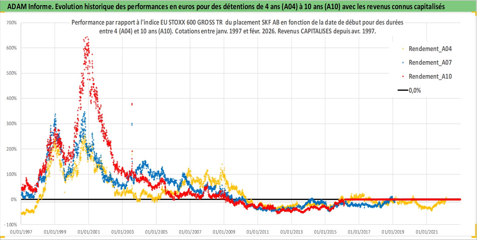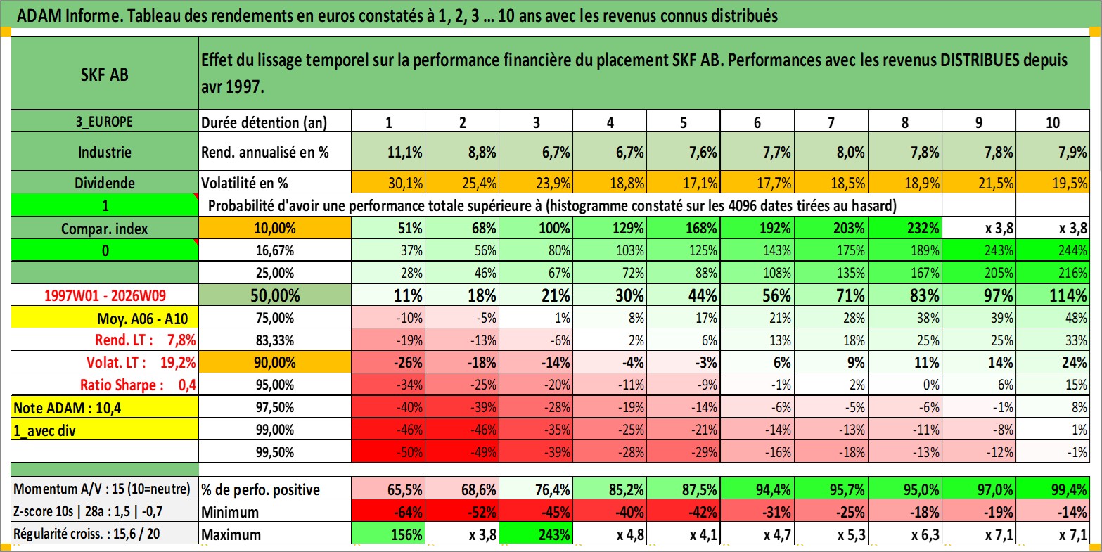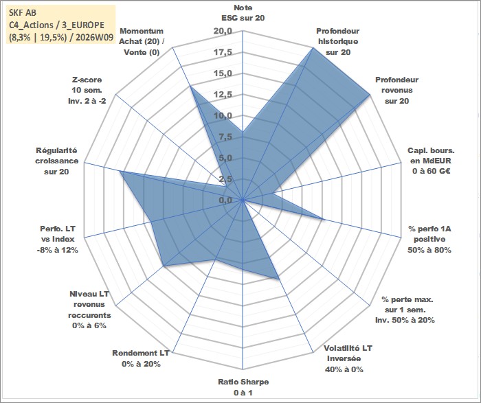 Site dédié aux investisseursPage dédiée sur site financeAnalyse des valorisations hebdomadaires de l'action SKF AB. Cet actif est cote en SEK. Les valorisations sont en contrevaleur EURO et couvrent les semaines 1997W01 a 2026W09. Les revenus de cet actif financier sont pris en compte depuis la semaine 1997W16. La note globale ESG de cet actif est estimee a 8.0 (apres rebasage entre 0 et 20).