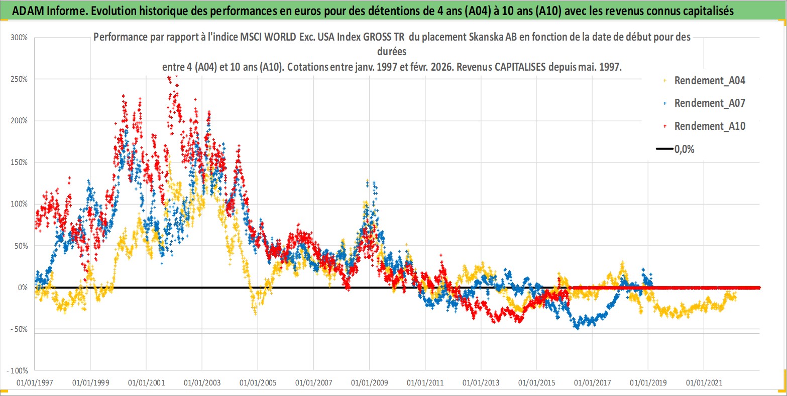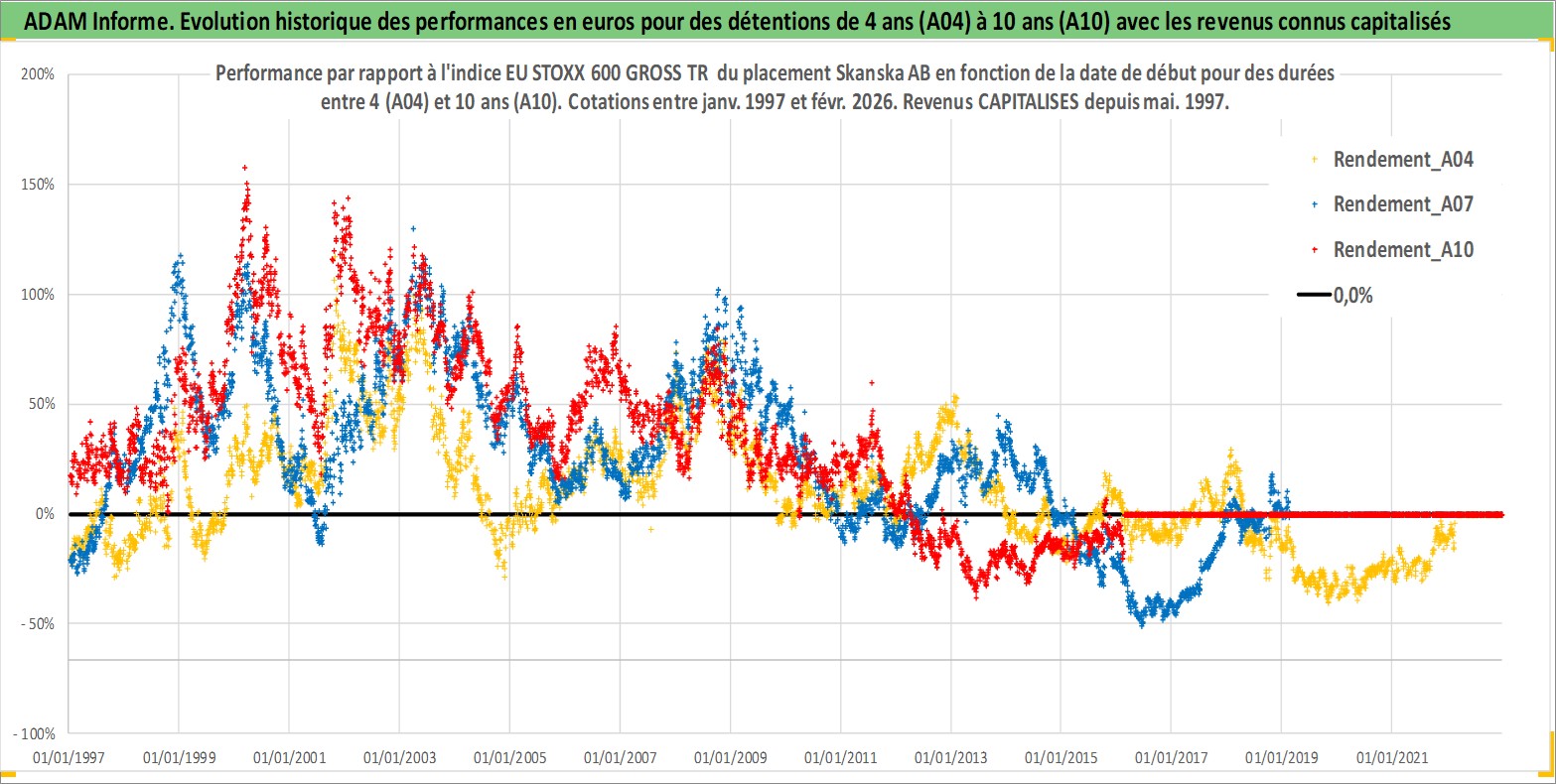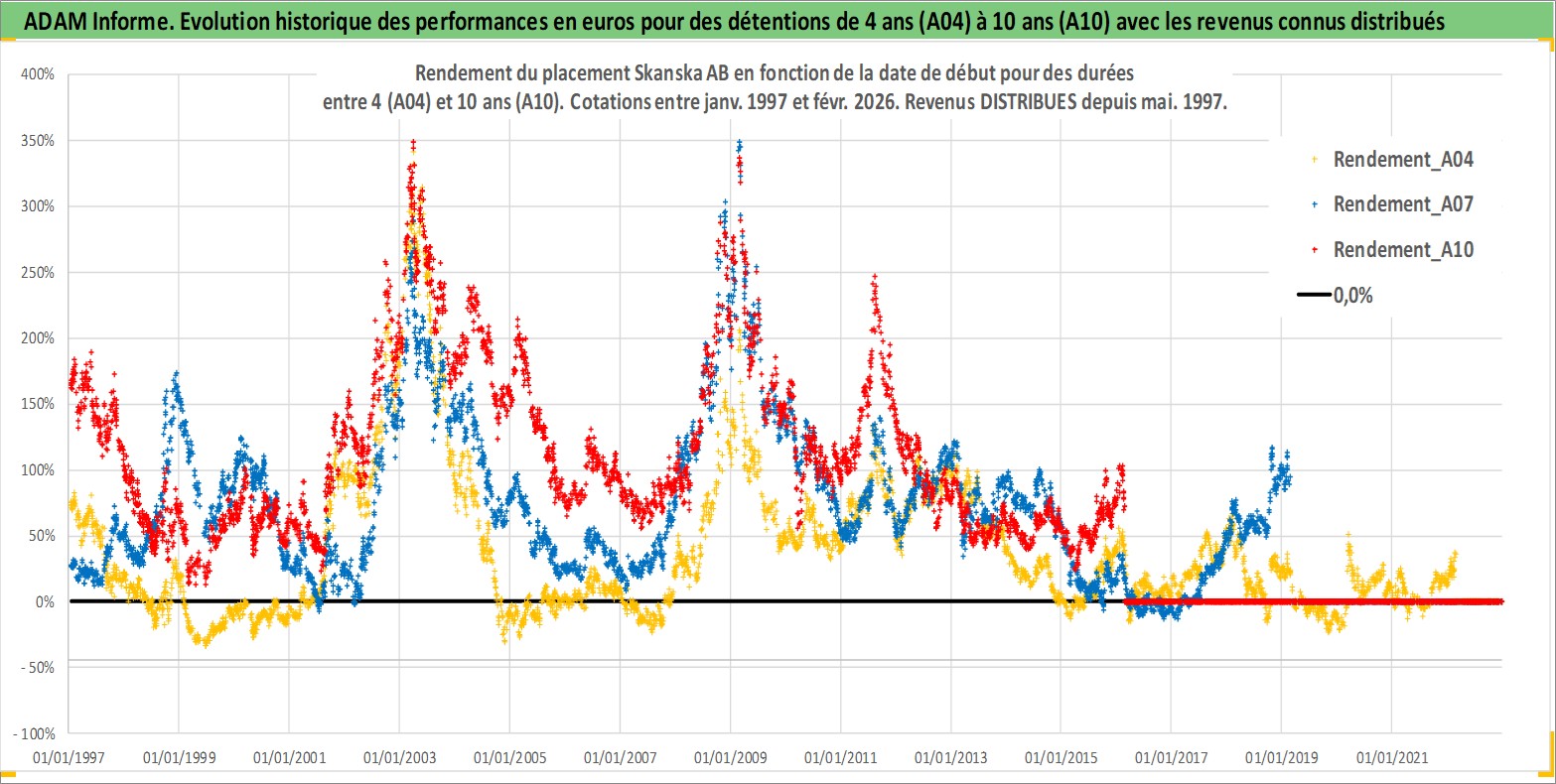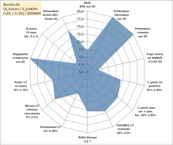 Site dédié aux investisseursPage dédiée sur site financeAnalyse des valorisations hebdomadaires de l'action Skanska AB. Cet actif est cote en SEK. Les valorisations sont en contrevaleur EURO et couvrent les semaines 1997W01 a 2026W09. Les revenus de cet actif financier sont pris en compte depuis la semaine 1997W19. La note globale ESG de cet actif est estimee a 7.0 (apres rebasage entre 0 et 20).