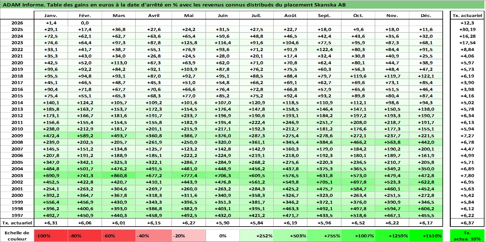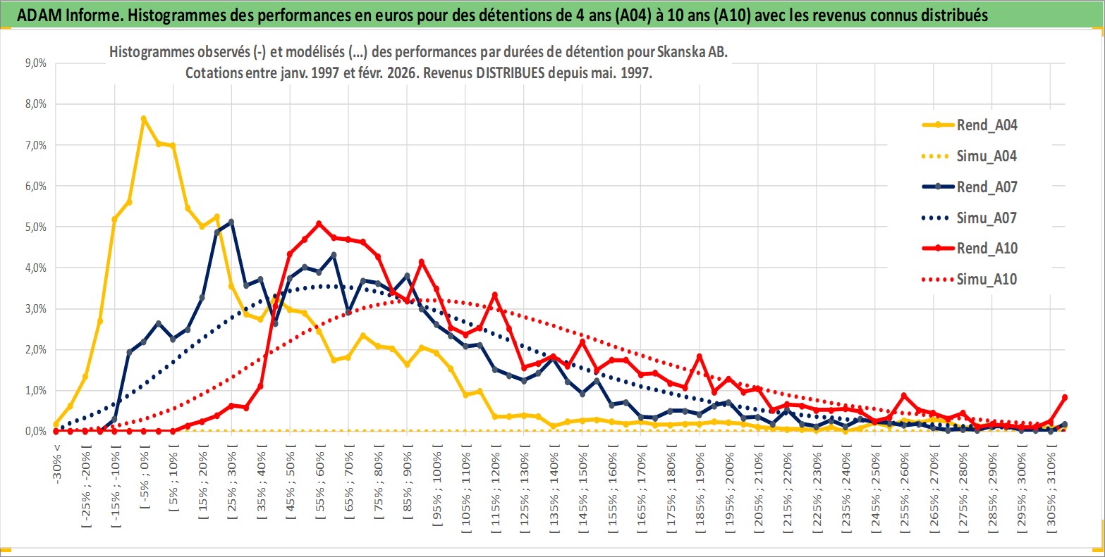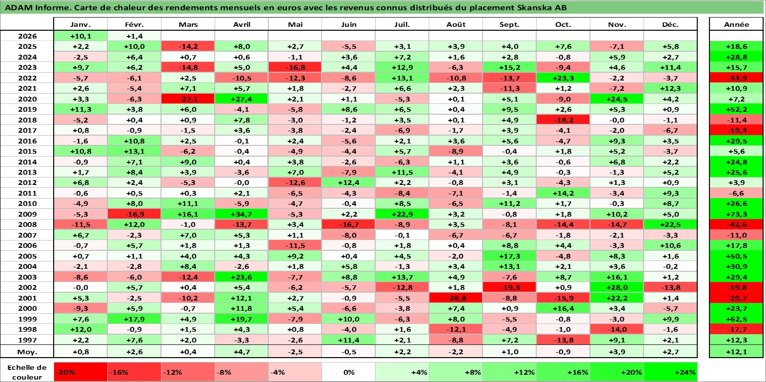 Site dédié aux investisseursPage dédiée sur site financeAnalyse des valorisations hebdomadaires de l'action Skanska AB. Cet actif est cote en SEK. Les valorisations sont en contrevaleur EURO et couvrent les semaines 1997W01 a 2026W09. Les revenus de cet actif financier sont pris en compte depuis la semaine 1997W19. La note globale ESG de cet actif est estimee a 7.0 (apres rebasage entre 0 et 20).