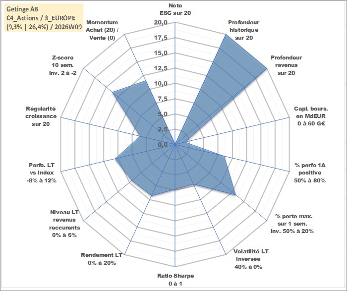 Site dédié aux investisseursPage dédiée sur site financeAnalyse des valorisations hebdomadaires de l'action Getinge AB. Cet actif est cote en SEK. Les valorisations sont en contrevaleur EURO et couvrent les semaines 1997W01 a 2026W09. Les revenus de cet actif financier sont pris en compte depuis la semaine 1997W18. La note ESG de cet actif n'est pas connue.